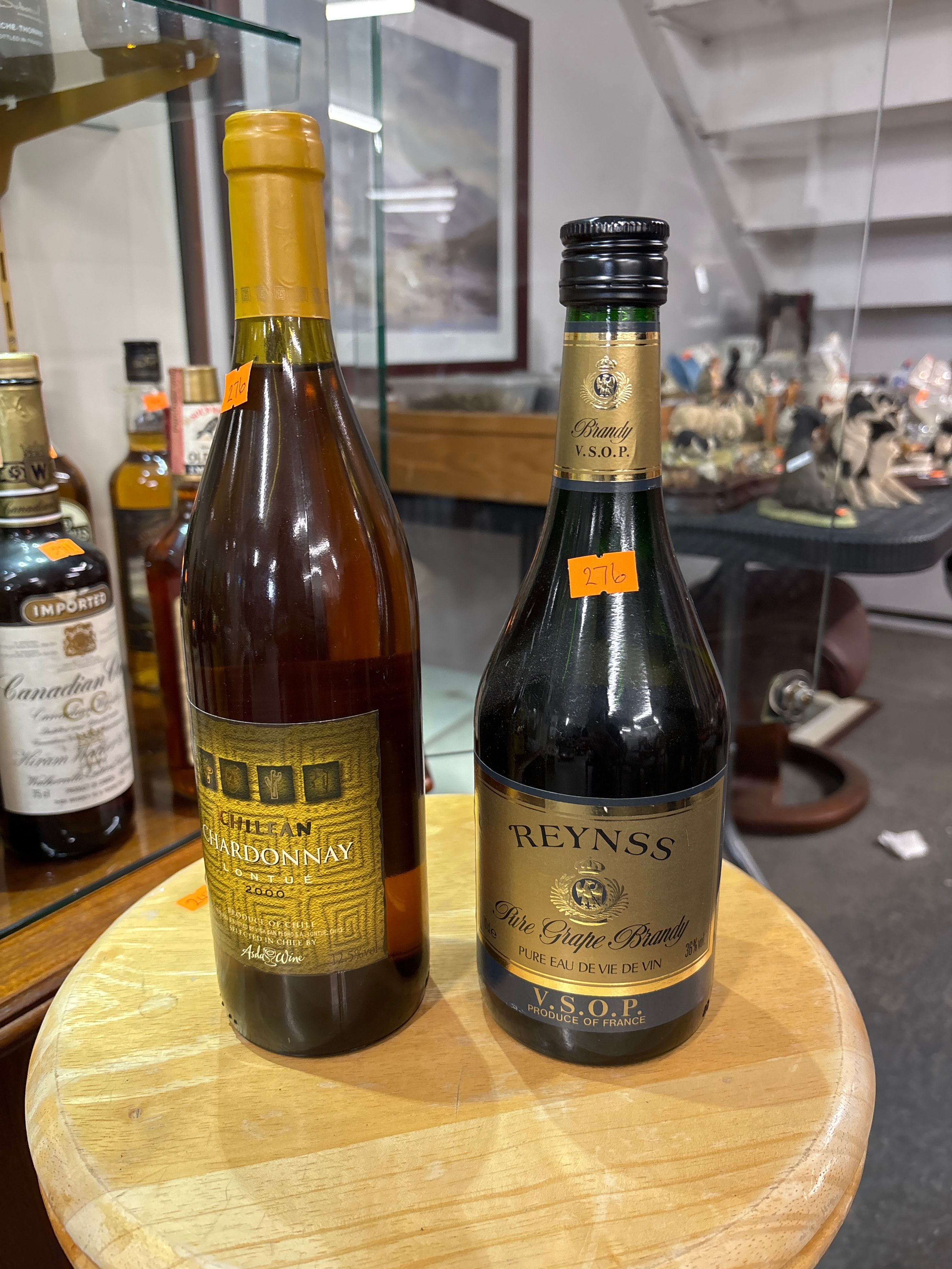 A Reynsse VSOP Pure Grape Brandy from France, housed in a dark green glass bottle with a black screw cap and a gold label displaying a crest with a double-headed eagle, inscribed “PURE EAU DE VIE DE VIN” and “36% vol.” The bottle appears full and sealed. Accompanied by a Montue Chilean Chardonnay wine, vintage 2000, presented in a brown glass bottle with a gold foil capsule and a textured gold label featuring the brand “MONTUE,” along with “PRODUCT OF CHILE” and “12.5% vol.” This bottle also appears full and sealed. Both bottles bear orange price tags marked “276.”