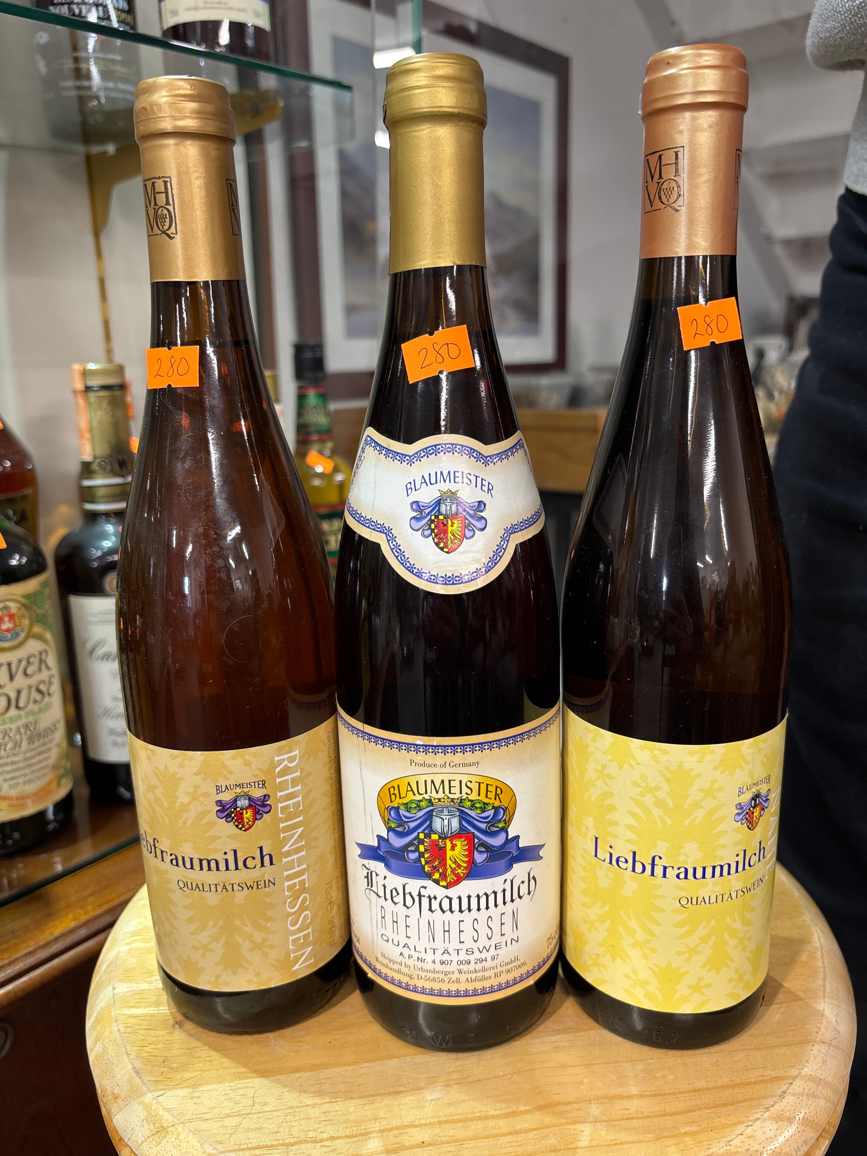 Three bottles of German Liebfraumilch Qualitätswein, branded “BLAUMEISTER”. Each dark brown glass bottle features a gold-colored foil capsule, sealed around the neck and marked with an “MH VQ” logo incorporating grapes. The paper labels prominently display “BLAUMEISTER”, “Liebfraumilch” (Our Lady’s Milk), “RHEINHESSEN” (a German wine region), and “QUALITÄTSWEIN” (Quality Wine). The central bottle’s label additionally specifies “Produce of Germany” and an “A.P.Nr.” (Amtliche Prüfnummer/Official Test Number) ending in “97”, suggesting a 1997 vintage or approval year, with “Urbanberger Weinkellerei GmbH” identified as the “Weinhandlung” (wine merchant) and “Abfüller” (bottler).