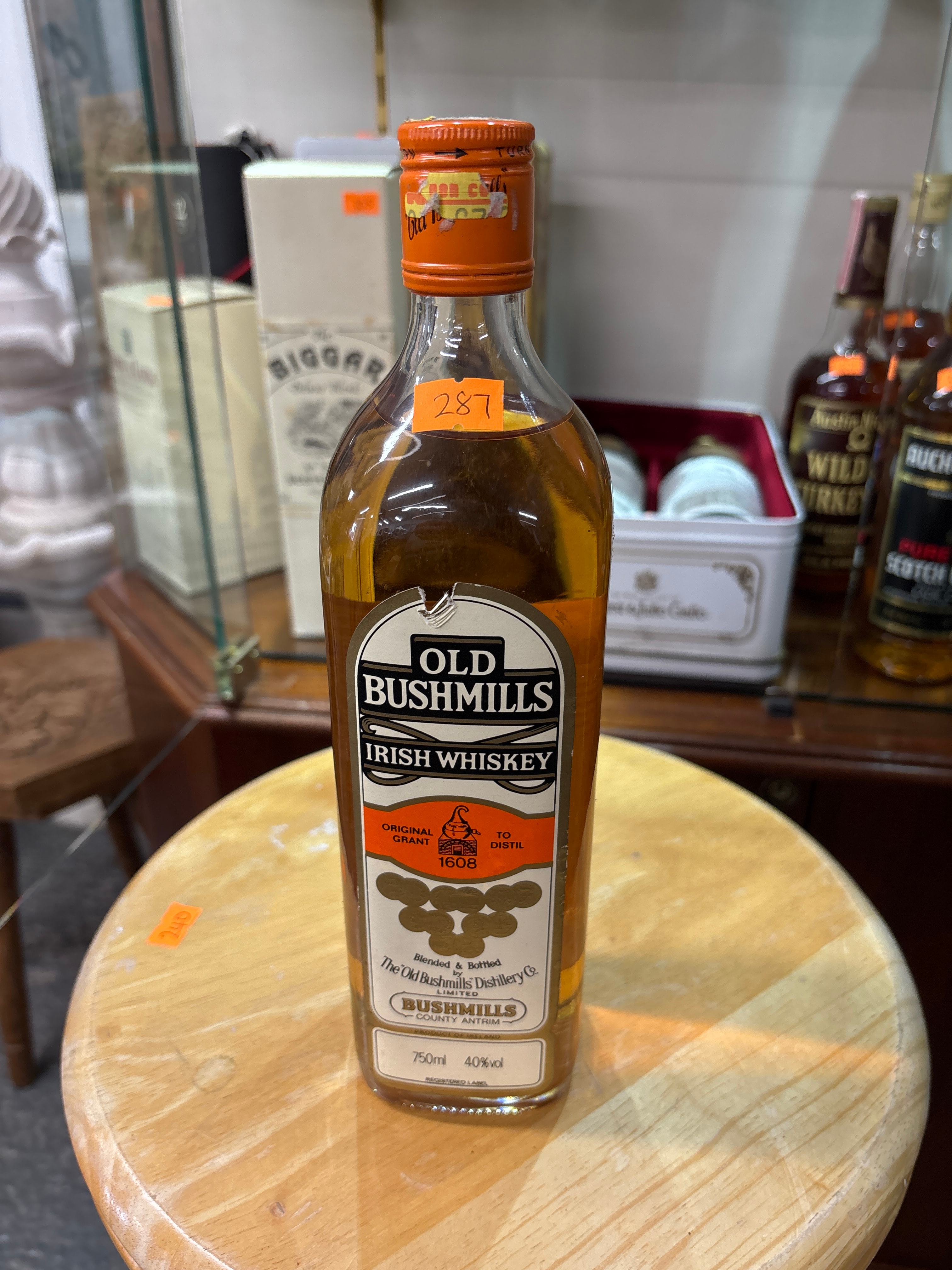 An Old Bushmills Irish Whiskey, commonly referred to as the ‘White Label’ or ‘Old Version Vintage’ standard blend. The clear glass bottle features a prominent cream, black, and orange paper label. The label includes text indicating “ORIGINAL GRANT TO DISTIL 1608” alongside an illustration of a pot still, “Blended & Bottled by The Old Bushmills Distillery Co. Limited,” “BUSHMILLS COUNTY ANTRIM,” and “PRODUCT OF IRELAND.” The bottle is sealed with an orange metal screw cap that reads “TURN” with an arrow. A partially torn yellow sticker with some illegible text is affixed to the cap, and an orange handwritten sticker with “287” is on the bottle neck. The bottle appears full with its amber-colored contents.