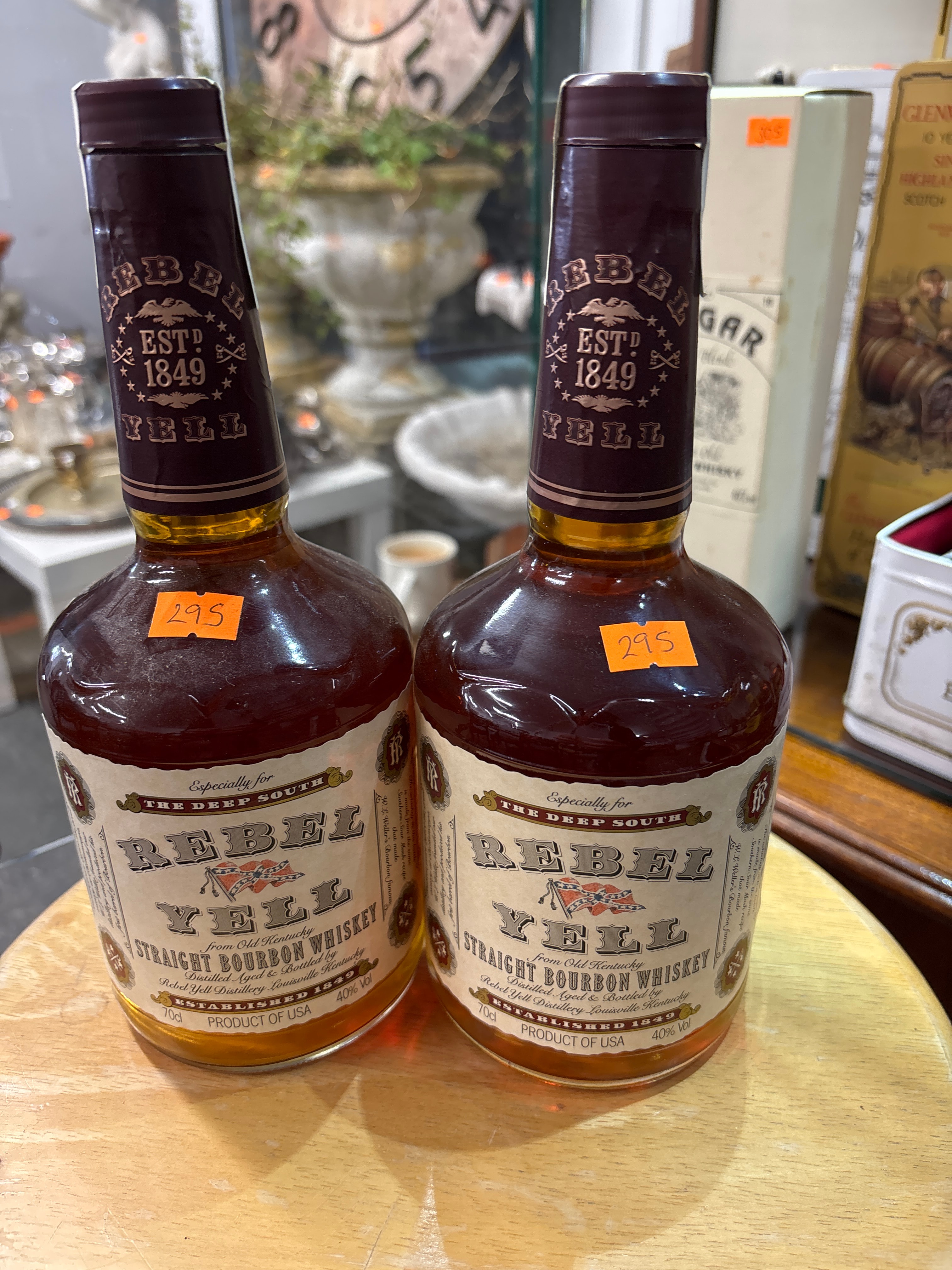 A pair of identical glass bottles of Rebel Yell Kentucky Straight Bourbon Whisky, believed to be bottled in the 1990s. Each bottle features a main paper label prominently displaying “REBEL YELL,” “STRAIGHT BOURBON WHISKEY,” “from Old Kentucky,” “ESTABLISHED 1849,” “40% Vol,” “70cl,” and “PRODUCT OF USA.” The label also includes the phrase “Especially for THE DEEP SOUTH” and an image incorporating a Confederate battle flag. Smaller text on the side of the label mentions “W.L. Weller’s Bourbon.” The neck wrap on each bottle reiterates “REBEL YELL” and “ESTD 1849” with an eagle emblem. Both bottles appear full and sealed.