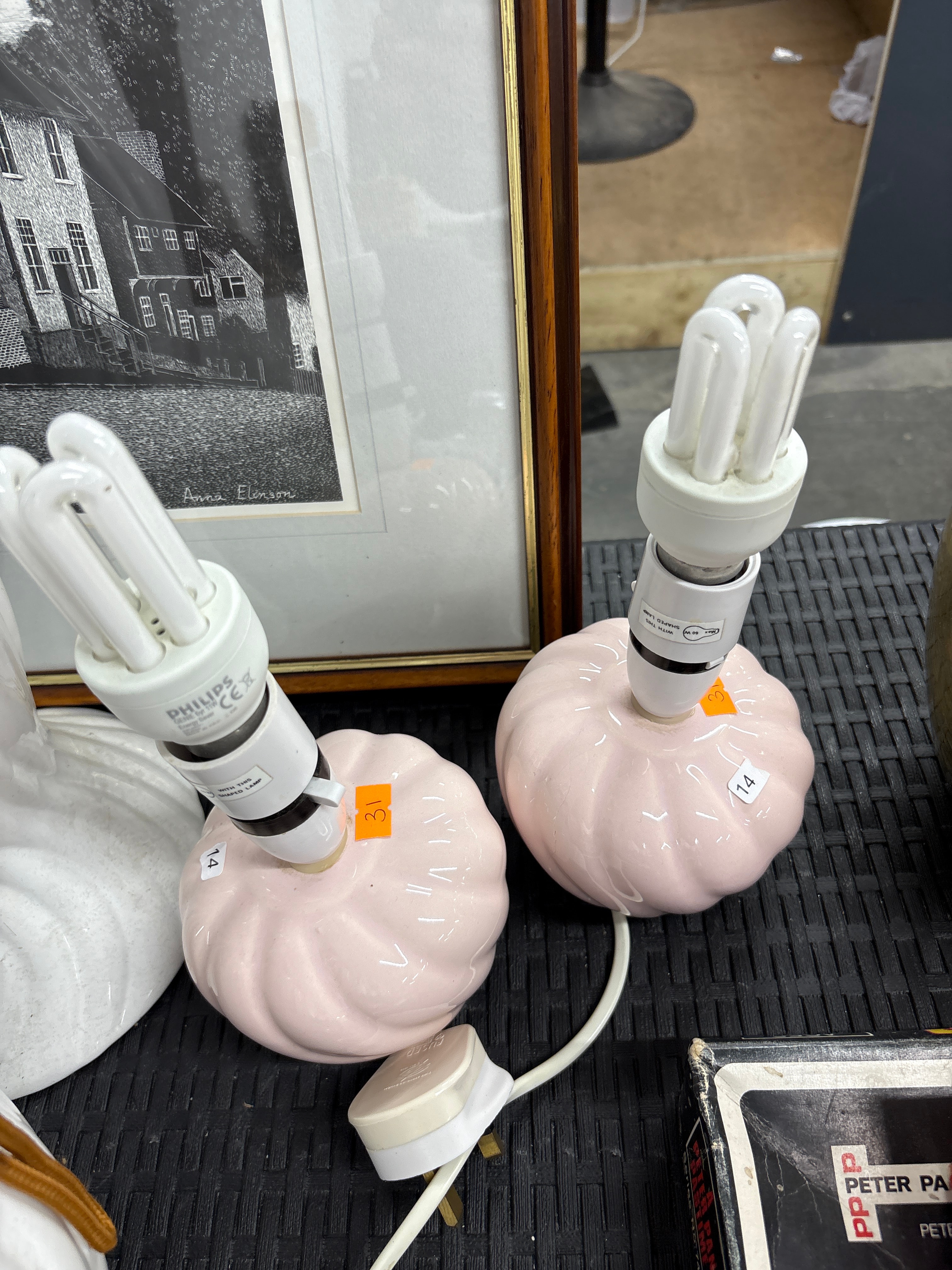 A pair of contemporary-style table lamps, each featuring a pink, ribbed, glazed ceramic or porcelain pumpkin-shaped base. Each lamp is fitted with a Philips brand compact fluorescent light (CFL) bulb, marked ‘Energy Saver’ and ‘Max 60 W’. One lamp base bears an orange label with ’31’ and both have white labels numbered ’14’. Each lamp is equipped with a standard UK 3-pin ‘FUSED’ plug.