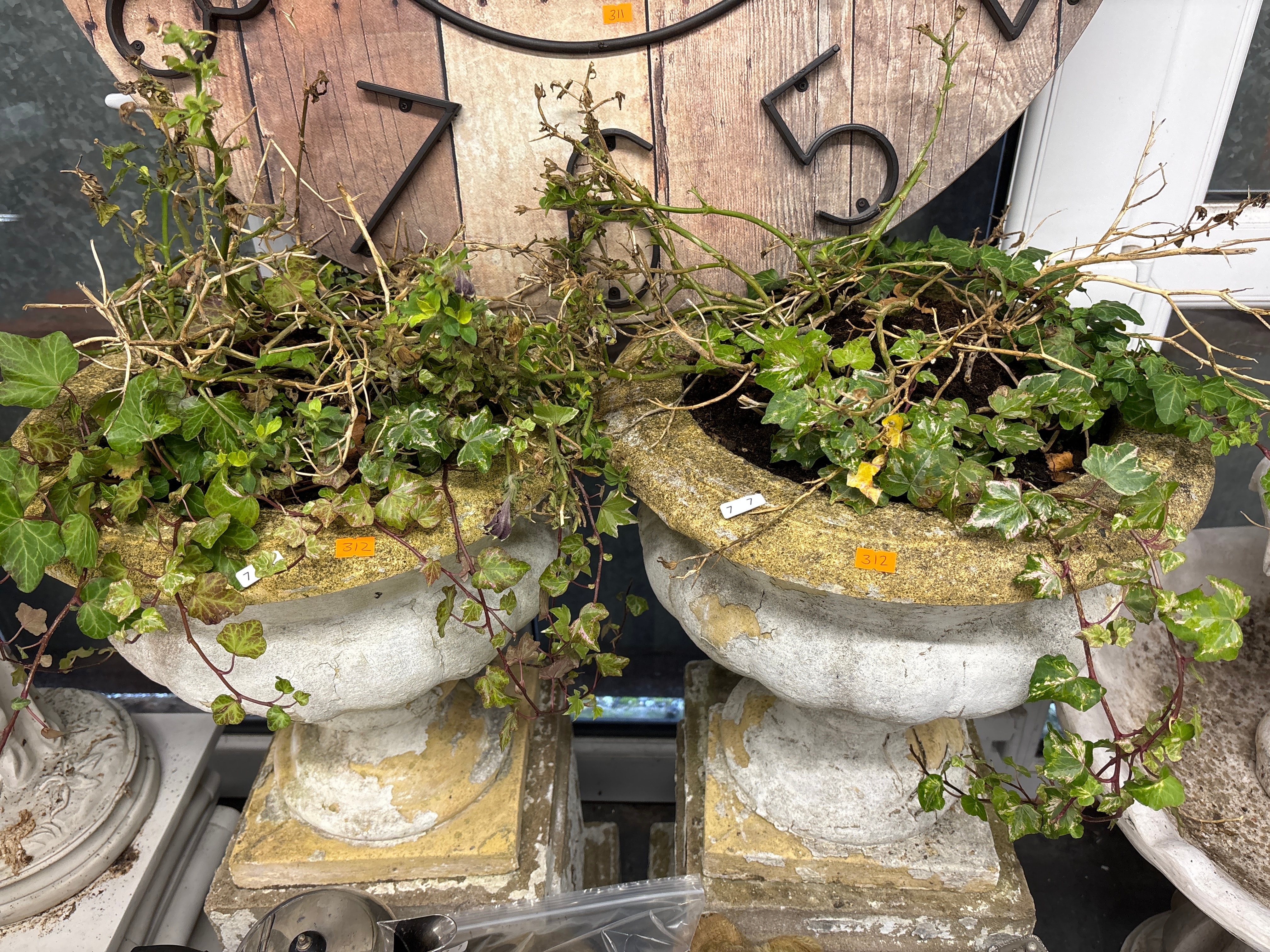 A pair of neo-classical style garden planters, crafted from concrete or cast stone. Each planter features a rounded bowl atop a square pedestal base. They contain soil mixed with variegated ivy and other green foliage. Visible markings include orange rectangular tags with the number ‘312’ on both planters, and a white rectangular tag with ‘7 7’ on the right planter’s rim. A large, rustic-style wall clock with visible black metal numbers ‘7’ and ‘5’ and an orange ‘311’ tag is partially seen in the background.