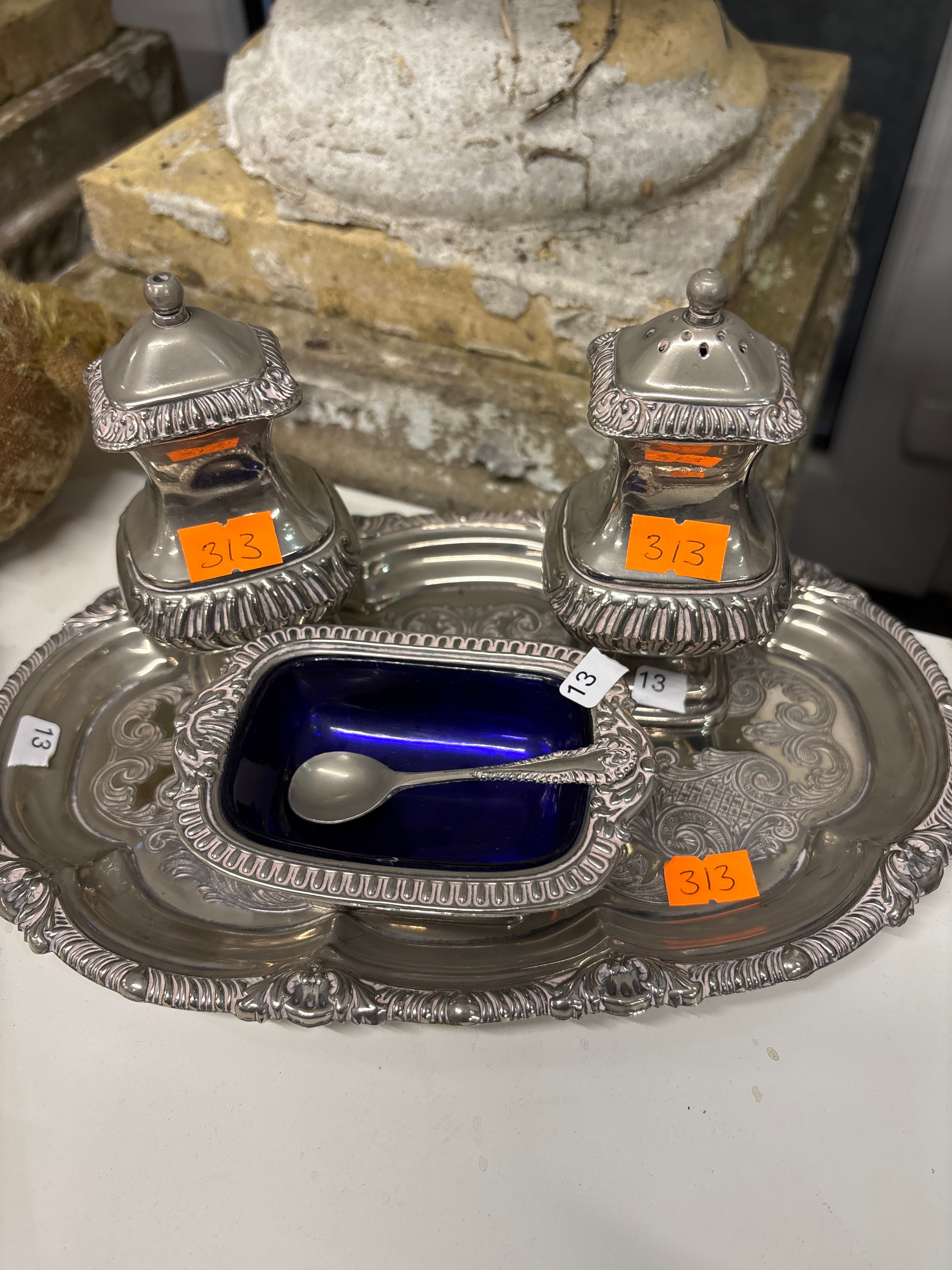 A late 19th or early 20th-century silver-colored metal condiment set, comprising an oval serving tray, two lidded shakers, a central rectangular holder with a deep cobalt blue glass liner, and a small spoon. The set exhibits a decorative style with rococo-inspired scrolled and foliate motifs, fluting, and beaded edges. The metal components are likely electro-plated nickel silver (EPNS).
