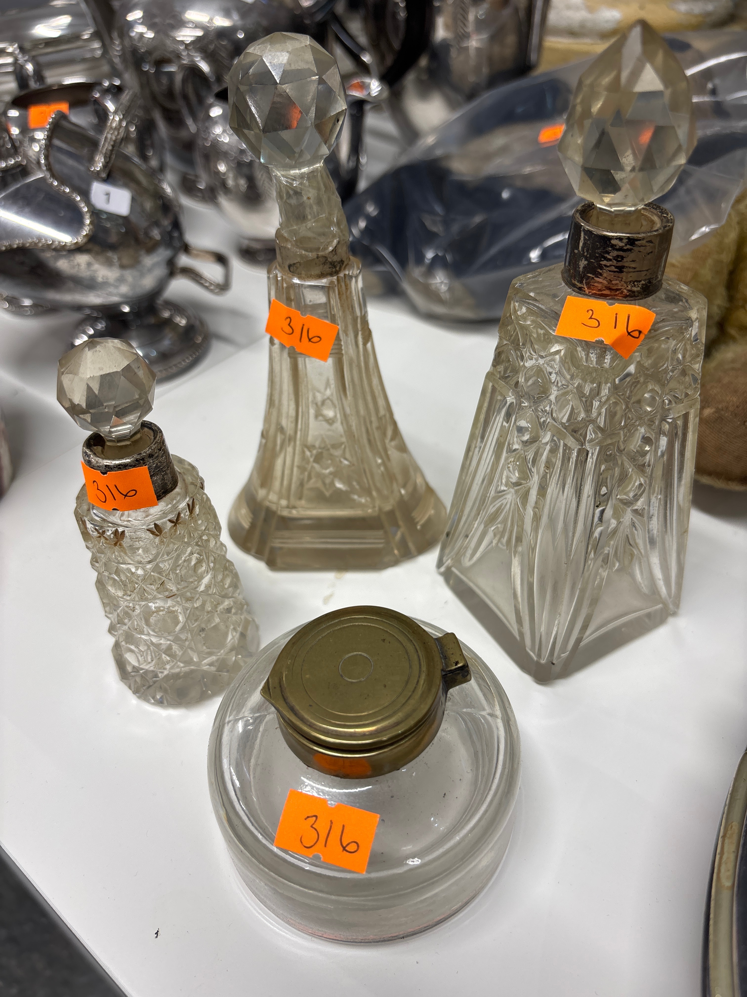 This lot consists of three clear glass decorative bottles, likely perfume flacons, each with a faceted glass stopper, and one clear glass inkwell with a hinged brass or bronze lid. The bottles feature various molded or cut geometric patterns, including fluted and diamond-faceted designs. The stoppers are multi-faceted, presenting a crystalline appearance. The inkwell has a simple, circular glass base complemented by a tarnished metallic lid. Each visible piece is marked with an orange sticker bearing the handwritten inventory number “316.”