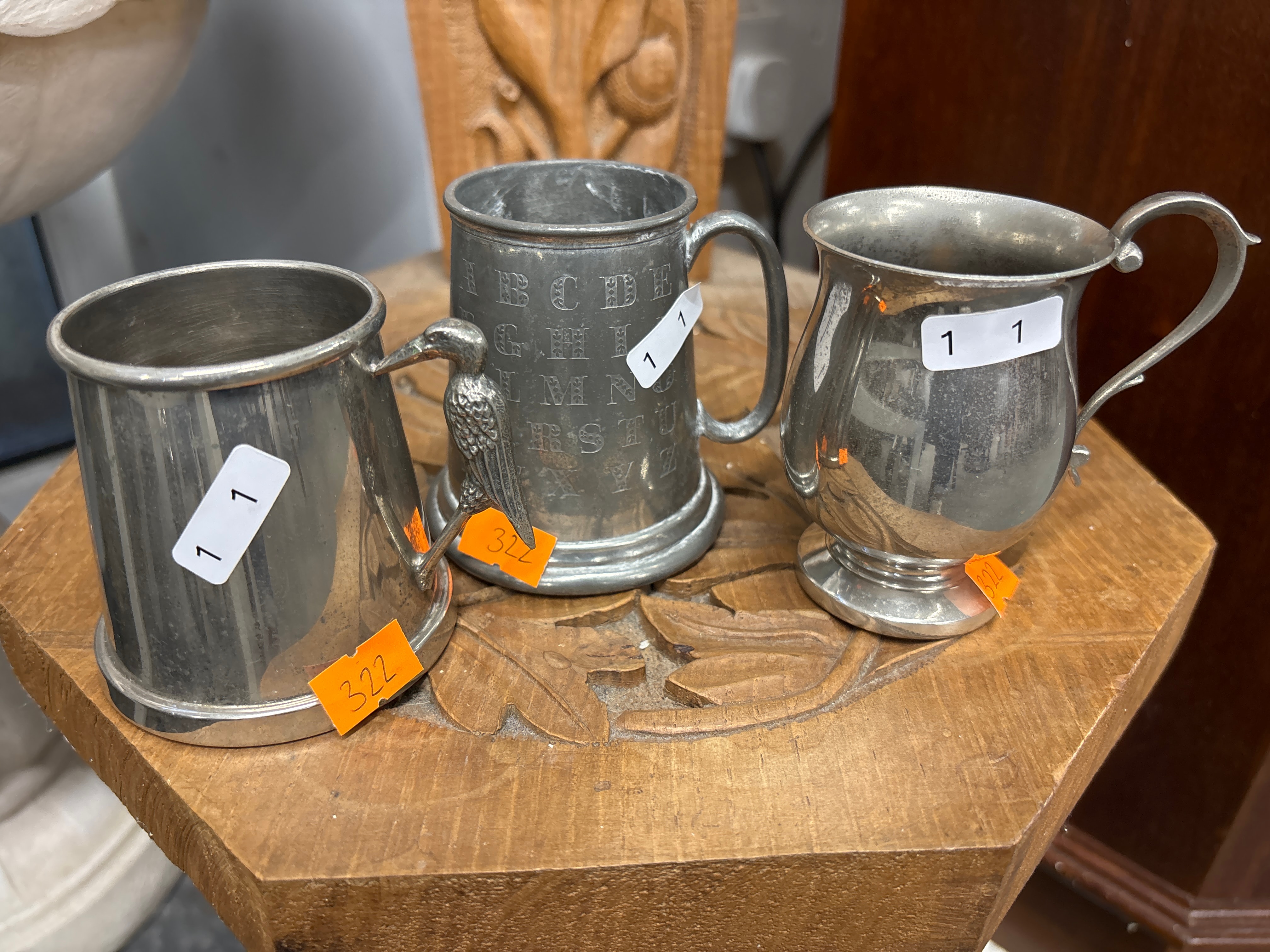 A group of three metal drinking vessels. The leftmost is a cylindrical tankard with a relatively smooth, lightly patinated surface, likely pewter. The central vessel is a visibly aged tankard, also likely pewter, featuring an embossed alphabet (A-Z) around its body and a unique figural bird forming part of its handle. The third item, on the right, is a footed mug or beaker with a more polished and somewhat brighter appearance, consistent with silver plate. All three items have white adhesive labels marked “1 1,” while the left and central pieces also bear orange adhesive labels with “322.”
