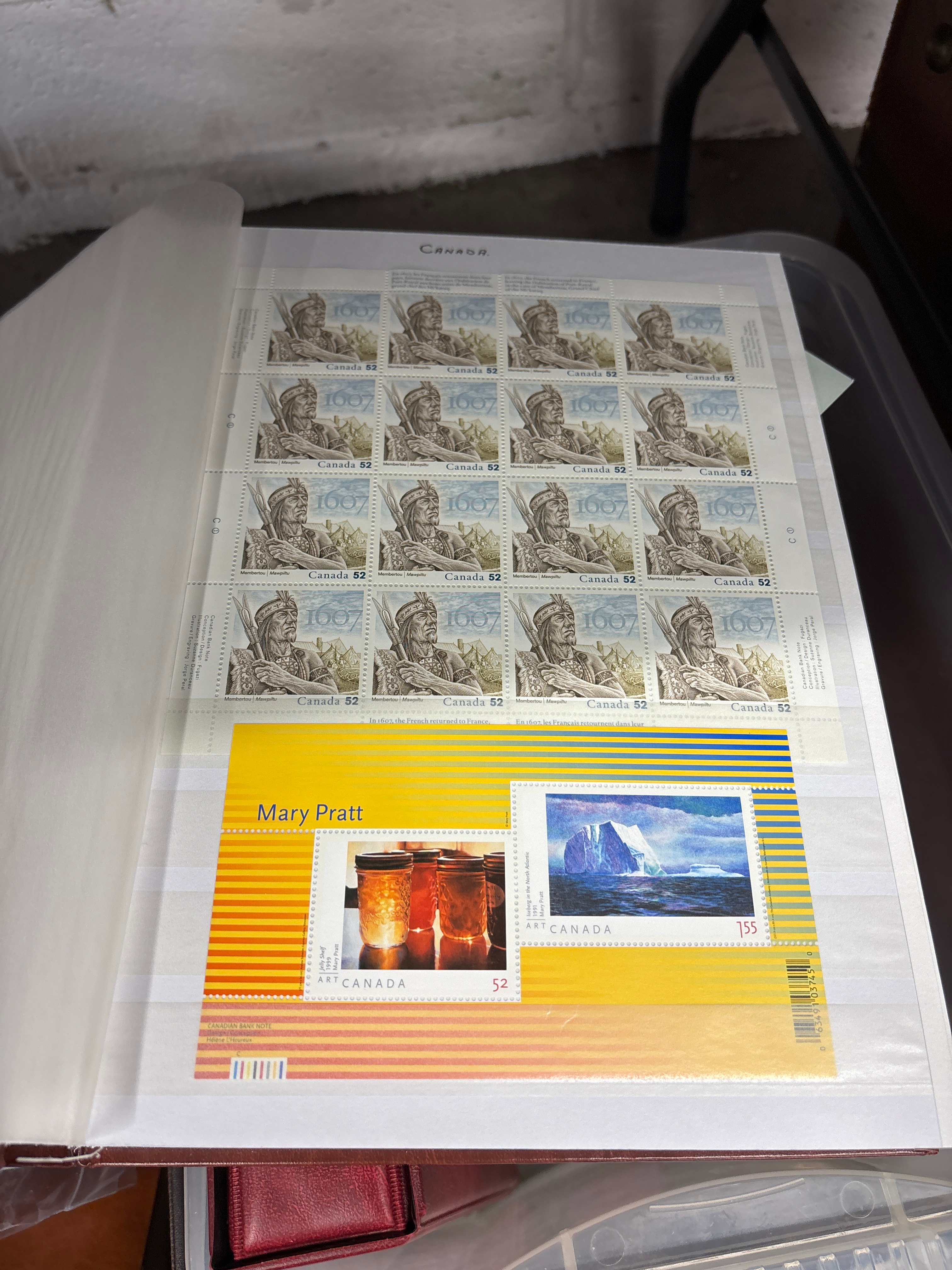 A philatelic collection comprising Canadian postage stamps, souvenir sheets, and First Day Covers. The collection is housed in multiple red faux leather binders, several prominently marked “ANSON” on their spines, and an additional clear storage box. Visible contents include sheets commemorating “1667 Intendant de la Nouvelle-France” with “CANADA 52” denominations, a “Mary Pratt” art series sheet also at “CANADA 52”, an “Iceberg” landscape sheet marked “CANADA 155”, and various First Day Covers, such as a “Mythical Creatures” series and one noting “British Columbia” and “Royal Mail First Day Cover”. A partially visible handwritten note reads “STAMPS ARE A GIFT TO THE SAMUEL K.-“.