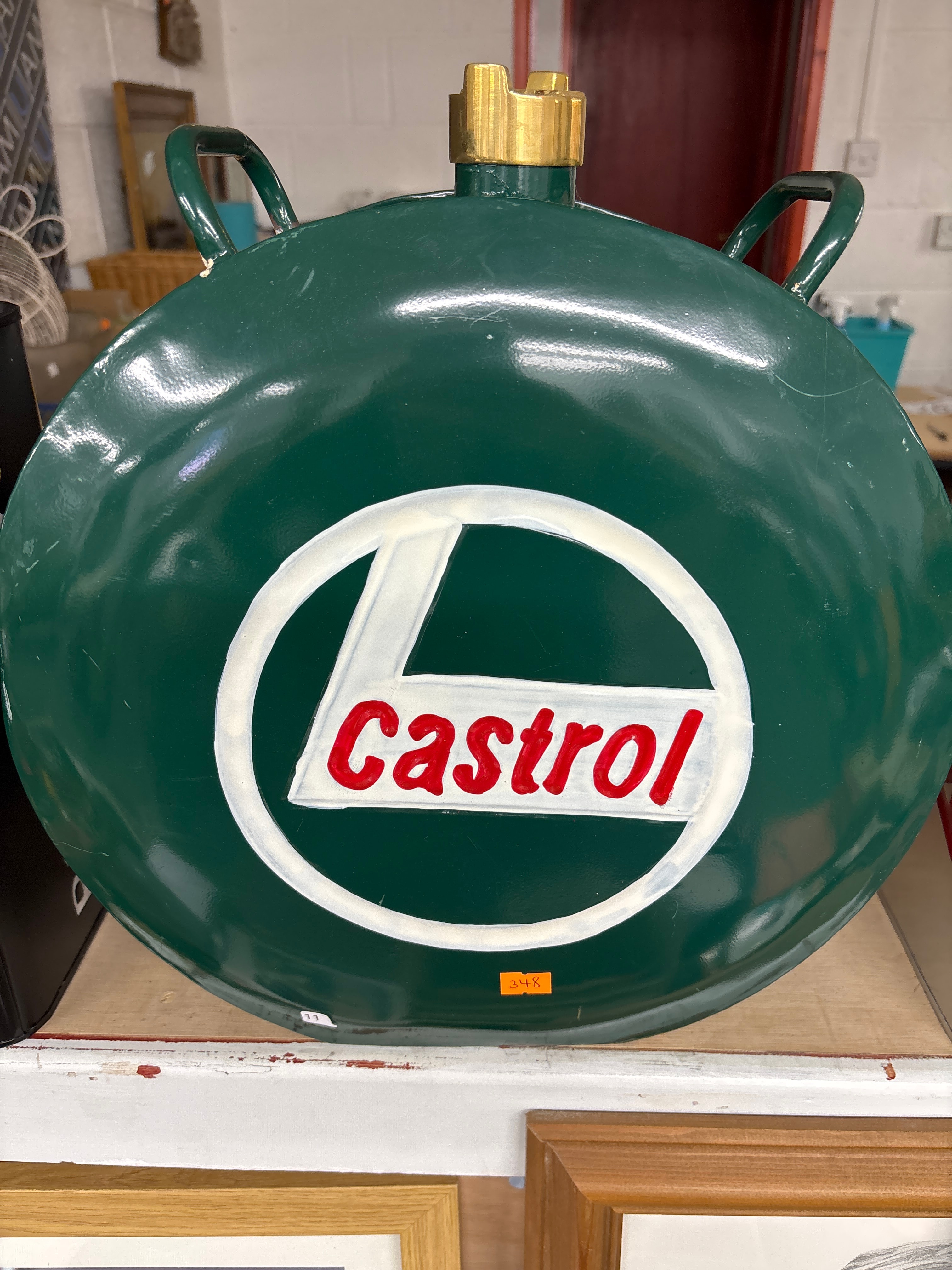 A vintage-style Castrol fuel can. This large, circular, deep green enameled or painted metal container features two curved metal carrying handles on the top, symmetrically placed, and a prominent brass-toned metal cap centrally located. The front displays a stylized ‘Castrol’ logo: a white circular emblem with an internal white ‘L’ shape (part of the older Castrol logo) overlaying a red ‘Castrol’ text.