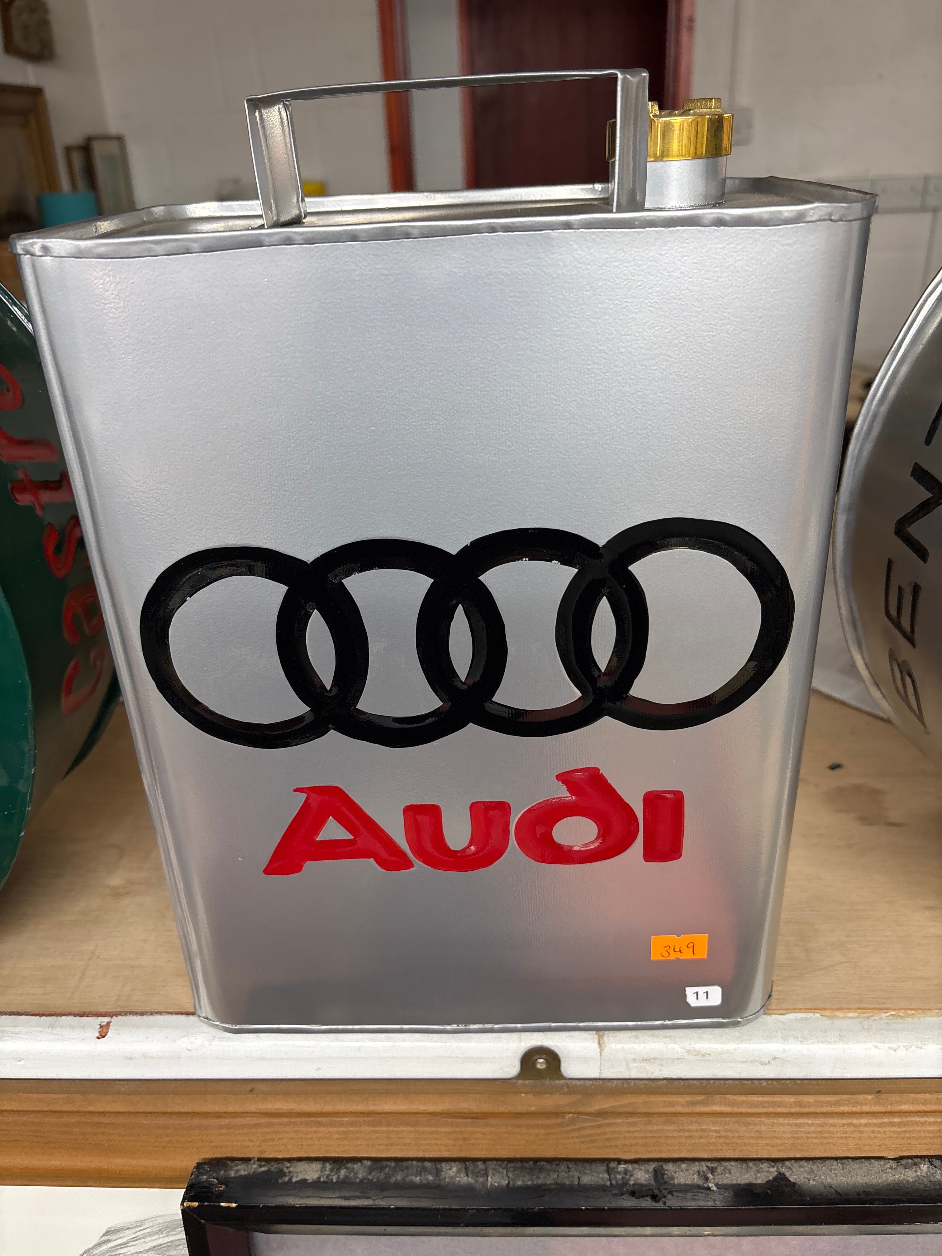 A decorative Audi petrol can, fashioned as a large, silver-colored rectangular container resembling an oversized automotive fluid can. It is constructed from textured metal, possibly aluminum or steel, and features a prominent, textured metallic surface with a flat front panel. The can includes a matching silver metallic handle and a gold-colored metallic screw-top on one end. The front displays the iconic Audi logo, consisting of four black interlocking rings, above the word “Audi” rendered in raised, glossy red lettering. This item is a modern promotional display piece, likely from a contemporary period. “Audi” is a German brand name. An orange sticker marked “349” and a white sticker marked “11” are affixed to the lower right corner.