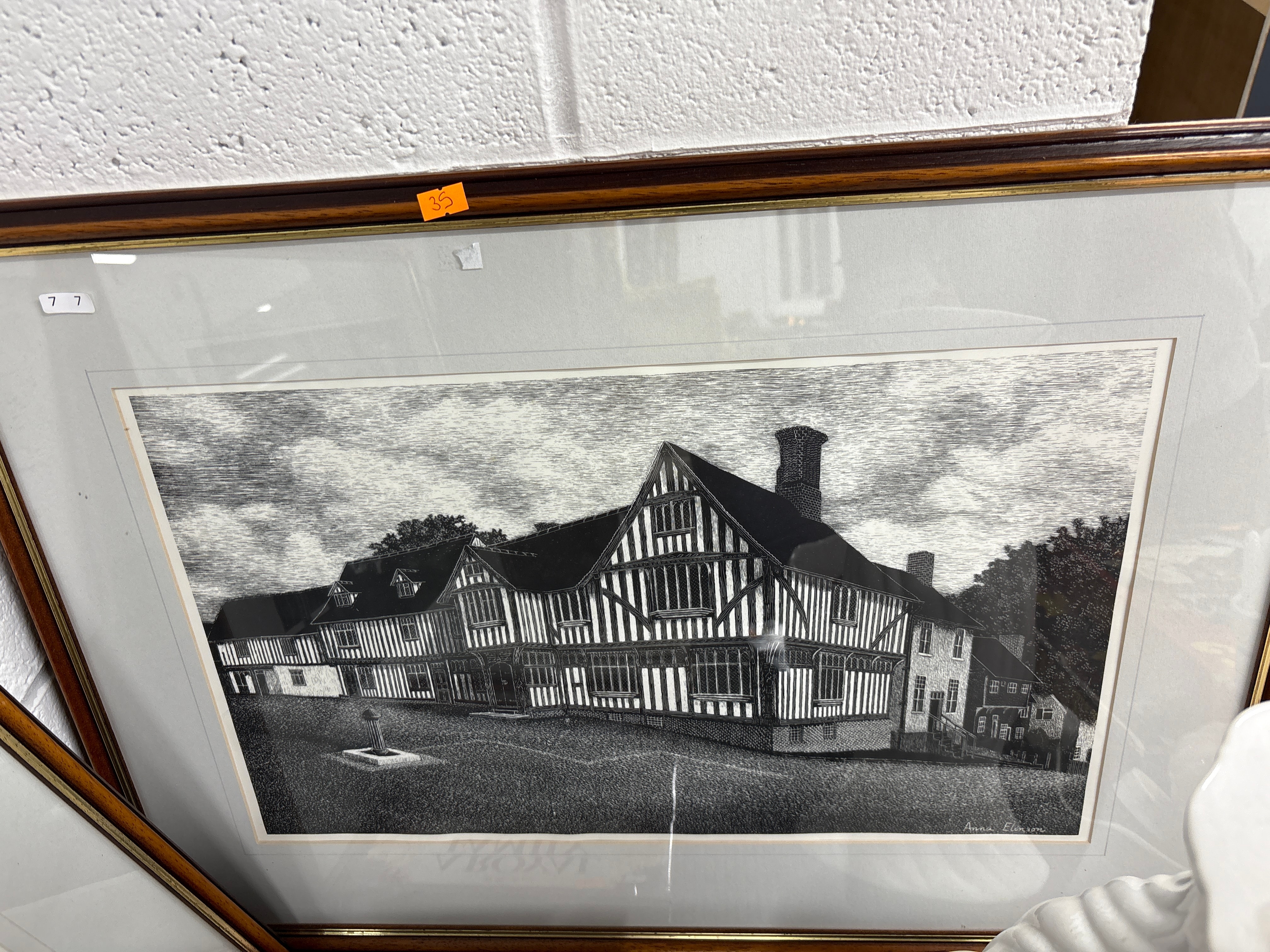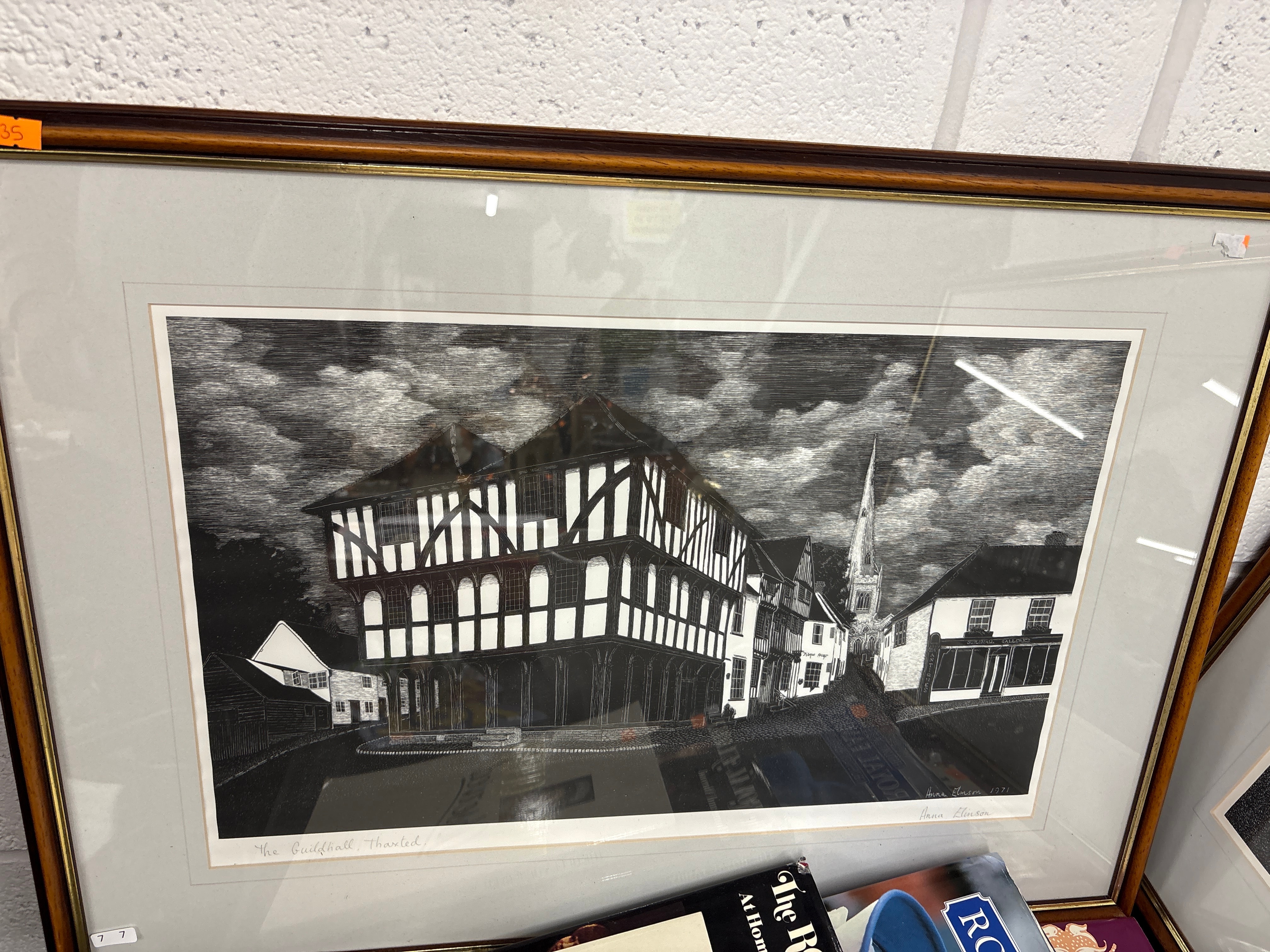 A pair of dry point etchings by Anna Elinson, executed in a detailed illustrative style utilizing heavy linework and stippling, depicting historic timber-framed architecture. The first print features a street scene identified by text as ‘The Guildhall, Thaxted,’ with a prominent multi-story building and a distant church spire. The second print depicts a large, gabled manor house or estate. Both prints are pencil signed ‘Anna Elinson’ in the lower right and are presented in matching dark wooden frames with light matting under glass. Both frames bear the number ’77’ in the bottom left.