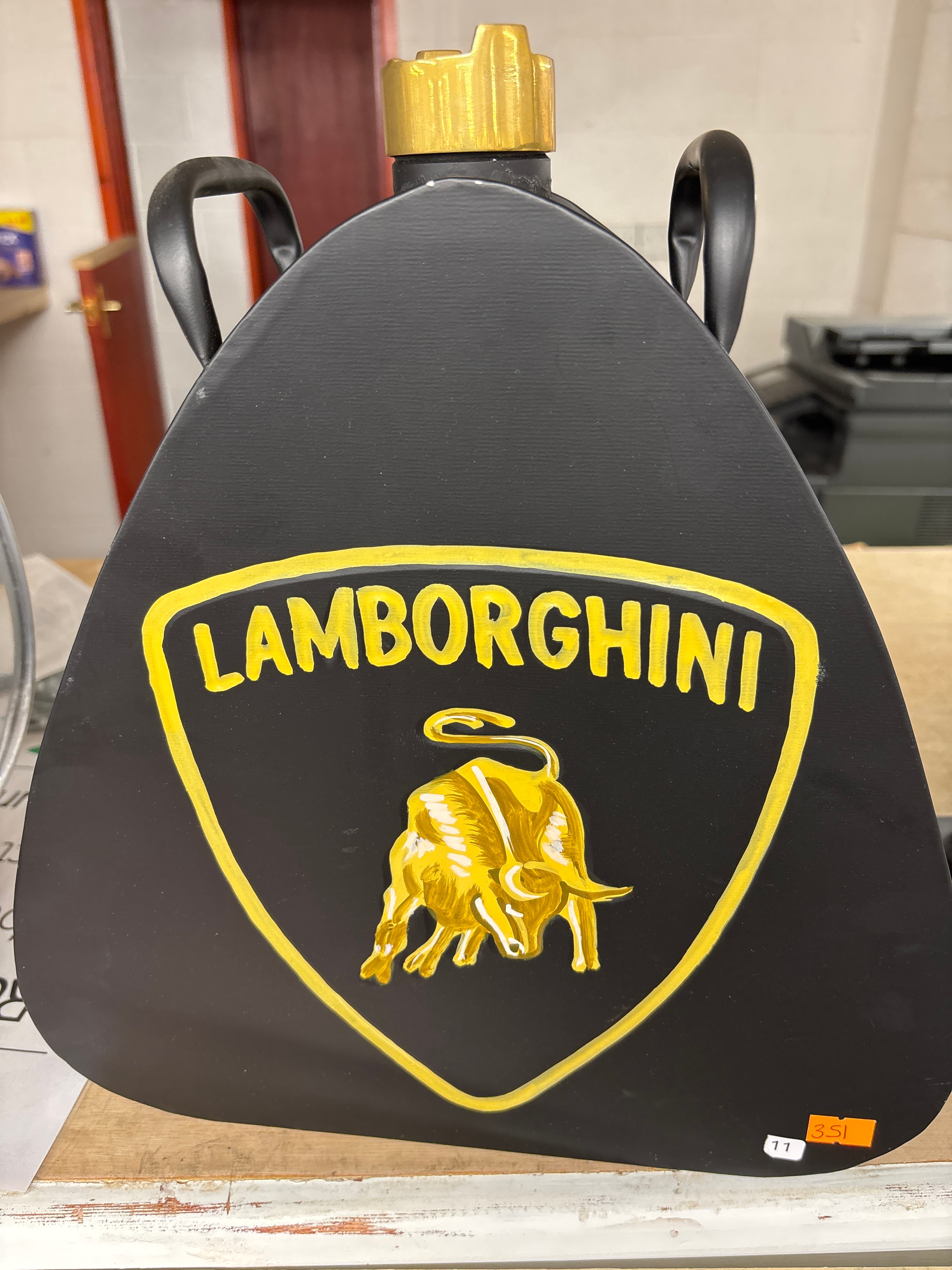 A Lamborghini branded gas can, featuring a matte black finish with a textured surface. The item is adorned with a gold-toned screw-top cap and two black U-shaped side handles. The face prominently displays the iconic yellow “LAMBORGHINI” text above a stylized charging bull emblem, all contained within a yellow shield-shaped border. The construction is likely metal or durable plastic.