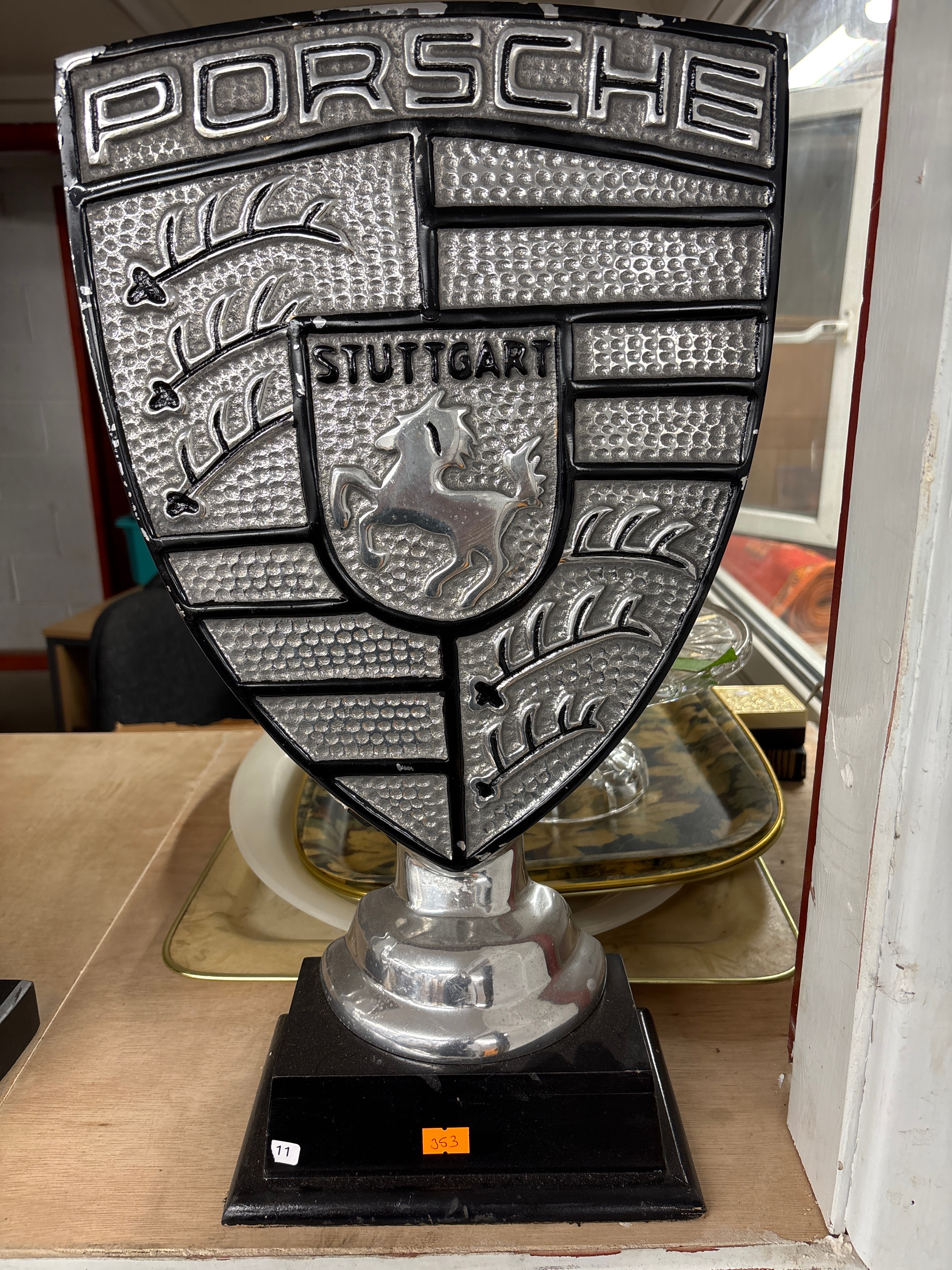 A decorative display featuring the iconic Porsche automotive emblem, constructed from silver-toned cast aluminium. The crest prominently displays “PORSCHE” across the top and “STUTTGART” above a rearing horse in the central shield, flanked by stylized antler motifs. The recessed areas of the crest are accented with black enamel or paint. The crest is mounted on a polished silver-toned metal column, which rests on a rectangular black base, likely of plastic or composite material. This item is consistent with a desk ornament or trophy.