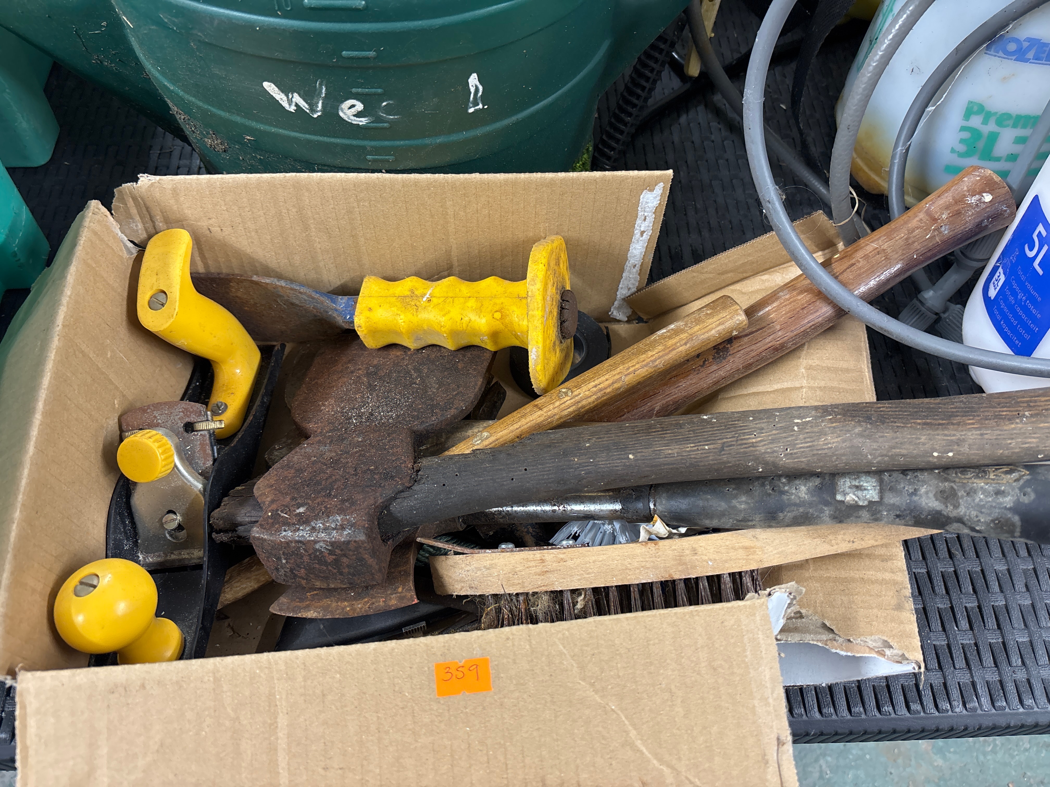 This lot comprises a collection of used hand tools, primarily made of metal and wood with some plastic components, presented in an open cardboard box. Visible items include a woodworking hand plane with a yellow plastic handle and knob, a heavily rusted axe head attached to a dark, aged wooden handle, a chisel-like tool featuring a yellow corrugated plastic handle, several additional wooden tool handles, and a partially visible wire brush. An orange sticker with “359” is present on the cardboard box.