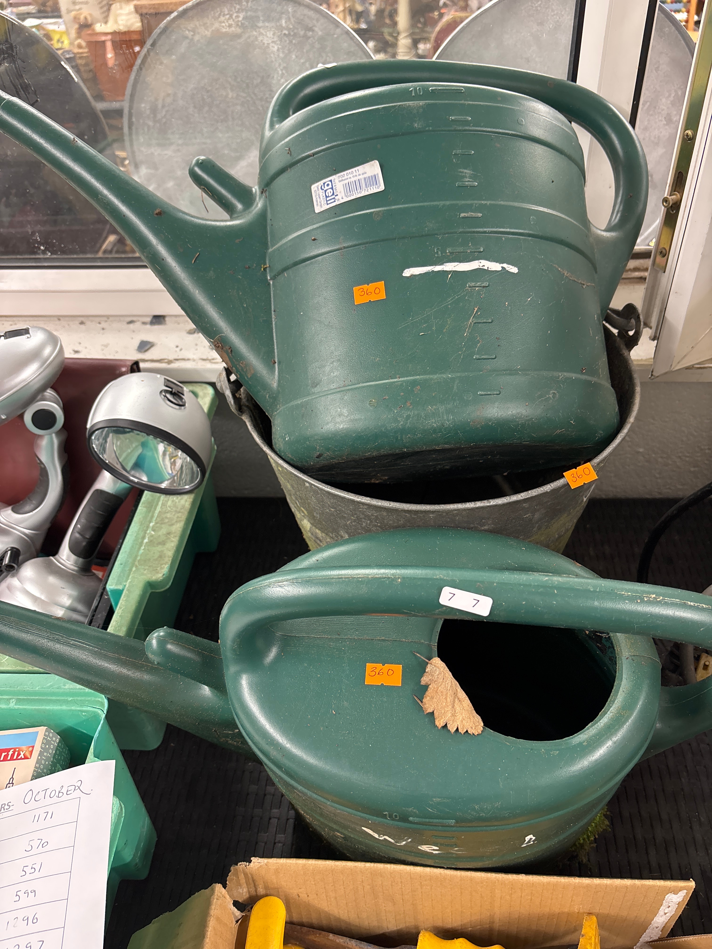 A pair of dark green plastic watering cans of modern, utilitarian design. The upper watering can features a white product label indicating “geil THERMO PLASTIC” by “Gerrit de Boer,” with product numbers “702 010 11,” a barcode, and the text “Gedaan voor 10 ltr. de gris” (Made for 10 liters, the grey one). An embossed “10” is visible on its side, confirming the 10-liter capacity. The lower watering can is of similar design. Both items have orange price stickers marked “360.” The lower can also displays a white “77” sticker. The upper can is positioned within a galvanized metal bucket (not included in this lot). A dried leaf is present in the main opening of the lower can.