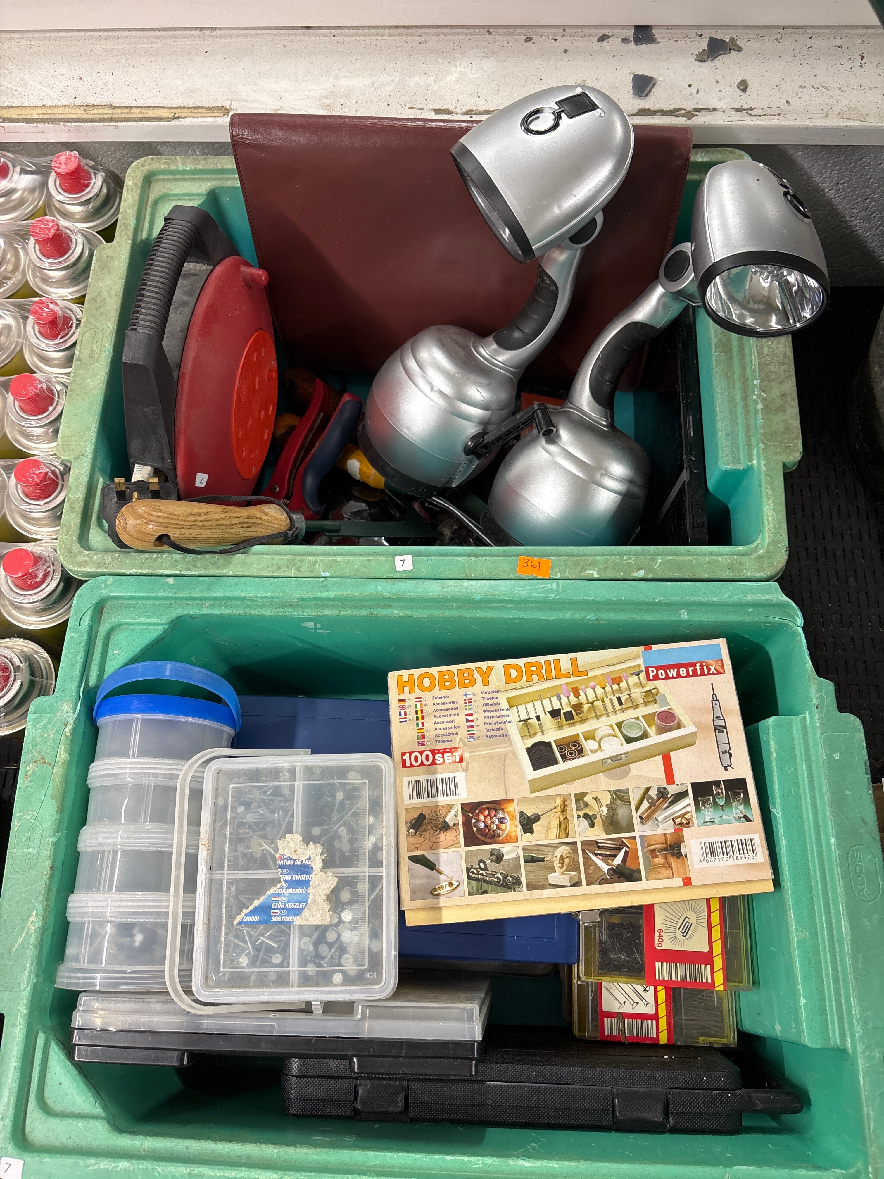 A collection of fishing tackle boxes and gear, comprising two utilitarian green plastic crates, marked with lot numbers ‘7’ and ‘361’. The upper crate contains two silver-toned, plastic and metal gooseneck-style work lamps, a red plastic extension reel with a visible UK plug, various hand tools including one with a wooden handle, and several small silver gas canisters with red caps, individually shrink-wrapped. The lower crate features a ‘Powerfix HOBBY DRILL 100 SET’ kit in its original multilingual cardboard packaging, prominently displaying “HOBBY DRILL” and “Powerfix” branding, and listing ‘Accessories’ in multiple languages. Complementing this are various clear plastic organizers filled with small fasteners (one box marked ‘640g’), a stack of clear plastic round containers with a blue lid, and several black plastic tool cases.
