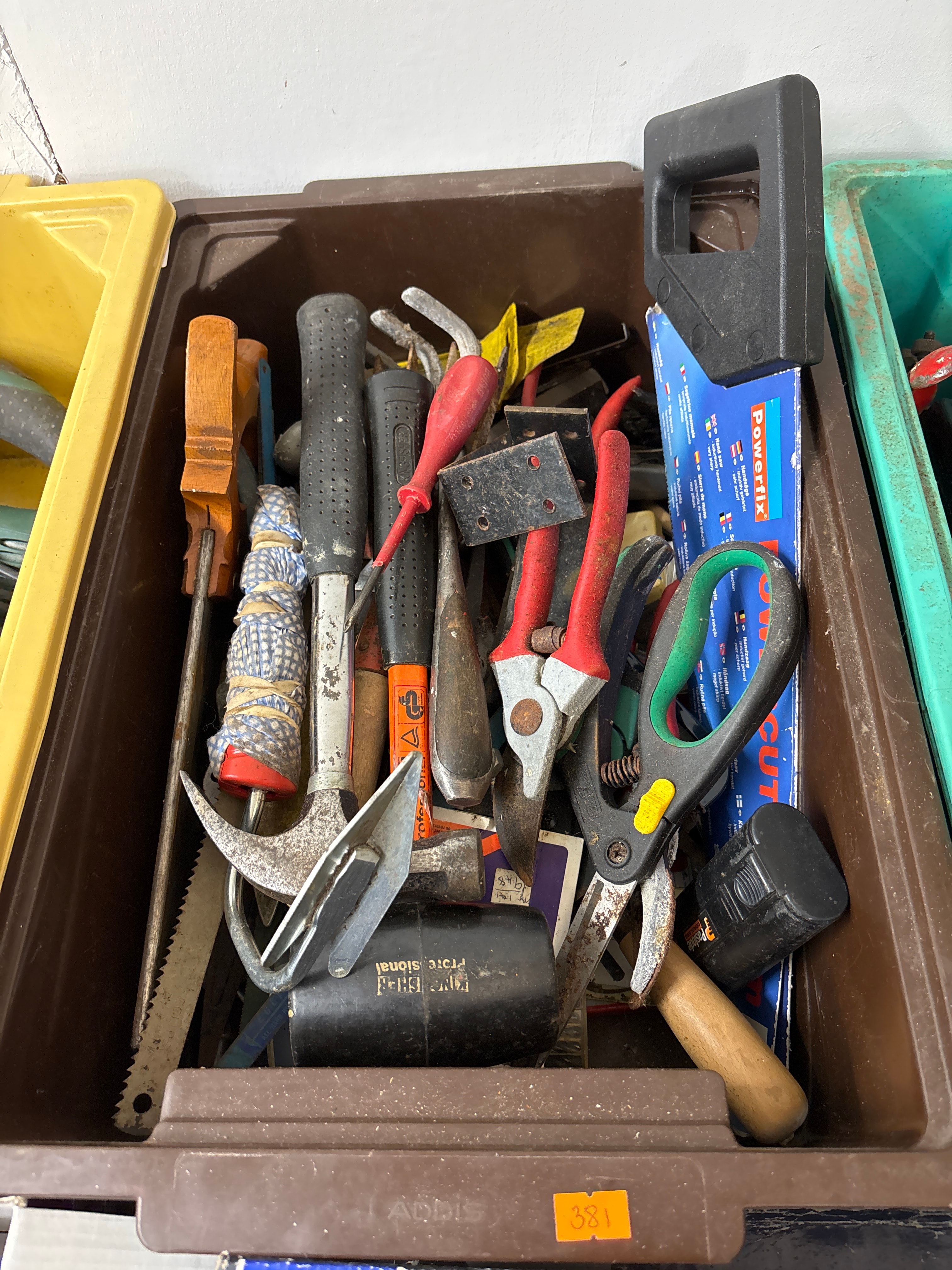 This lot features a brown plastic utility bin, embossed “ADDIS” and bearing an orange sticker numbered “381,” containing a diverse collection of used hand tools. The assortment includes various hammers, such as one claw hammer and another with a black rubber handle marked “ENG-EVER.” Also present are multiple types of pliers and cutters, some with red plastic/rubber handles and one pair with green and black handles. The collection further comprises several screwdrivers, including one with a red plastic handle, a wooden plane, a serrated blade tool, and various metal brackets. A partially visible blue package for a “Powerfix Hand saw” is included, noting “Handsäge,” “Sierra de mano,” “Scie à main,” “Ručná píla,” and “Kézifűrész.” One black tool handle is inscribed “KING BIRD Professional.”