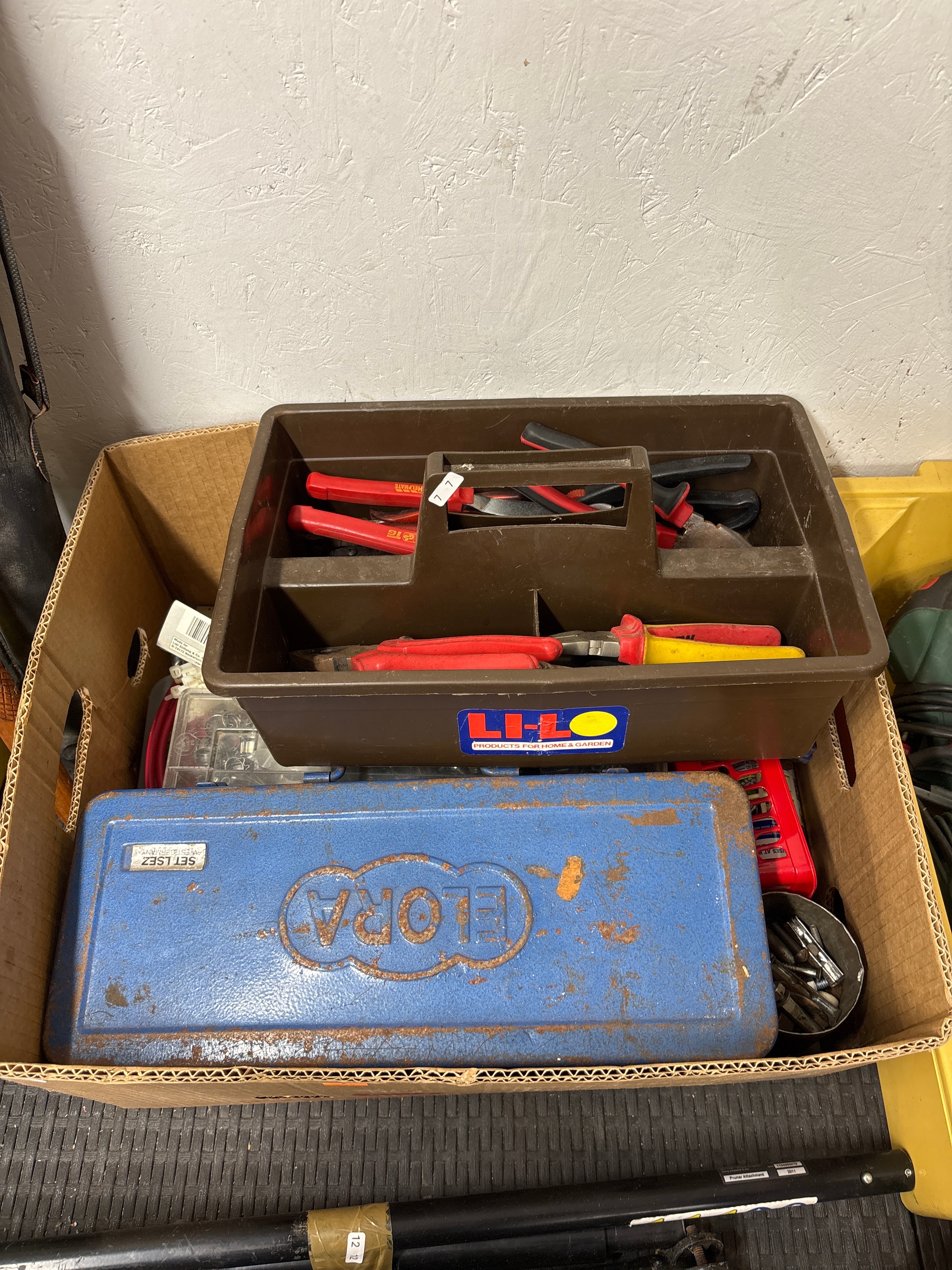 This lot comprises a collection of tools and accessories. At the top, a brown plastic open-top tool caddy bears a sticker that reads “LI-LO PRODUCTS FOR HOME & GARDEN” and contains various hand tools, predominantly pliers and wire cutters with red, black, and yellow insulated handles. Below this is a blue painted metal toolbox, marked with raised “FLORA” lettering and a silver label indicating “SET LSEZ WEST GERMANY,” dating its manufacture between 1949 and 1990. Additional items in the box include a red plastic case, a small metal container with assorted fasteners, and a partially visible black cylindrical “Pruner Attachment” labeled with the year “2011” and a serial number.
