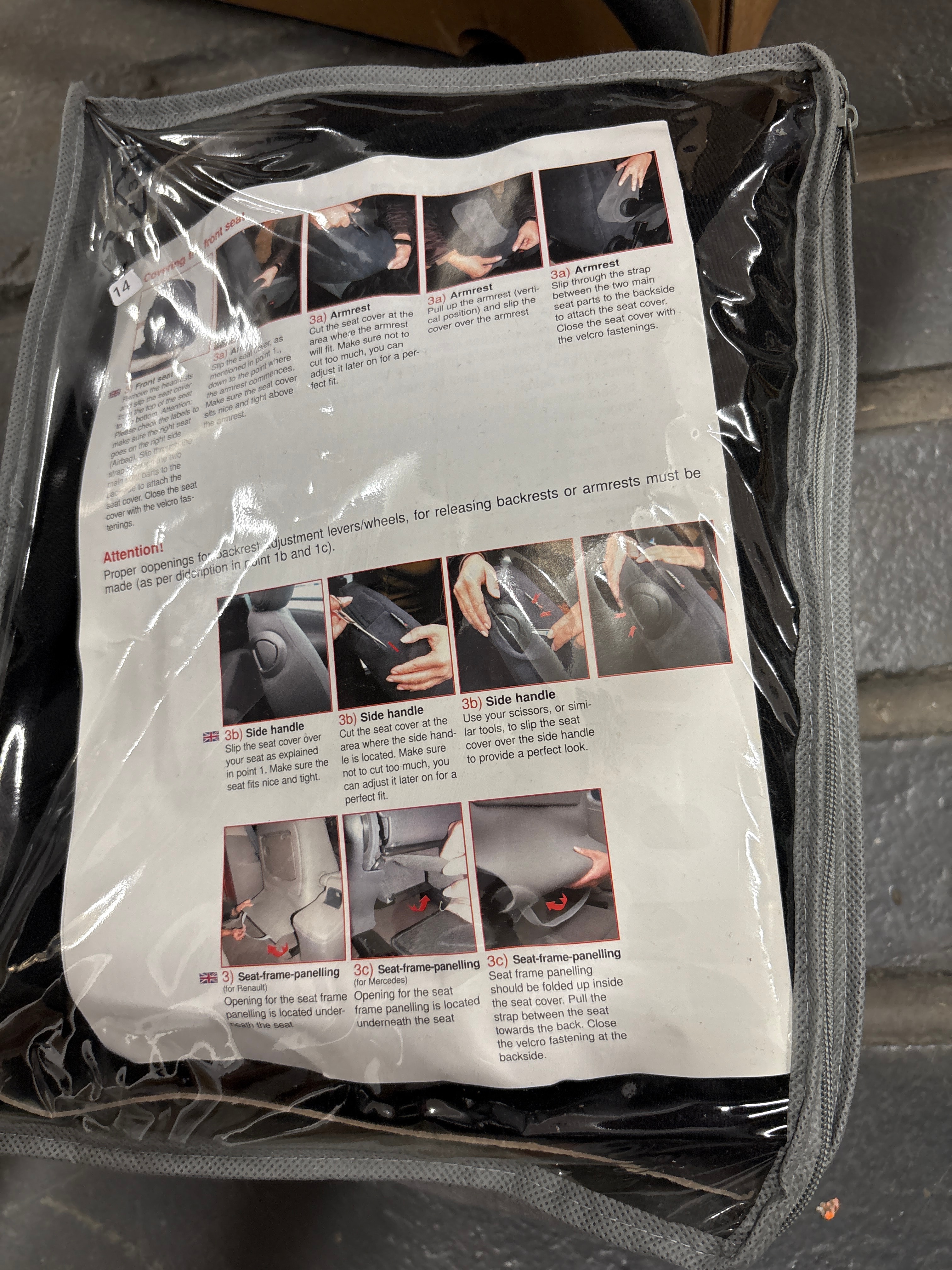 This item consists of new, modern car seat covers, appearing to be made of a dark fabric (likely black or charcoal), sealed within clear plastic packaging. This primary packaging is further contained in a gray, textured, zippered, non-woven fabric storage case. A white instruction sheet is visible through the plastic, featuring diagrams and text primarily in English, denoted by a British flag icon, detailing installation steps for “Front seat,” “Armrest,” “Side handle,” and “Seat-frame-panelling.” Specific mentions of “Renault” and “Mercedes” indicate vehicle compatibility, while instructions refer to “velcro fastenings” and necessary cuts for side handles and armrest openings.