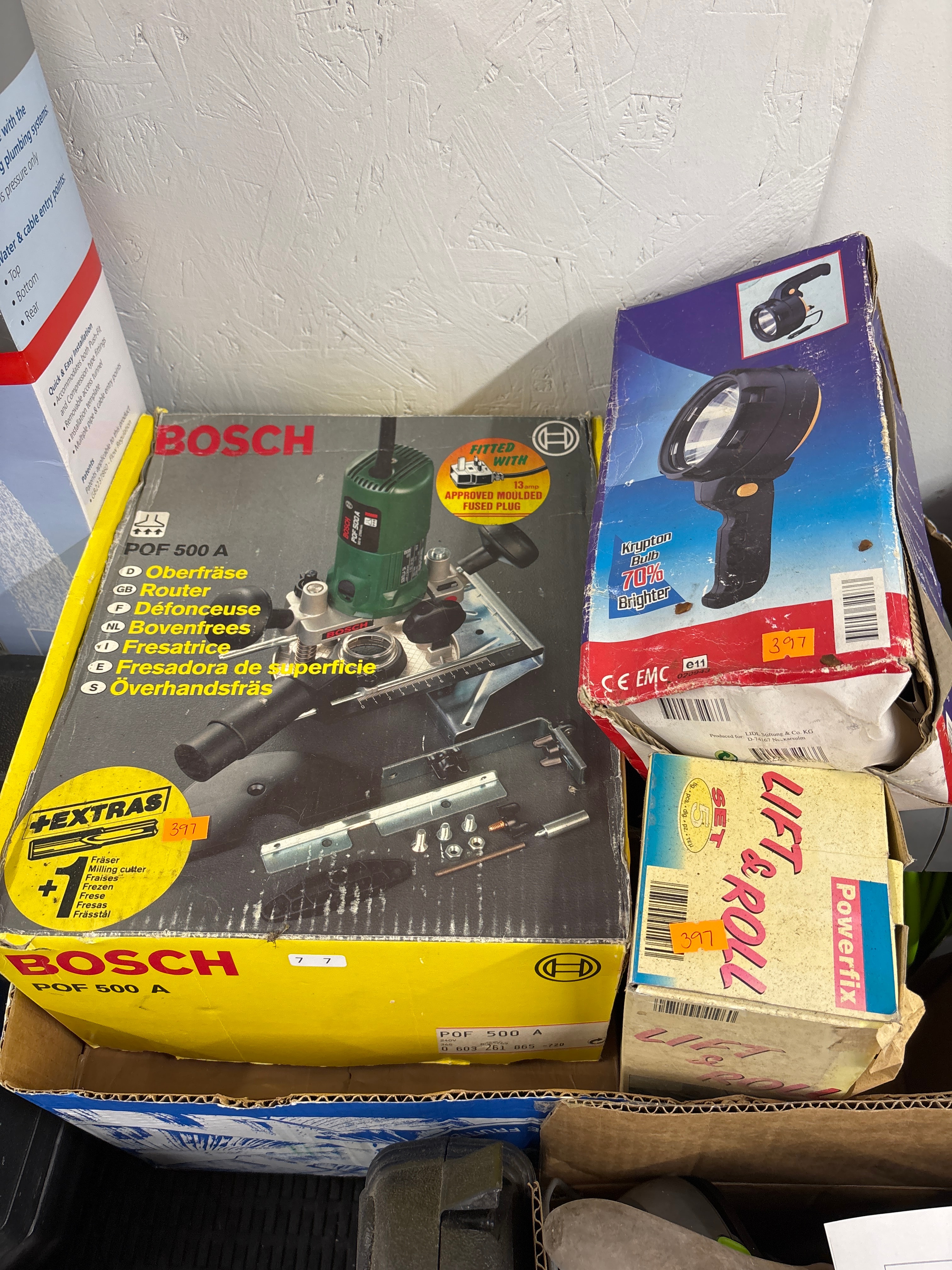 A group of three boxed items. The first is a Bosch POF 500 A router, presented in its original yellow and black cardboard box. The box displays the green and silver tool and features multilingual labels for ‘Router’ (including German ‘Oberfräse’, French ‘Défonceuse’, Italian ‘Fresatrice’, and Spanish ‘Fresadora de superficie’). A sticker on the box indicates it is ‘FITTED WITH 13amp APPROVED MOULDED FUSED PLUG’ and includes ‘+EXTRAS: 1 Milling cutter’ (also labeled in German ‘Fräser’, French ‘Fraises’, Italian ‘Frese’, Spanish ‘Fresas’). The second item is a portable spotlight in a blue and black cardboard box, featuring an image of a black handled light and noting ‘Krypton Bulb, 70% Brighter’. This box is identified as ‘Produced for: LIDL Stiftung & Co. KG’. The third item is a Powerfix Lift & Roll 5 SET, appearing to be furniture moving aids, contained within a smaller beige box. All three visible boxes bear an orange ‘397’ sticker.