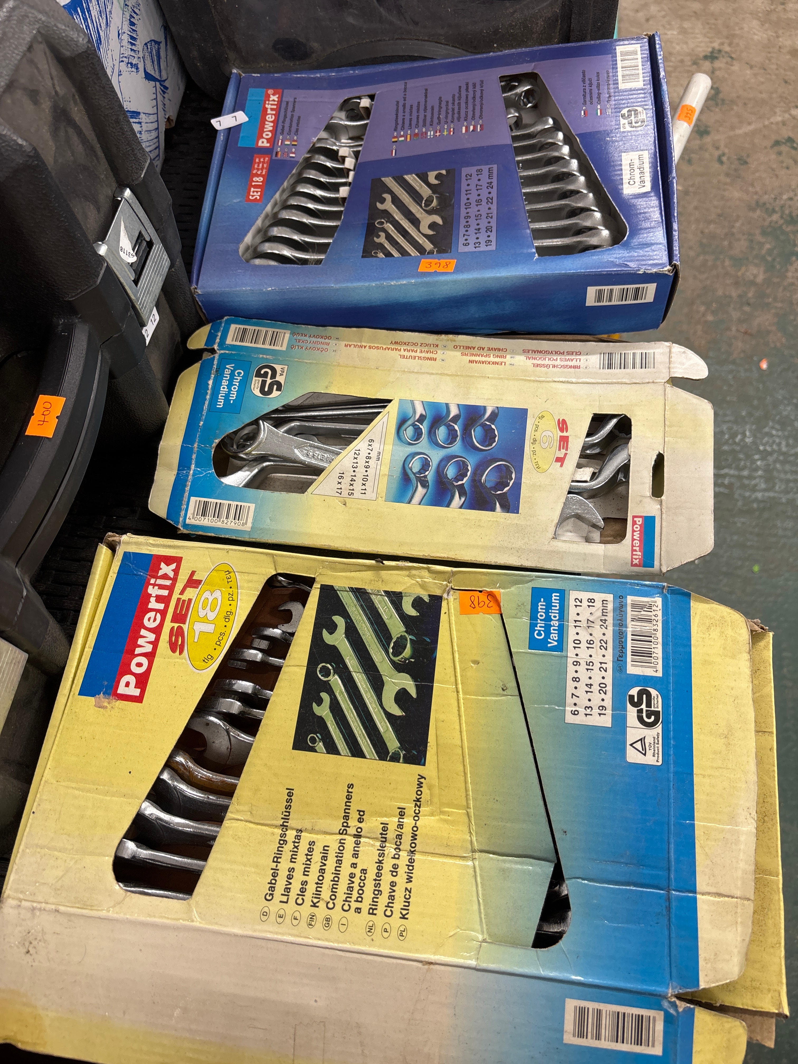 A group of three Powerfix brand wrench sets, manufactured from Chrom-Vanadium steel, presented in their original cardboard packaging. The lot comprises two 18-piece combination spanner sets, covering sizes from 6mm to 24mm, and one 6-piece set of double-ended ring spanners, with sizes ranging from 6x7mm to 16x17mm. The packaging displays various markings including “Powerfix”, “Chrom-Vanadium”, “SET 18”, “SET 6”, specific millimeter dimensions, GS and TÜV Rheinland product safety logos, and barcodes. Multilingual descriptions such as “Gabel-Ringschlüssel”, “Combination Spanners”, and “Γερμανικοι λυγώνο” are also visible. Orange price stickers marked “398” and “400”, along with a white sticker “77”, are affixed to the packaging.