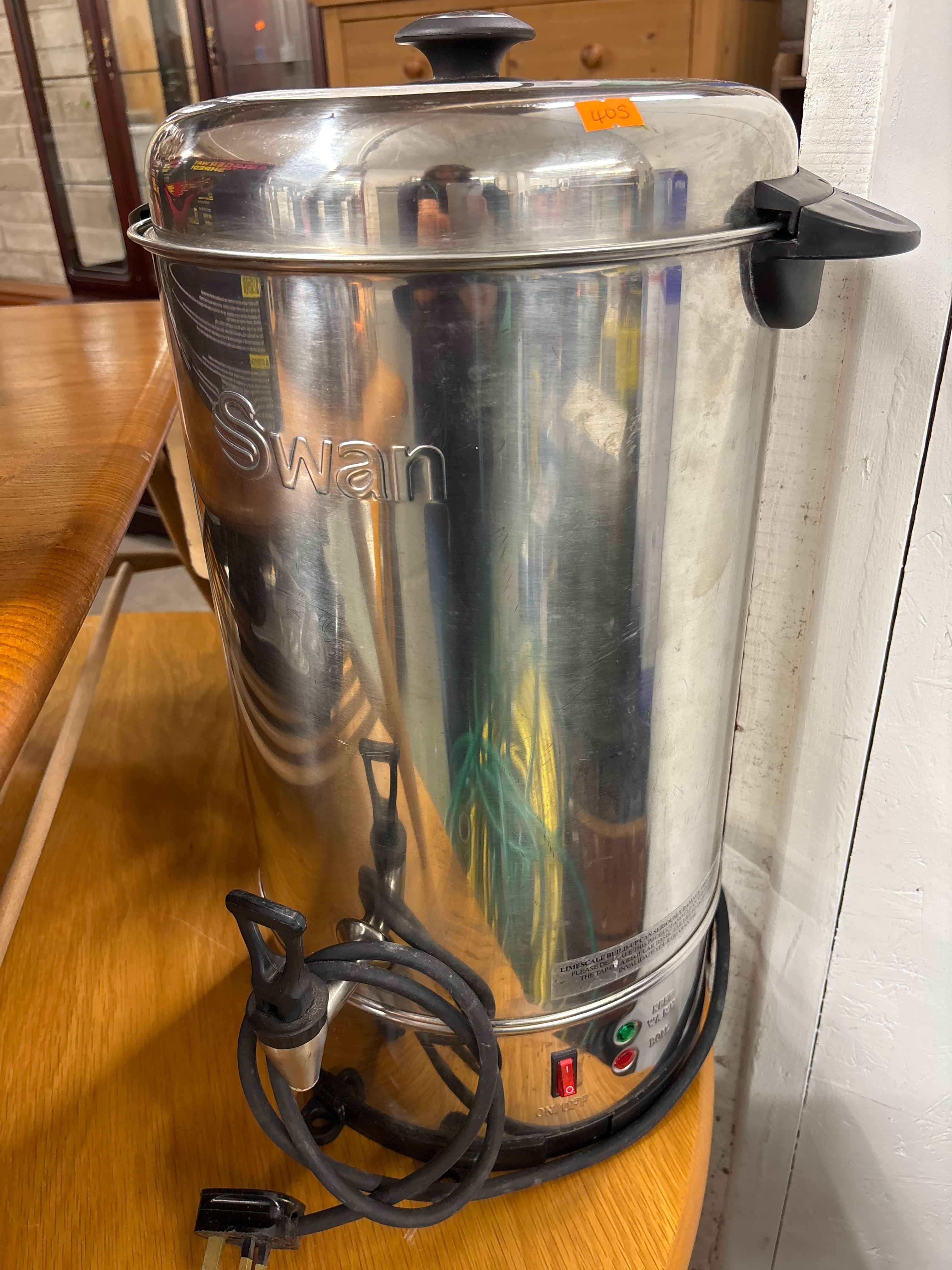 A modern electric hot water urn, also known as a beverage boiler, by Swan. The appliance features a tall cylindrical body and a domed lid, primarily constructed from polished stainless steel. Black plastic is utilized for the lid knob, side handle, and base. The brand name “Swan” is embossed on the front. The base includes a red “ON/OFF” rocker switch, accompanied by red and green indicator lights. Partial English text on the lower body refers to ‘LIMESCALE BUILD-UP’, ‘KEEP WARM’, and ‘BOIL’ functions. A coiled black power cord with a UK-style 3-pin plug is attached.