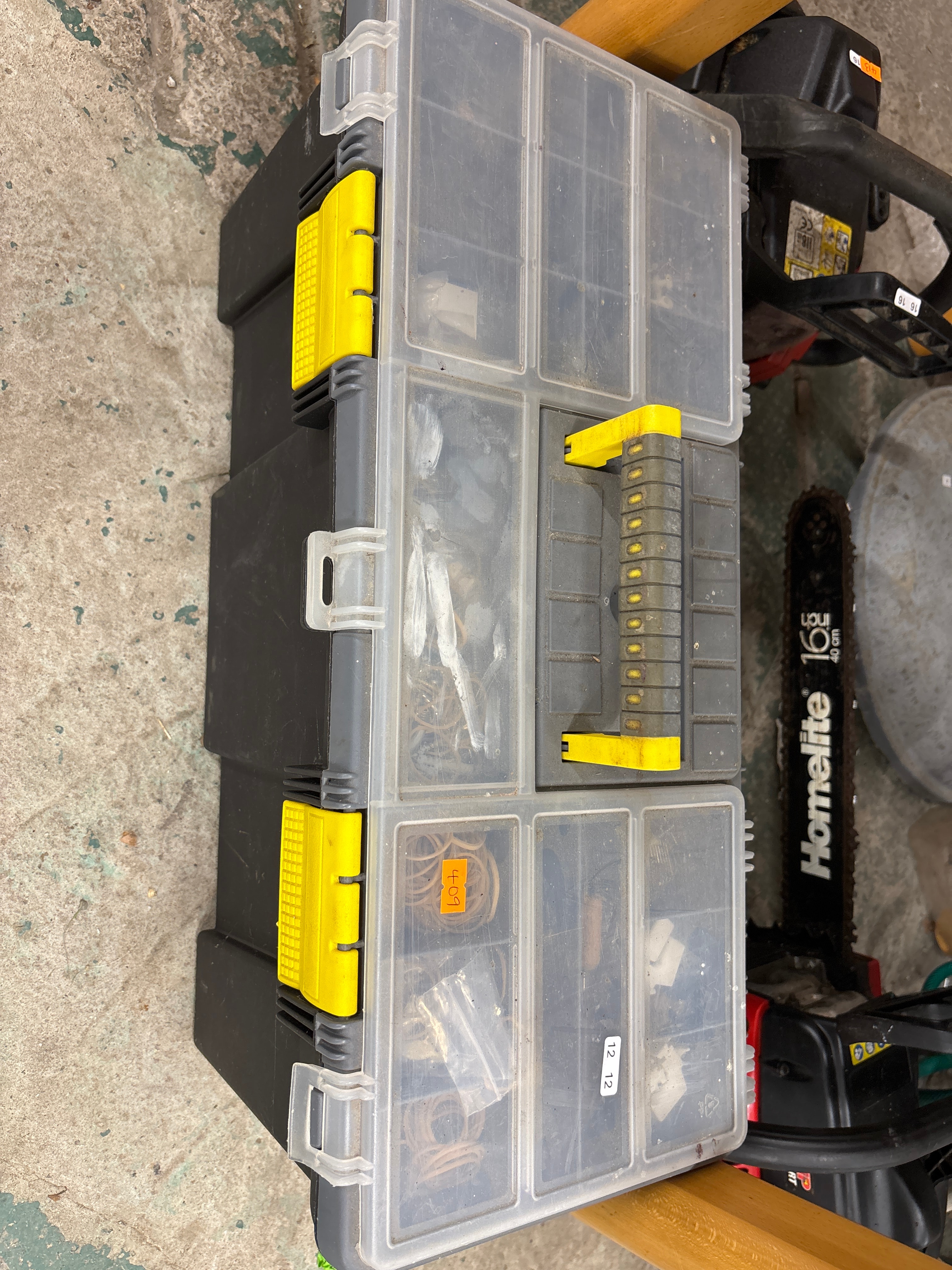 A Stanley Hand Tools STST14022 Plastic Lock Jaw Utility Box, a multi-tiered plastic storage organizer composed of a black body, clear individual compartment lids, and yellow plastic latches and a ribbed handle. The compartments contain assorted small items, including rubber bands and various small hardware pieces. Visible markings on the organizer include an orange sticker displaying “409” and a white sticker with “12 12”. Accompanied by a Homelite 16″ (40 CM) black plastic-bodied chainsaw with a metal blade. Its body bears a “CE” mark and two orange stickers with “16 16” (appearing as “91 91” if inverted).