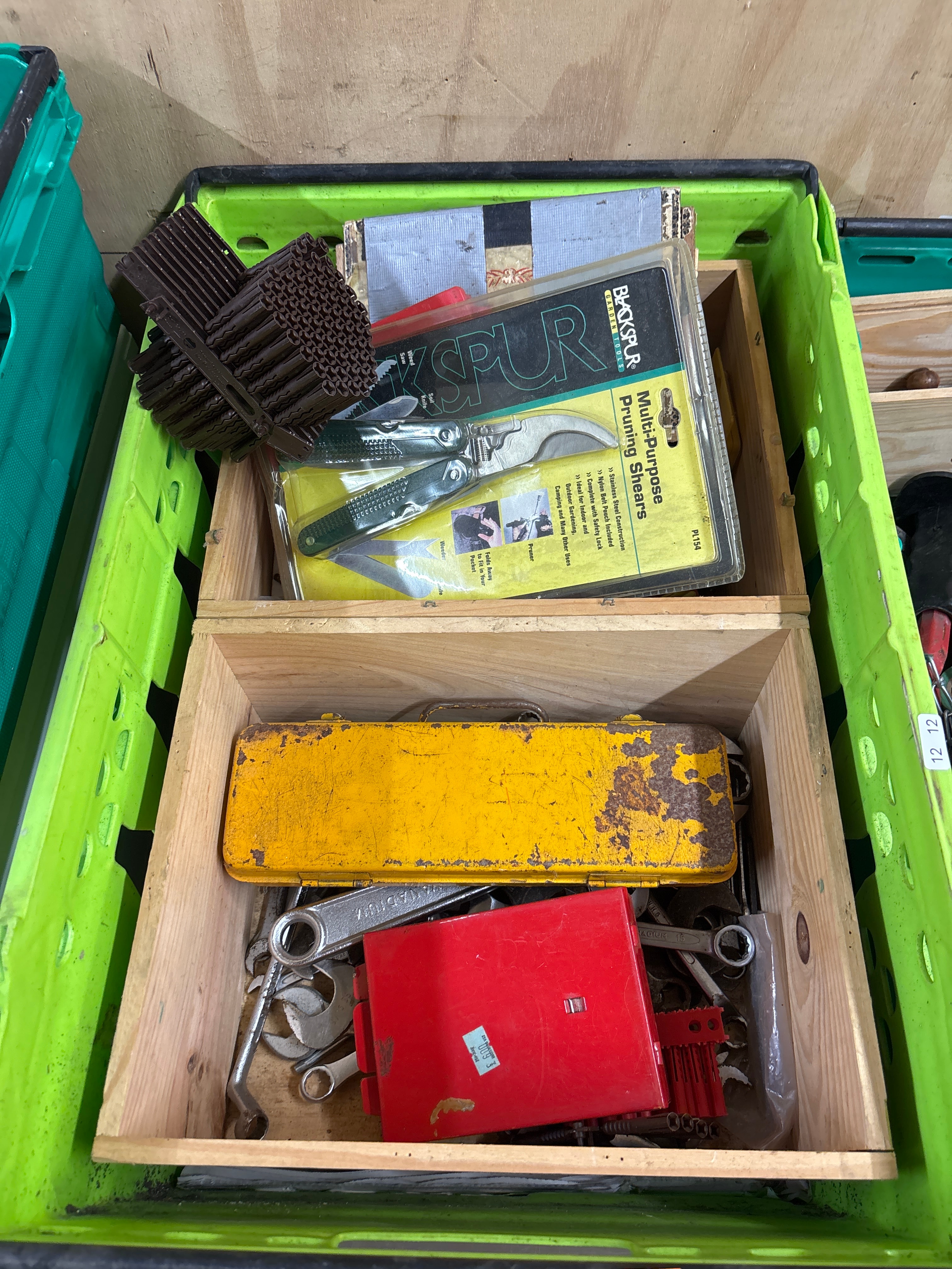 This lot comprises a selection of utilitarian tools and storage solutions. It includes two bright green plastic stacking crates, with the top crate featuring a wooden divided insert. The upper compartment contains a new or packaged “BLACKSPUR GARDEN TOOLS Multi-Purpose Pruning Shears” (PL154) made of stainless steel and plastic, along with dark brown plastic items that appear to be interlocking or modular, possibly for gardening. The lower compartment holds a heavily worn and rusted yellow metal toolbox with a metal handle, filled with assorted used metal wrenches, some visibly marked “VANADIUM”. Also present is a smaller, red plastic toolbox displaying a reseller tag that includes “V4.00” and “Jurgend”, and additional red plastic tools.