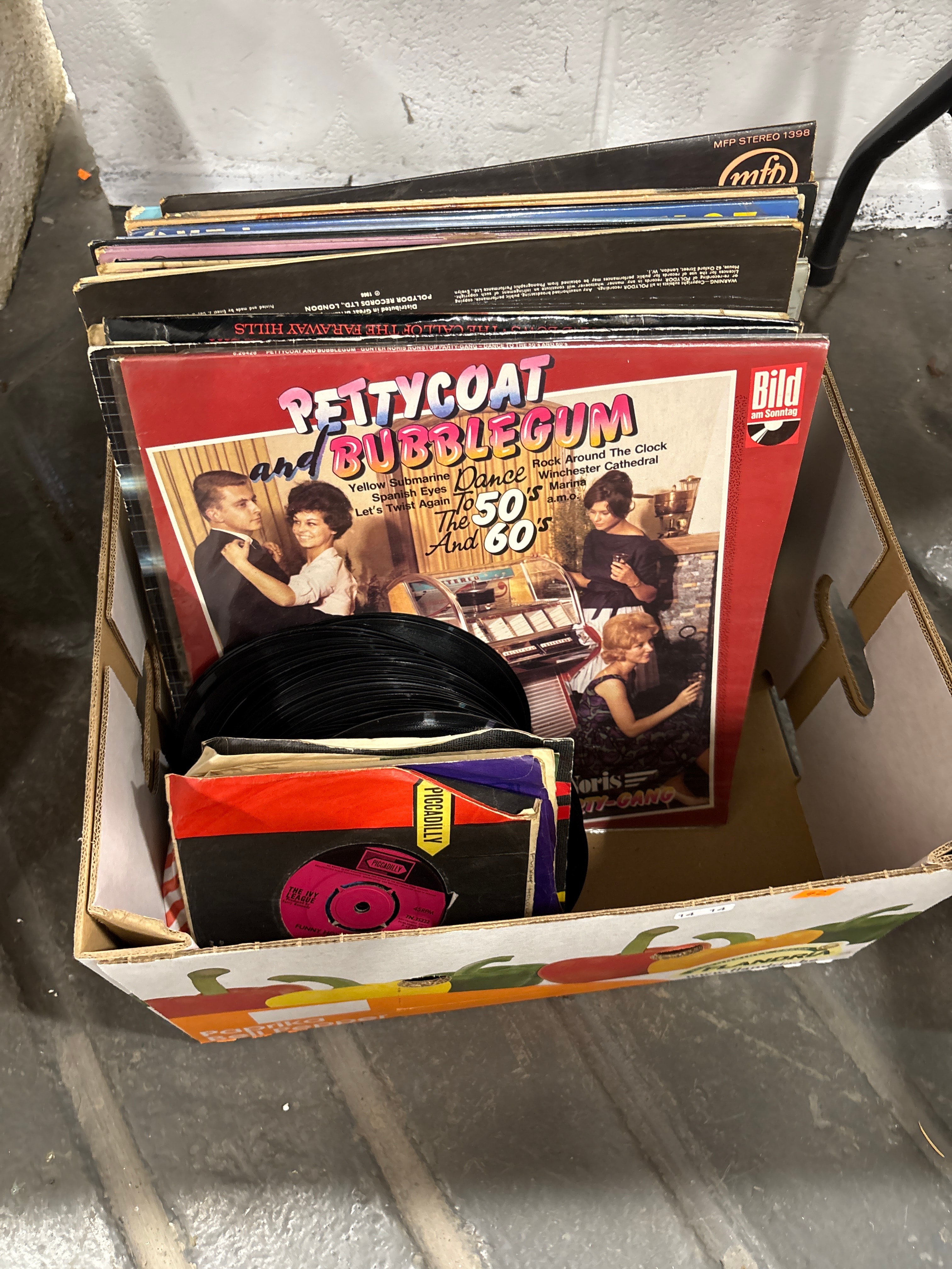 This lot comprises a collection of vintage vinyl records, consisting of both 12-inch LPs and 7-inch 45 RPM singles, presented in a standard cardboard storage box. The LP jackets and 45 RPM sleeves are predominantly made of paper and cardboard, featuring various designs. A prominent LP is titled ‘PETTYCOAT and BUBBLEGUM Dance To The 50’s And 60’s,’ depicting a nostalgic scene with a jukebox. Visible textual details on various items include ‘MFP STEREO 1398,’ ‘POLYGRAM RECORDS LTD, LONDON,’ and a copyright date of ‘1968,’ placing the collection primarily in the mid-to-late 20th century. One LP sleeve bears a ‘Bild am Sonntag’ logo, indicating potential German distribution or context. A visible 45 RPM record label is marked ‘PICCADILLY’ and features ‘THE IVY LEAGUE.’ The vinyl records are black.