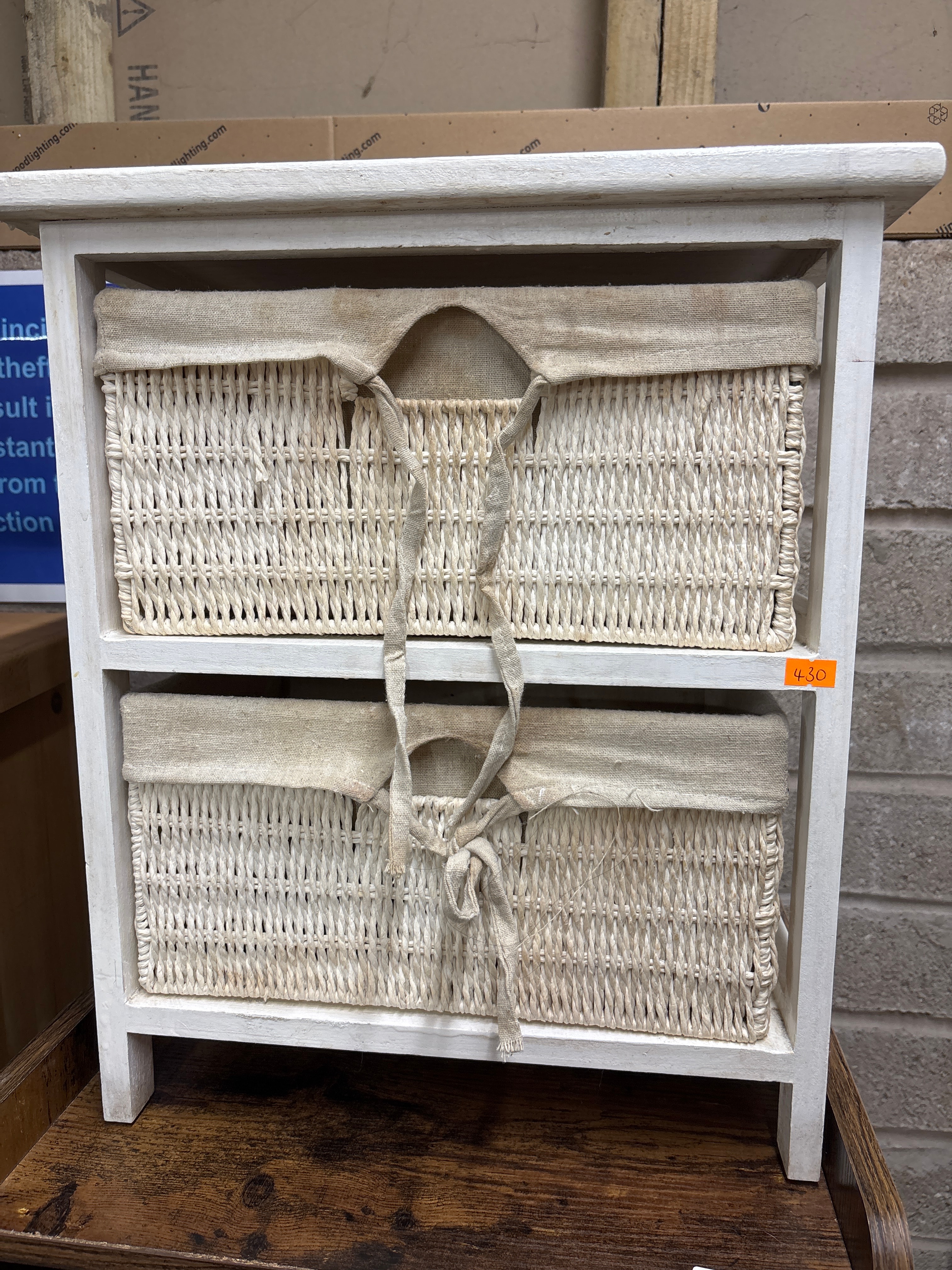 A Home Vida Maize two-tier storage unit, designed in a modern rustic or shabby chic style. It features an open wooden frame finished with distressed off-white paint. Each tier houses a rectangular woven basket, crafted from maize or a similar natural fiber, which is fitted with a light beige fabric liner, possibly linen or burlap, secured by a tie-front closure. The distressed finish is intentional to the design.