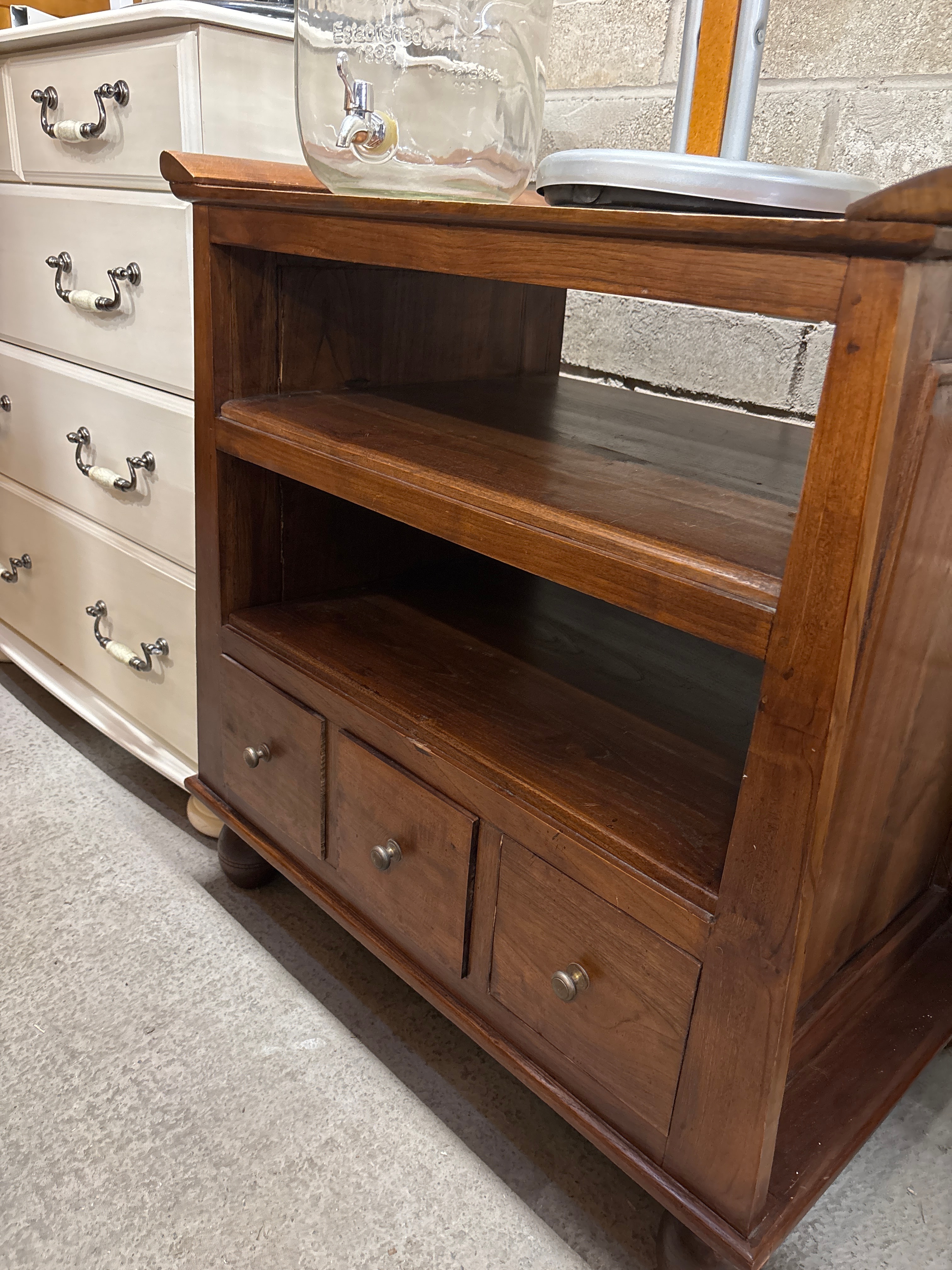 A dark reddish-brown stained wooden cabinet, designed to function as a media stand or open bookshelf. The cabinet features two open shelves positioned above three individual drawers. Each drawer is fitted with a small, circular brass-toned knob pull. The piece rests on short, turned bun feet. Its style is utilitarian with traditional or rustic influences. No specific manufacturer or period markings are visible on the furniture itself.