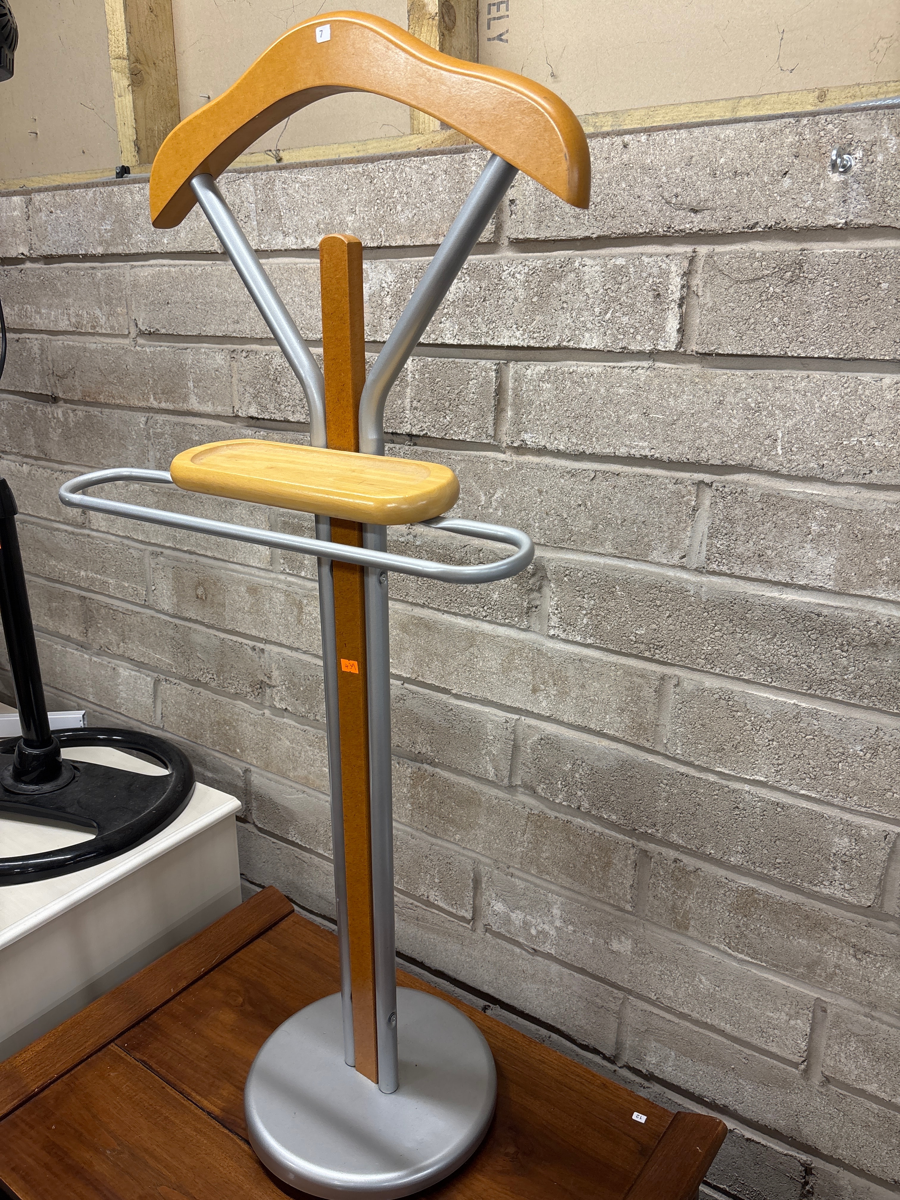 A Zeller 17102 Valet Stand, a modern design likely dating from the late 20th or early 21st century. It is constructed from light-toned wood, possibly beech, and silver-toned metal, appearing to be aluminum or chrome. The stand features a contoured jacket hanger at the top, a small central oval tray, and a curved horizontal bar, all supported by a central vertical wooden column. Two curved metal poles descend from the upper structure to a circular metal base. A white sticker with the number “7” is present on the top wooden hanger, and an orange sticker with “4.99” written in black marker is on the central wooden column.
