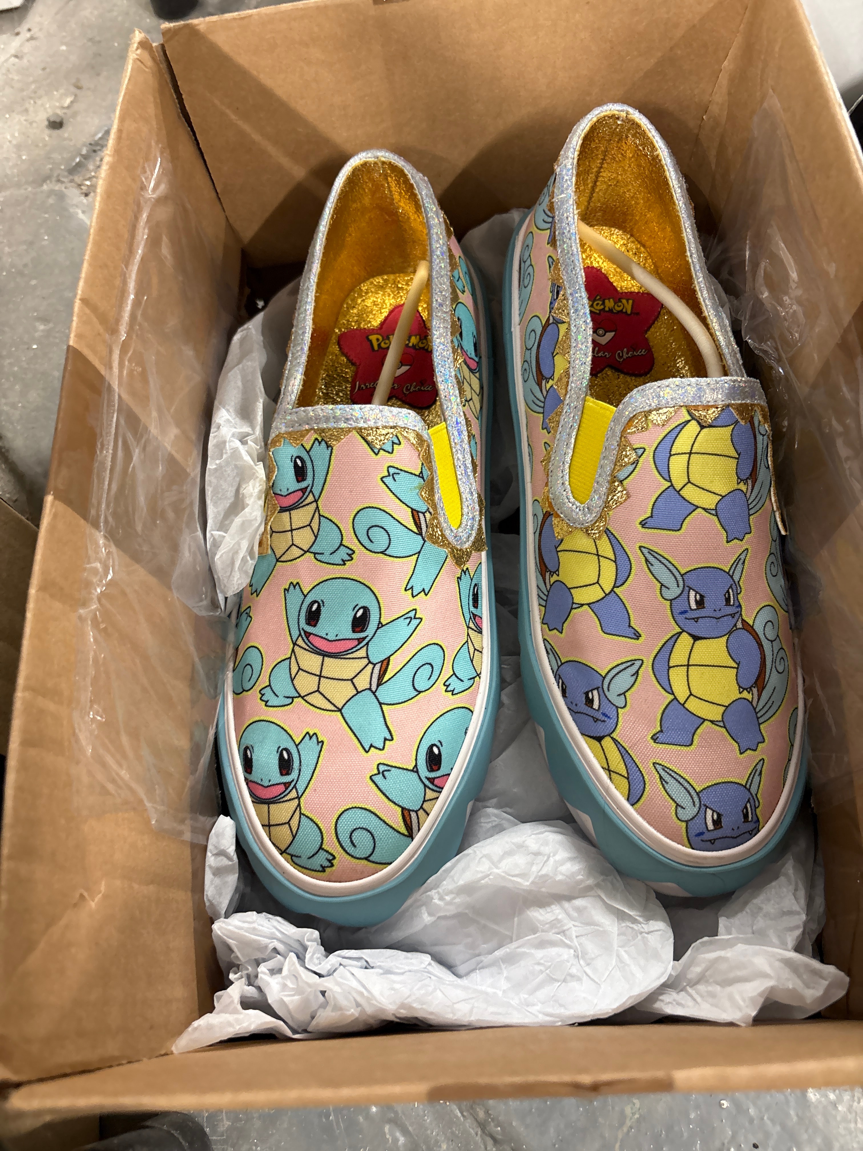 A pair of Irregular Choice Pokémon ‘Everyday Is An Adventure’ Squirtle & Wartortle slip-on shoes. Each shoe features a textile upper with a light pink base, patterned with multiple cartoon depictions of the Pokémon characters Squirtle and Wartortle. Design elements include silver glitter trim, yellow elasticated gussets, and a sparkling gold interior lining. The soles are light blue. The footbed of the left shoe displays a red star-shaped patch with ‘Pokémon’ and ‘Irregular Choice’ branding.