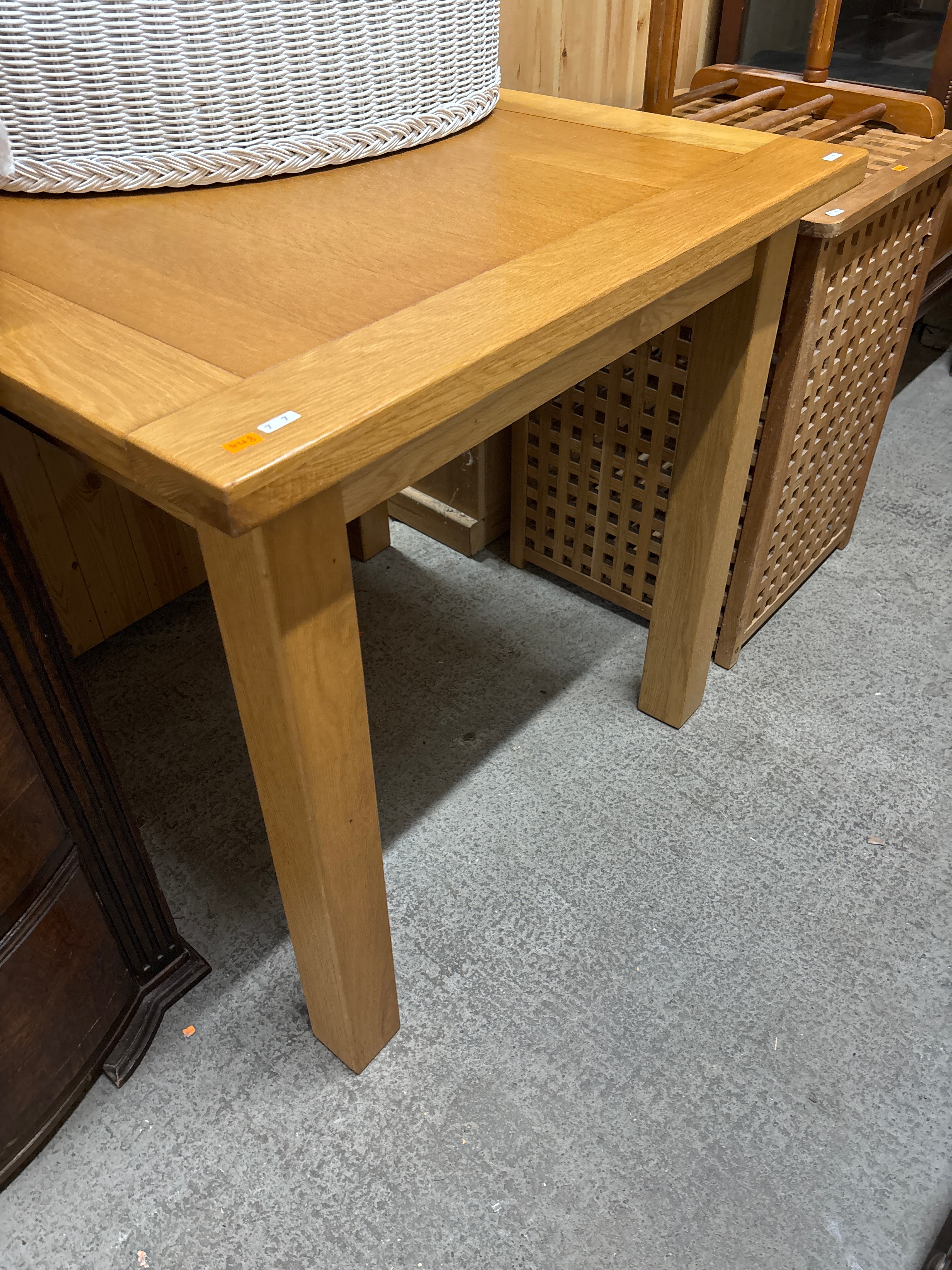 A rectangular wooden table of modern style, featuring clean lines and a light-toned oak finish. The solid-looking tabletop includes a recessed central panel, supported by four sturdy, square-profile legs. The table has a clear semi-gloss finish. An orange sticker displaying ‘448’ and a white sticker marked ‘7 7’ are affixed to one corner of the table’s edge.