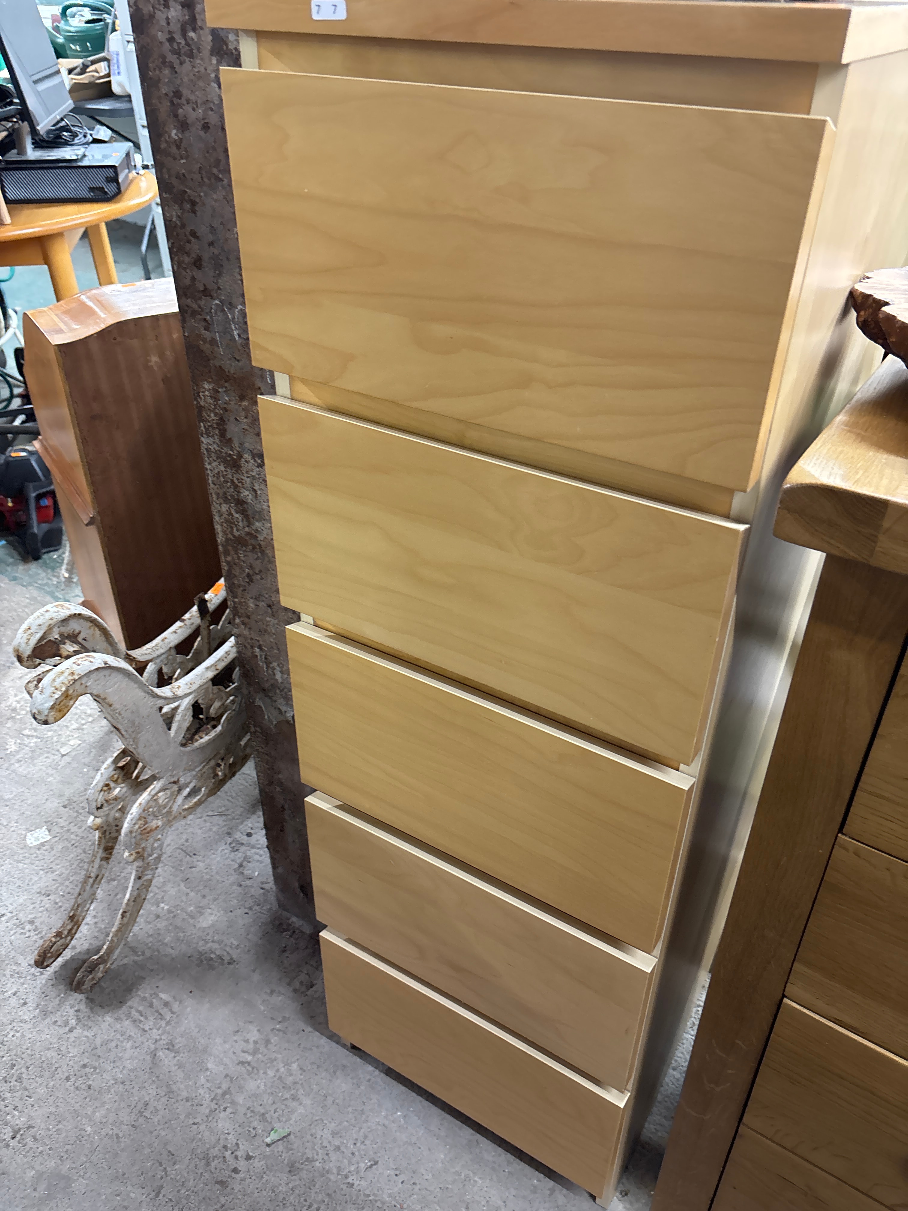 An IKEA STORKLINTA 6-drawer chest. This tall, narrow chest of drawers features six flush-fronted drawers without visible hardware, constructed from a light-toned wood-effect material, likely laminate or veneer over engineered wood. A white sticker bearing the numbers ‘7 7’ is visible on the top edge.