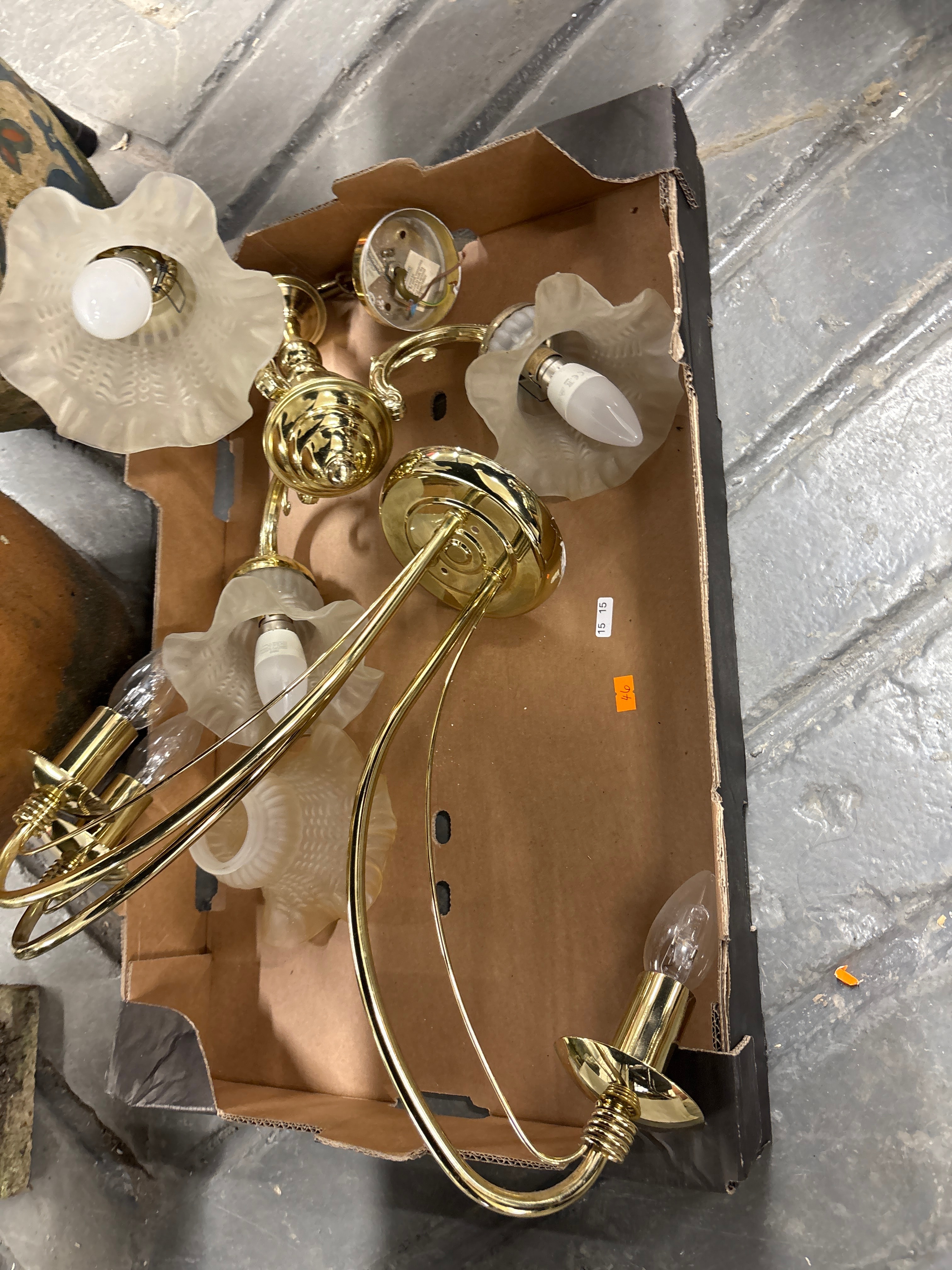 A group of components for multiple ceiling or wall-mounted light fixtures, likely of contemporary production. The lot includes polished brass-tone metal frames and hardware, featuring decorative central mounting plates and gracefully curved arms. Each arm terminates in a candelabra-style bulb socket, some currently fitted with various bulbs, including one marked ‘CE’. Complementing these are frosted, ruffled glass shades, some exhibiting a textured, possibly floral or foliate, pattern. The items are presented disassembled within a cardboard box.