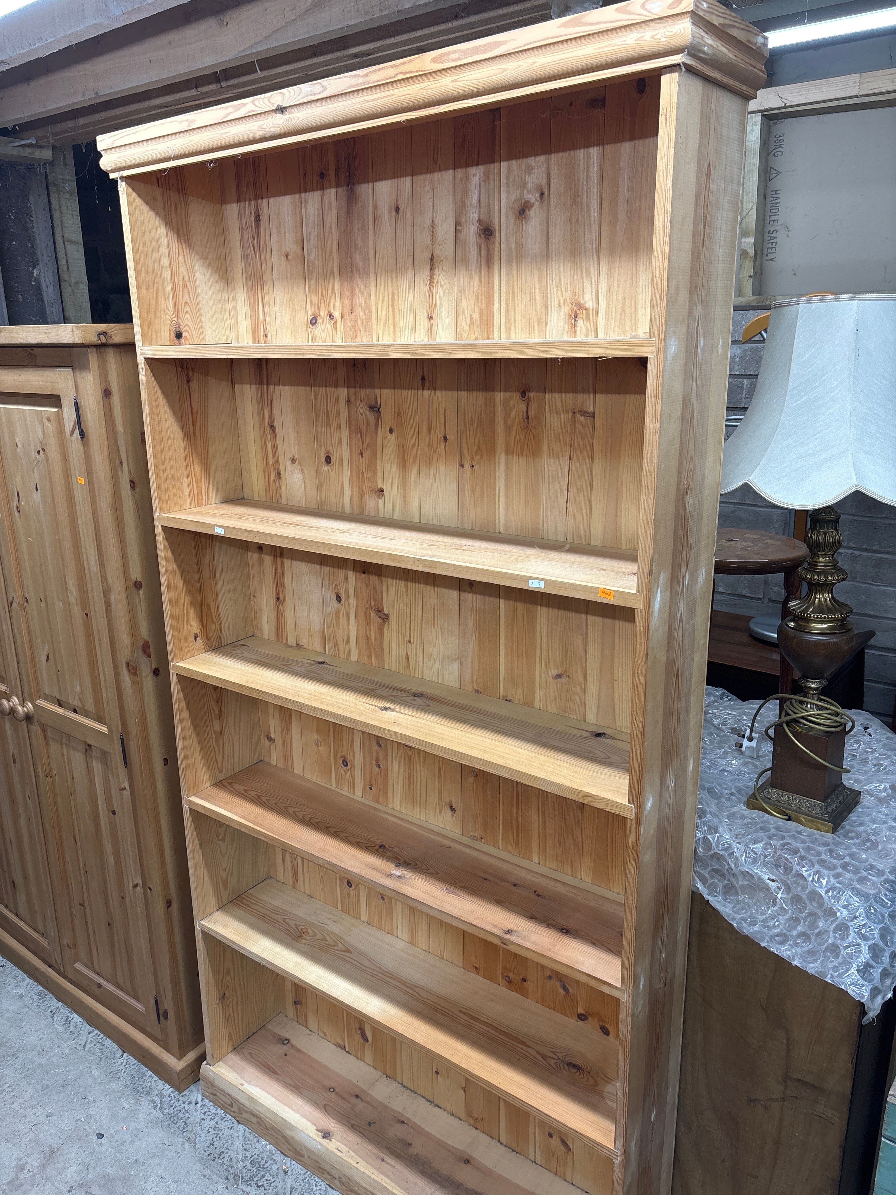 A tall, free-standing bookcase or shelving unit constructed from light-toned pine, exhibiting a rustic or country-style aesthetic. The unit features a prominent molded cornice at the top and five fixed shelves. The back panel is composed of vertical tongue-and-groove planks. The wood displays characteristic grain and knots, with visible variations in color and tone across the surfaces.