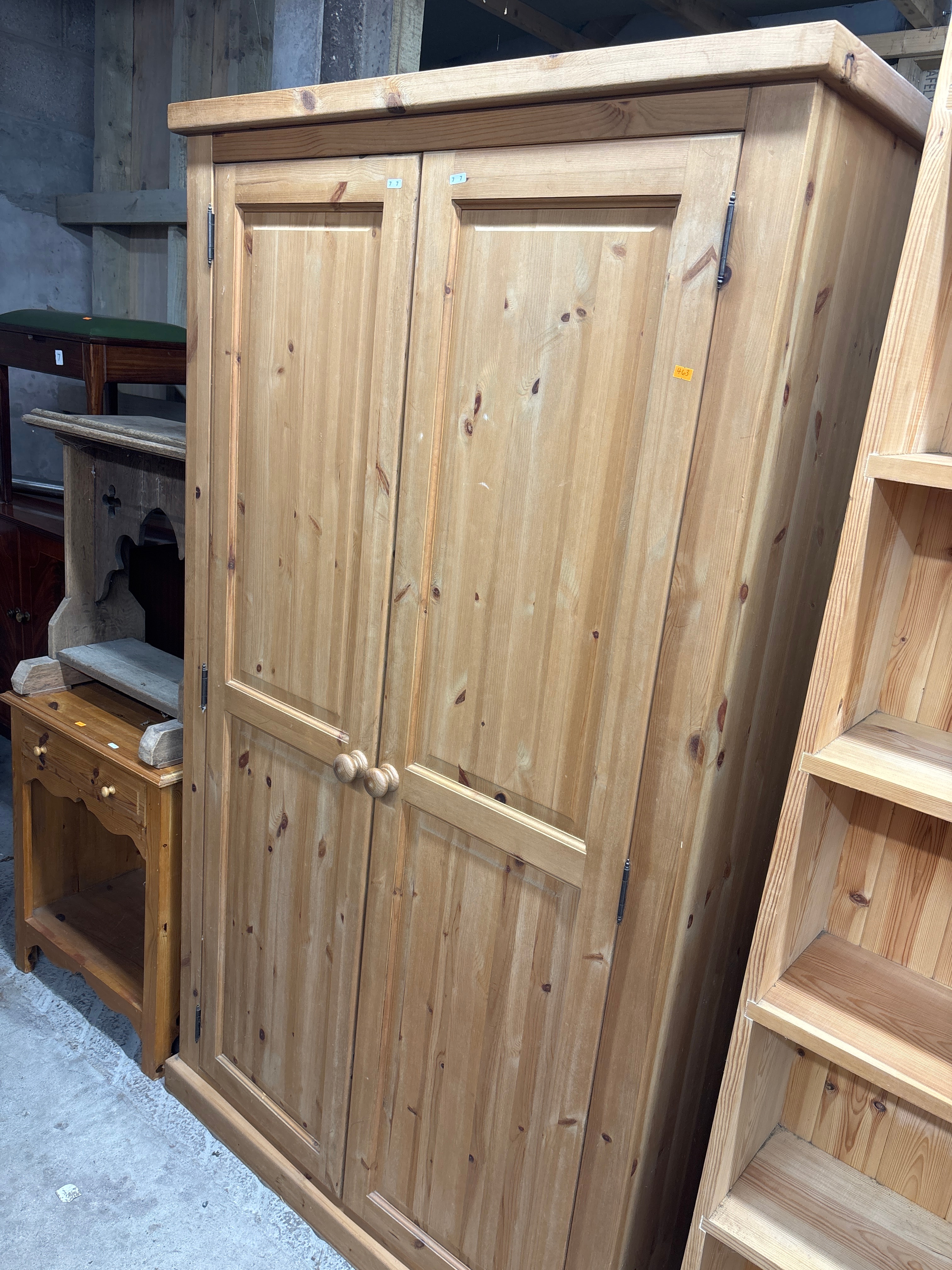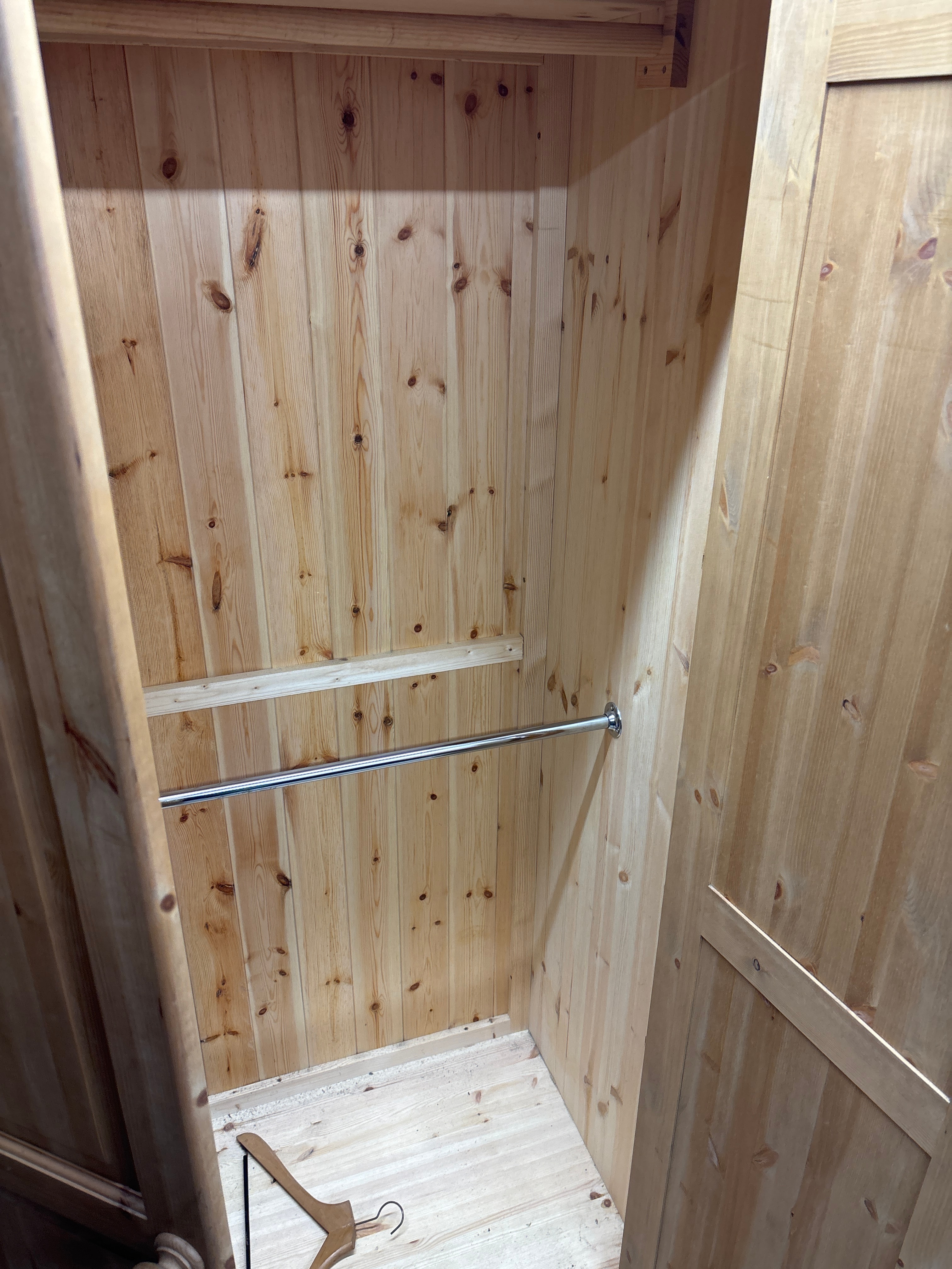 A contemporary two-door wardrobe, or armoire, presenting a simple and functional style, likely dating from the late 20th to early 21st century. It is constructed from light-toned solid pine, identifiable by prominent knots and grain. The interior reveals a metal hanging rail with a single shelf positioned above. Small stickers displaying ‘€6’ and ‘€10’ are visible on the doors.