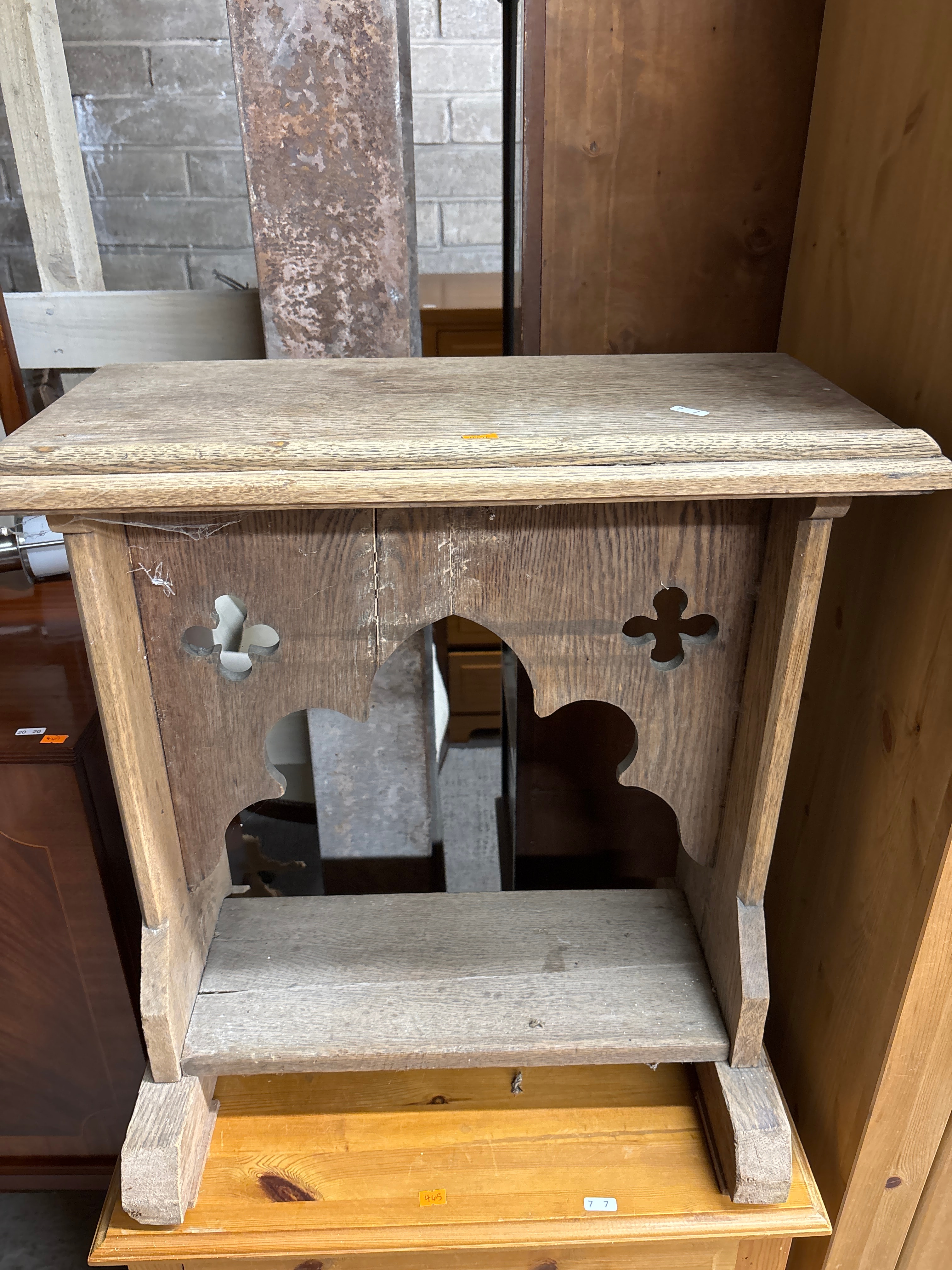An antique oak Gothic Revival prie-dieu or prayer desk. This small, freestanding wooden stand features a rectangular top with a molded edge and a lower rectangular shelf, supported by simple block feet. The front panel displays characteristic Gothic Revival elements, including prominent quatrefoil and pointed arch-like cutouts. Crafted from solid oak, the wood exhibits a visible grain and a light to medium brown tone.