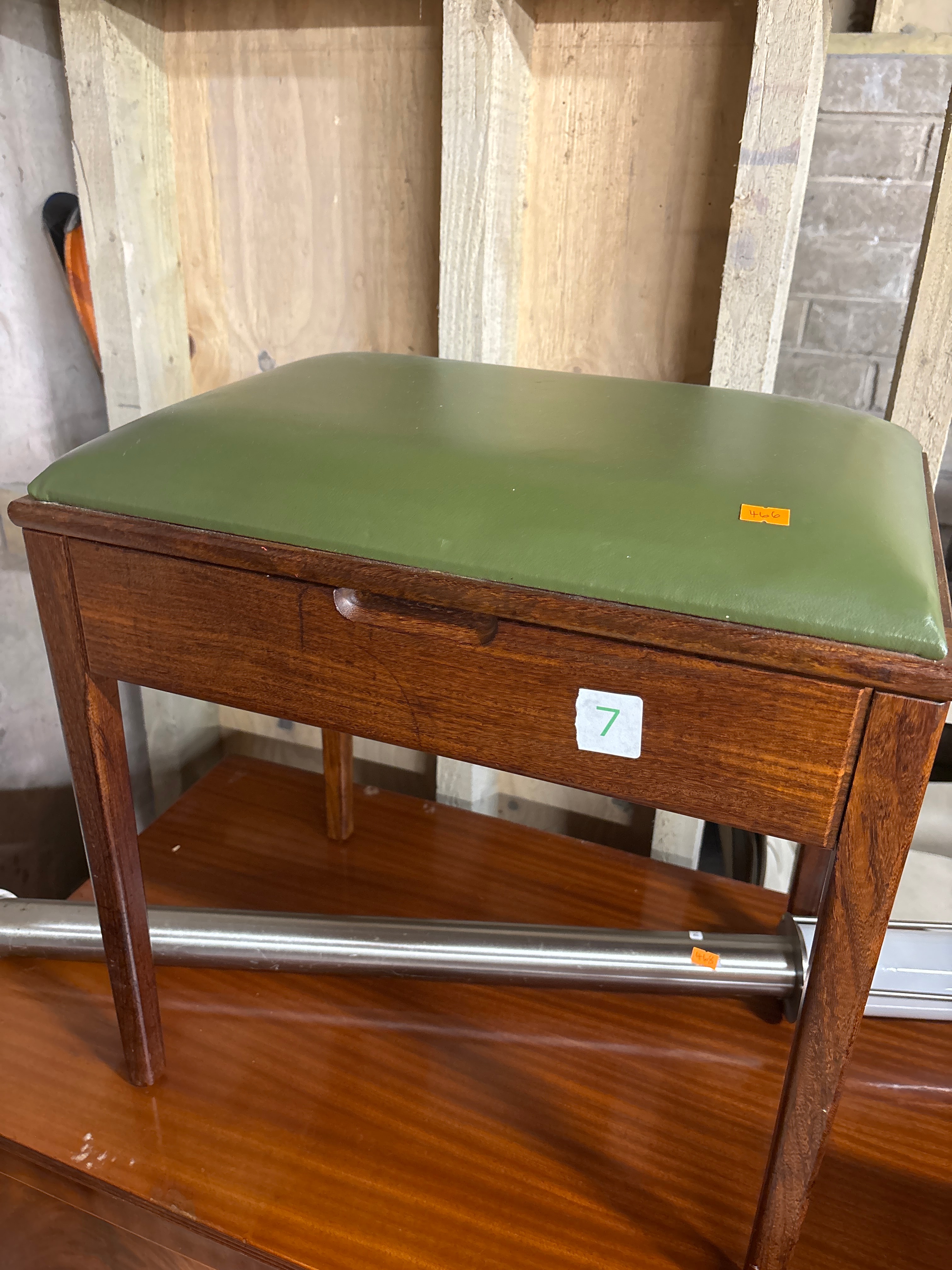 A Mid-Century Modern style dressing table stool, constructed from a polished, reddish-brown hardwood. The rectangular form features straight legs and a single, shallow front-facing drawer with a recessed circular wooden pull. The padded top is upholstered in a plain, dark green vinyl or faux leather.