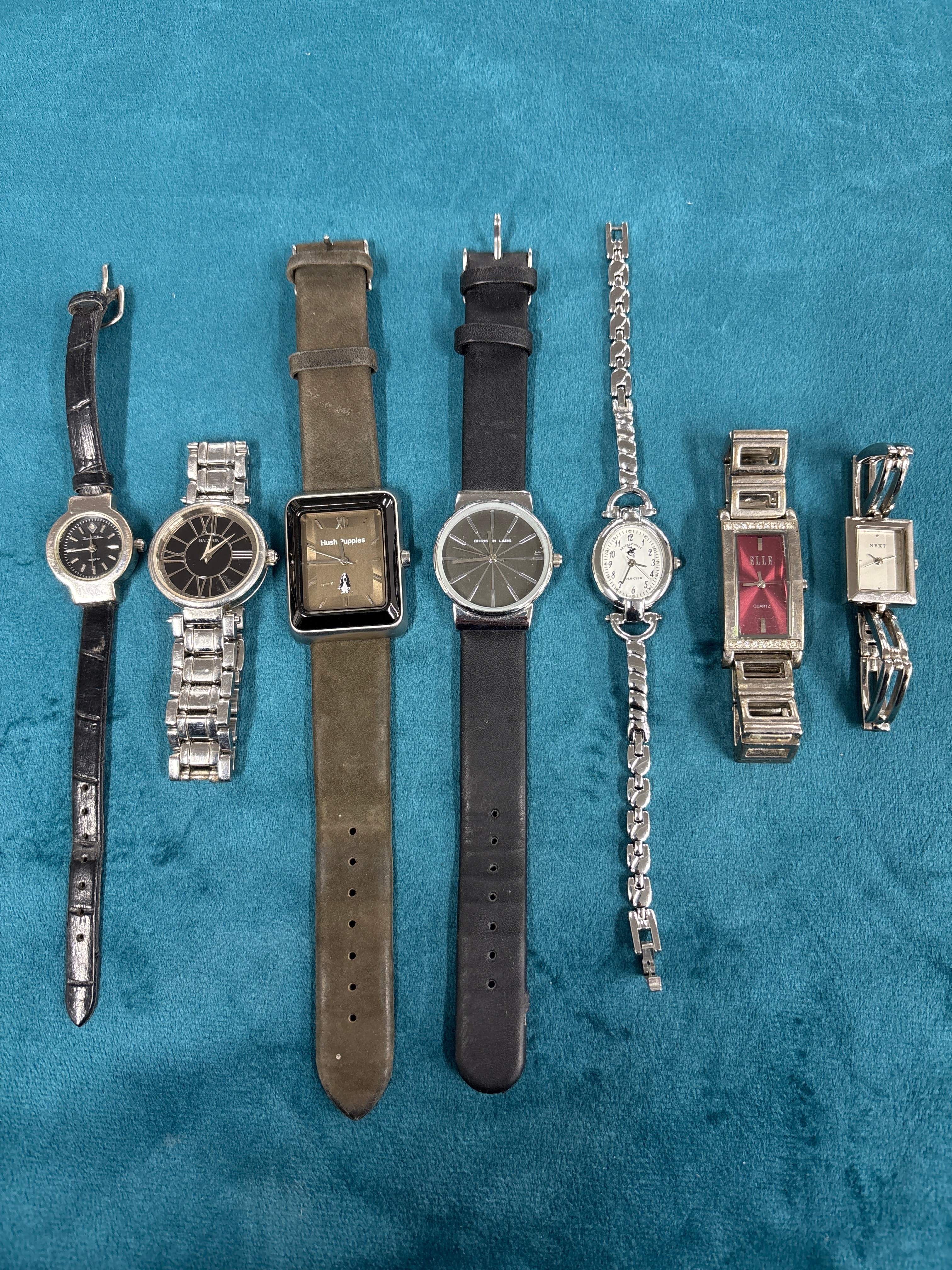 This lot presents seven assorted quartz wristwatches, predominantly featuring silver-tone metal cases and a mix of metal link bracelets and leather straps. The collection includes various styles, from small round and oval ladies’ watches to larger rectangular and round designs. Dials exhibit a range of colors including black, white, brown, dark grey, and a vibrant red, with various numeral and marker configurations. Visible brand markings include “David Chilian”, “BALMAIN”, “Hush Puppies” (with logo), “CHRIS IN LARS”, “GIVENCHY” (with “SWISS MADE” possibly visible), “ELLE”, and “NEXT”, all indicating quartz movements. One rectangular ELLE watch incorporates small clear stones or crystals on its bezel.