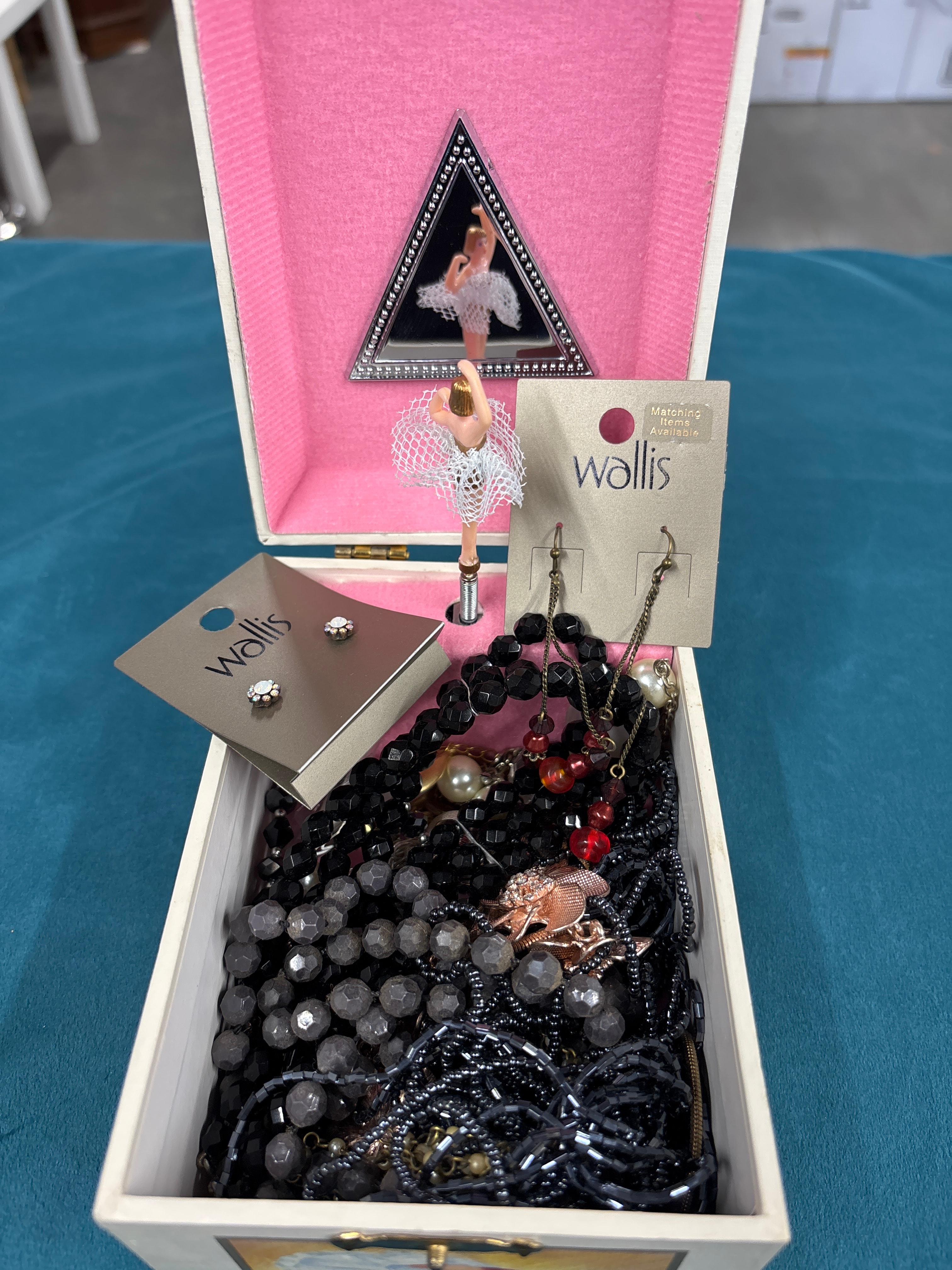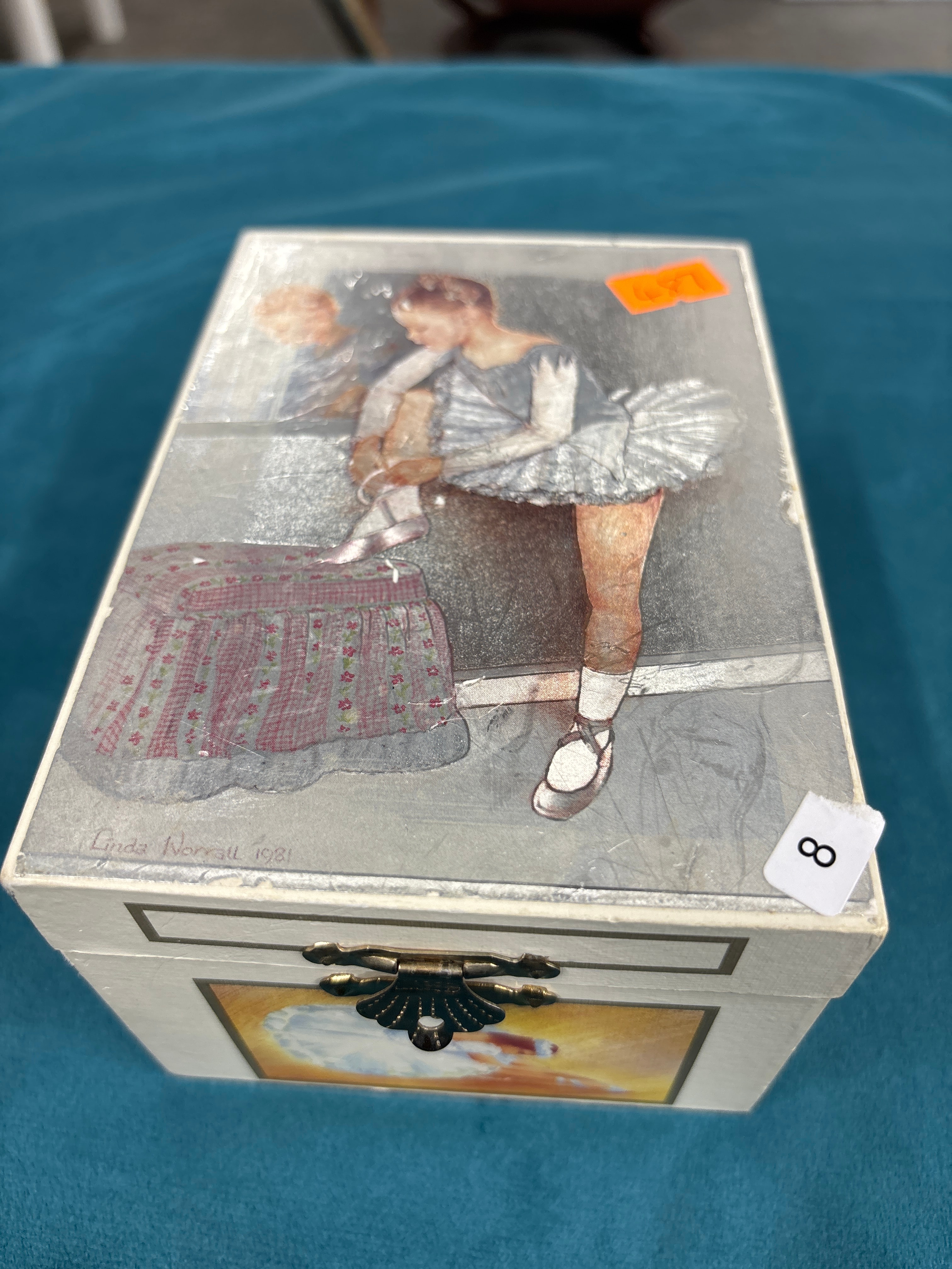 A rectangular, hinged musical jewelry box, likely constructed from wood or a wood composite. The lid is adorned with a decal or print depicting a ballerina adjusting her pointe shoe, signed “Linda Norrell 1981” in the bottom left. An orange sticker with illegible text and a white sticker marked “8” are also present on the lid. The front features a decorative metal clasp. Internally, the box is lined with pink felt and houses a rotating plastic ballerina figure in front of a small triangular mirror. The box is filled with various pieces of costume jewelry, including several necklaces and earrings, some of which are on “wallis” brand tags, with one tag also stating “Matching Necklace Available.”