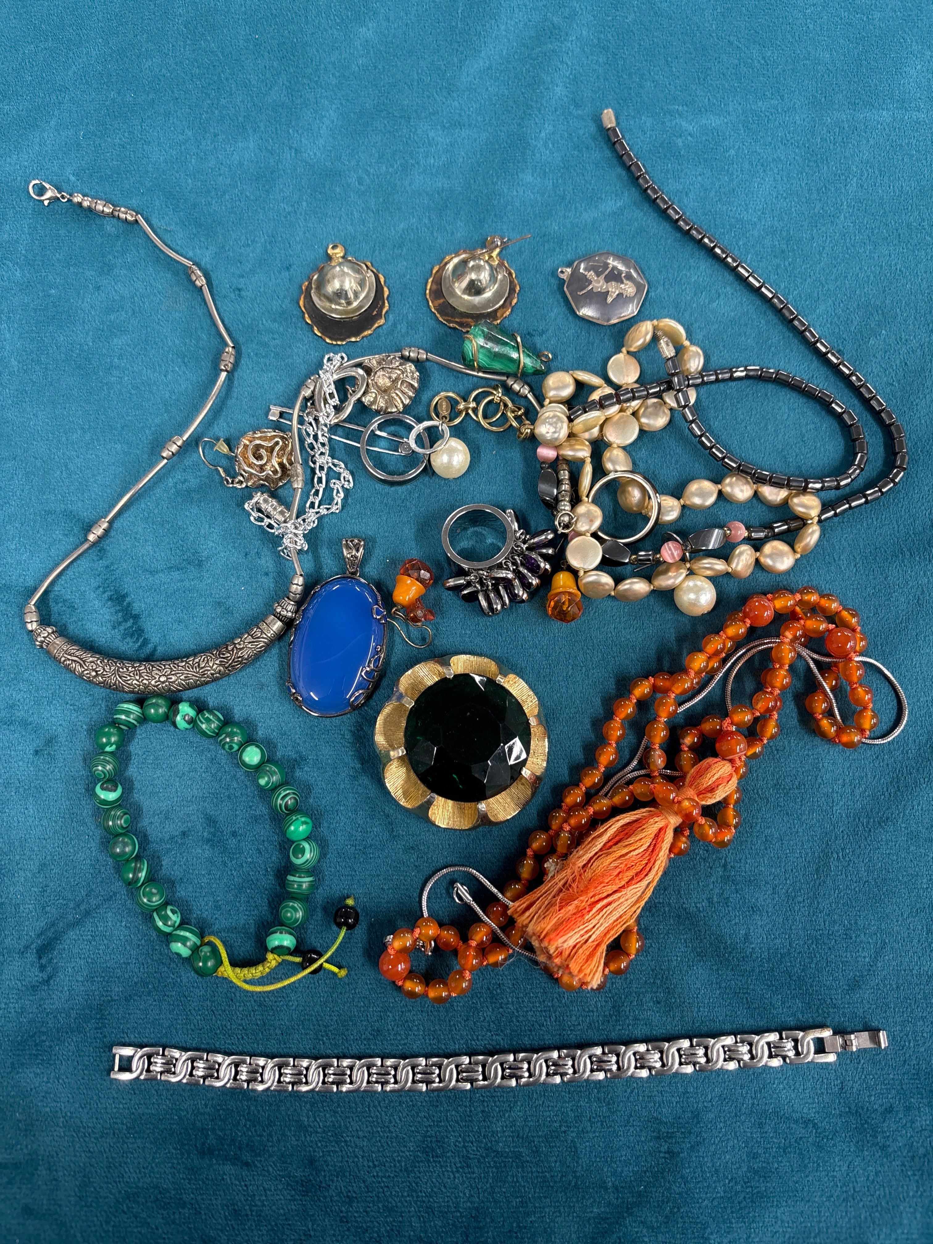 This collection comprises approximately two dozen pieces of assorted jewelry, presenting a mix of styles from contemporary to vintage. The group includes various necklaces, such as a silver-toned snake chain, a rectangular dark grey bead strand, multiple lengths of cream-hued faux pearls in varied shapes, and a long necklace featuring translucent orange beads with a coordinating tassel. Bracelets observed are a green malachite-like beaded piece and a silver-toned link bracelet. Further items consist of several rings, various silver-toned earrings (including dome-shaped and rose-motif designs), an oval blue cabochon pendant, two smaller faceted orange pendants, a wire-wrapped green stone pendant, and a notable round brooch set with a large, faceted dark green stone encircled by textured gold-toned metal. The collection is primarily costume jewelry, with some items potentially sterling silver. No visible text or hallmarks were identifiable.