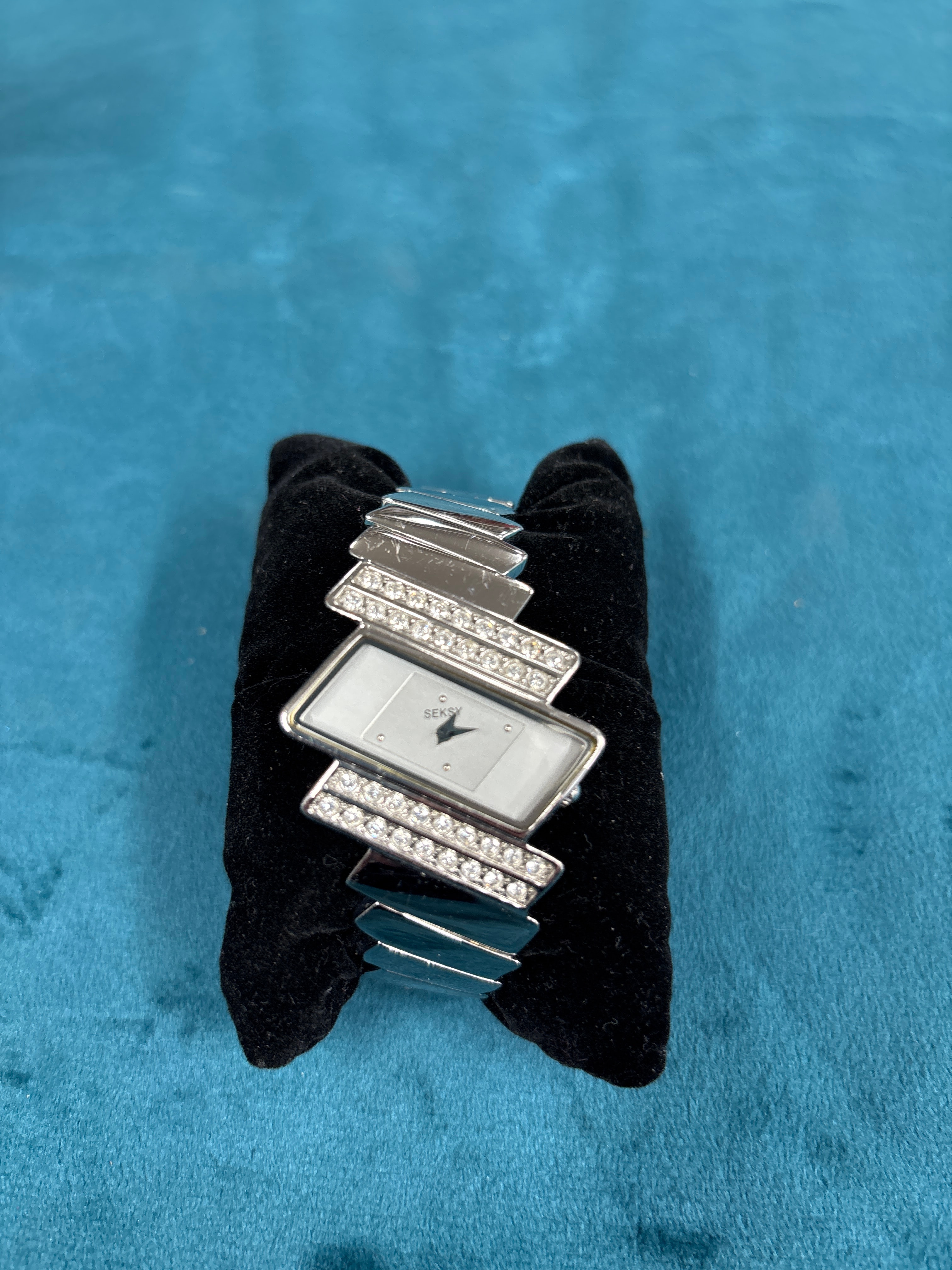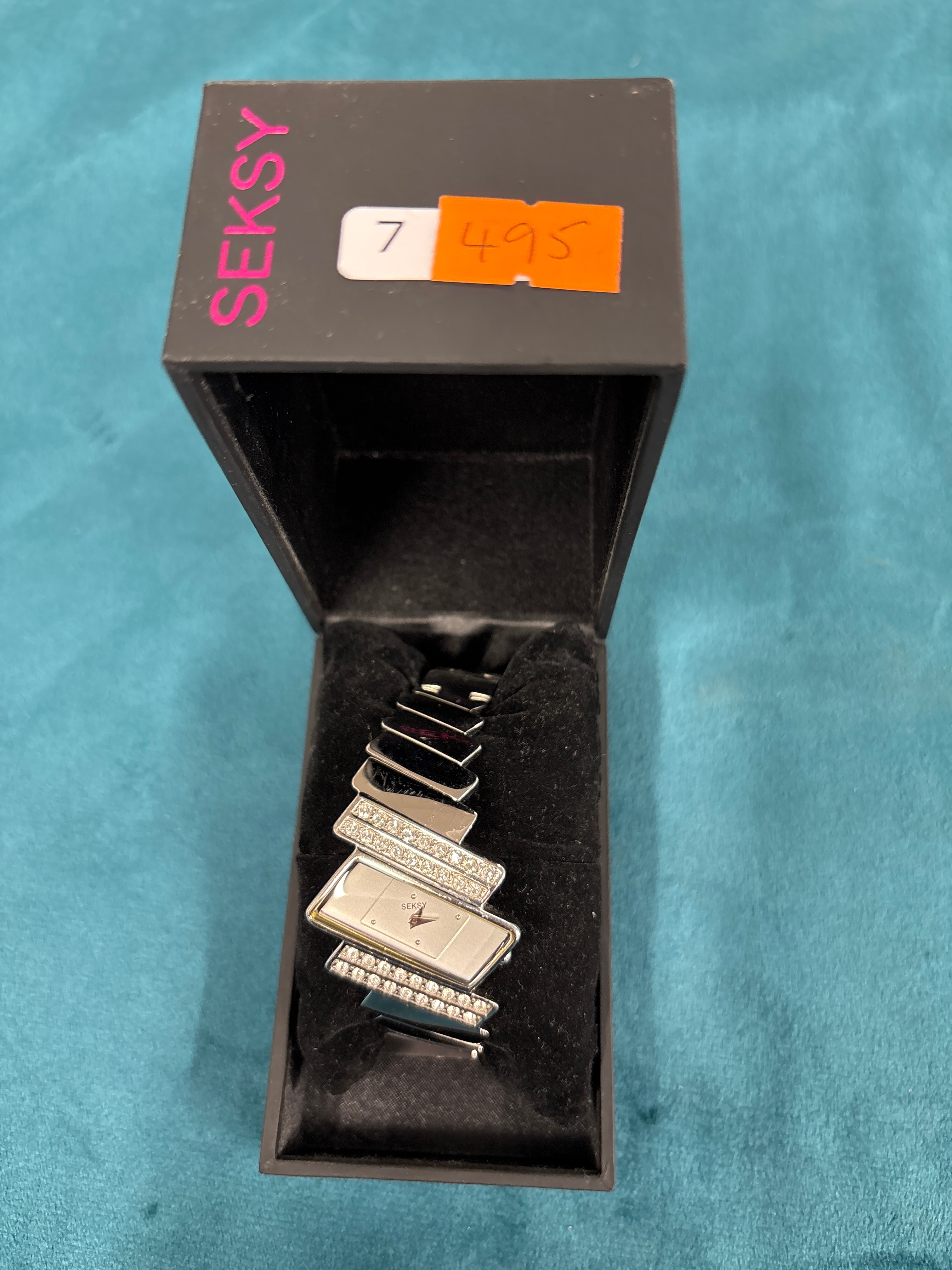 A SEKSY Ladies Electra Dress Watch, Model 4158. This modern women’s bracelet wristwatch features a rectangular, silver-tone metal case and a white dial with minimalist dot indices. The distinctive silver-tone metal band is composed of angular, interlocking links, two of which are embellished with rows of pave-set clear stones. The watch is presented within its original black branded box, which prominently displays the “SEKSY” logo vertically on its side and has an orange sticker on the lid marked “7 495.”