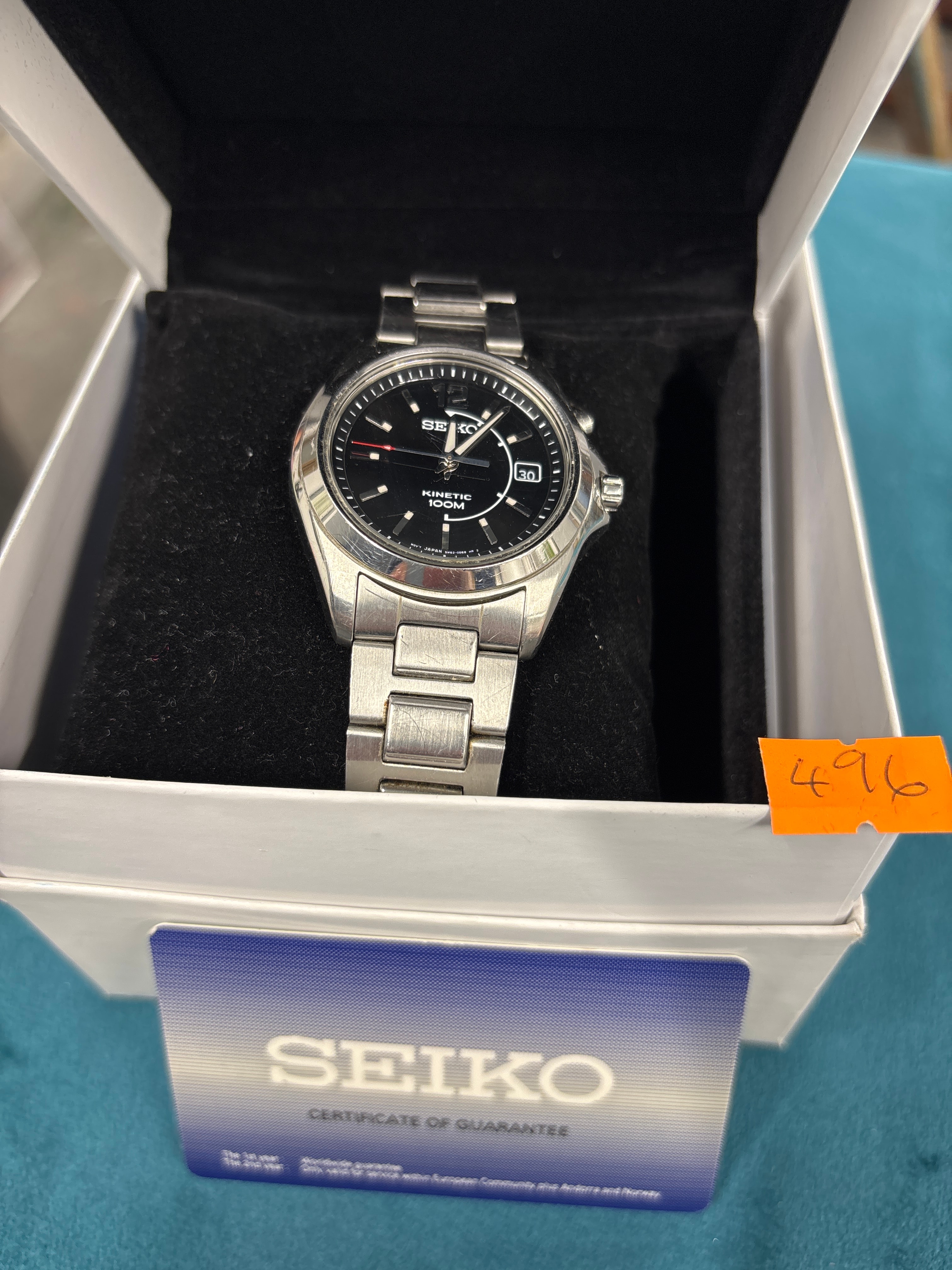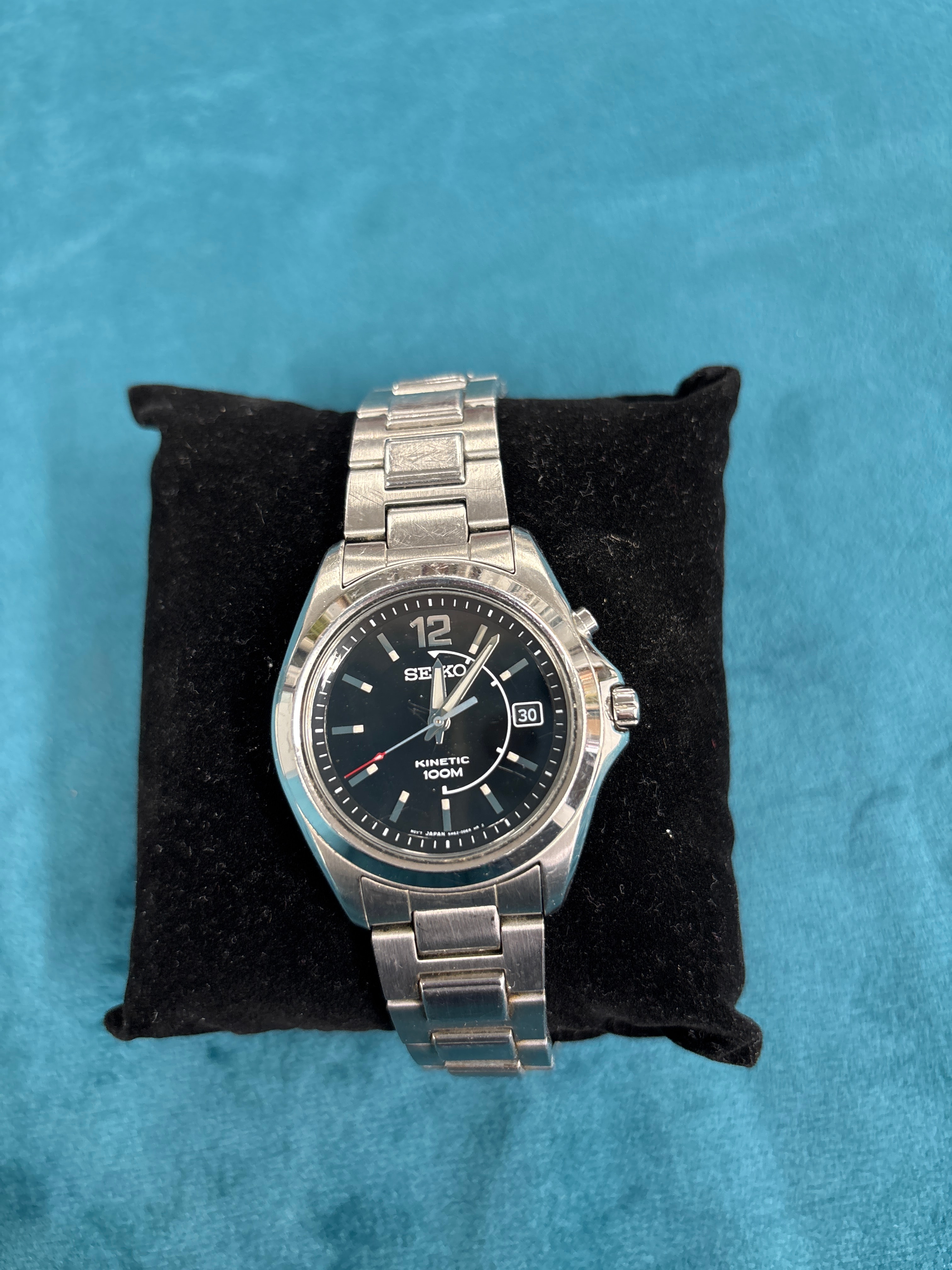 Lot 496: Seiko Men's SKA477 Stainless Steel Black Dial Kinetic Watch