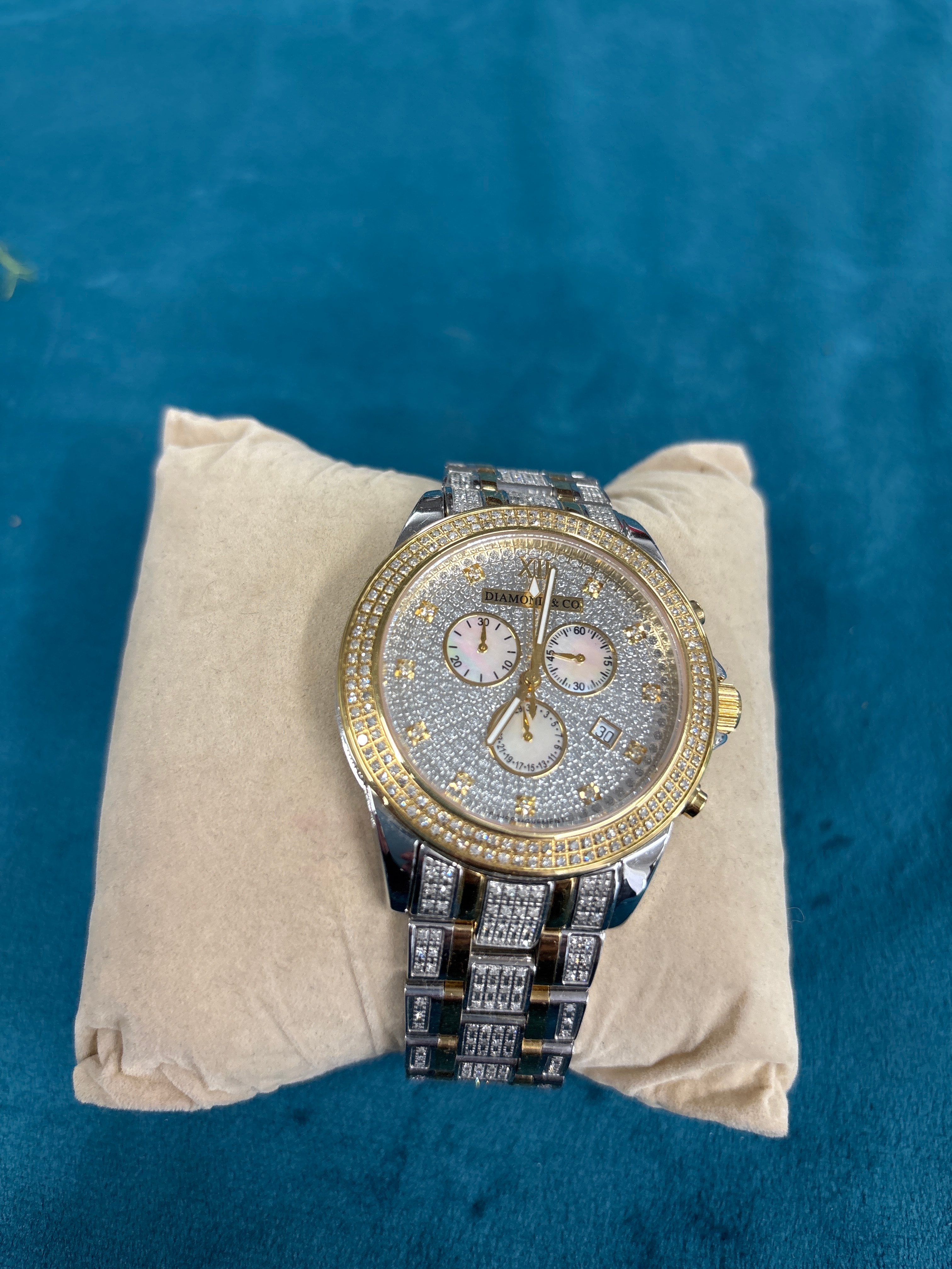 A men’s chronograph wristwatch by ‘DIAMONTI & CO.’, featuring a two-tone design of silver-tone and gold-tone metals. The round case, bezel, and multi-link bracelet are extensively set with numerous clear brilliant-cut simulated diamonds. The pave-set dial displays three white or mother-of-pearl-effect sub-dials, gold-tone hands, a Roman numeral XII at the 12 o’clock position, and a date aperture currently showing ’30.’ The dial is marked ‘DIAMONTI & CO.’ and ‘SWISS MOVT’.