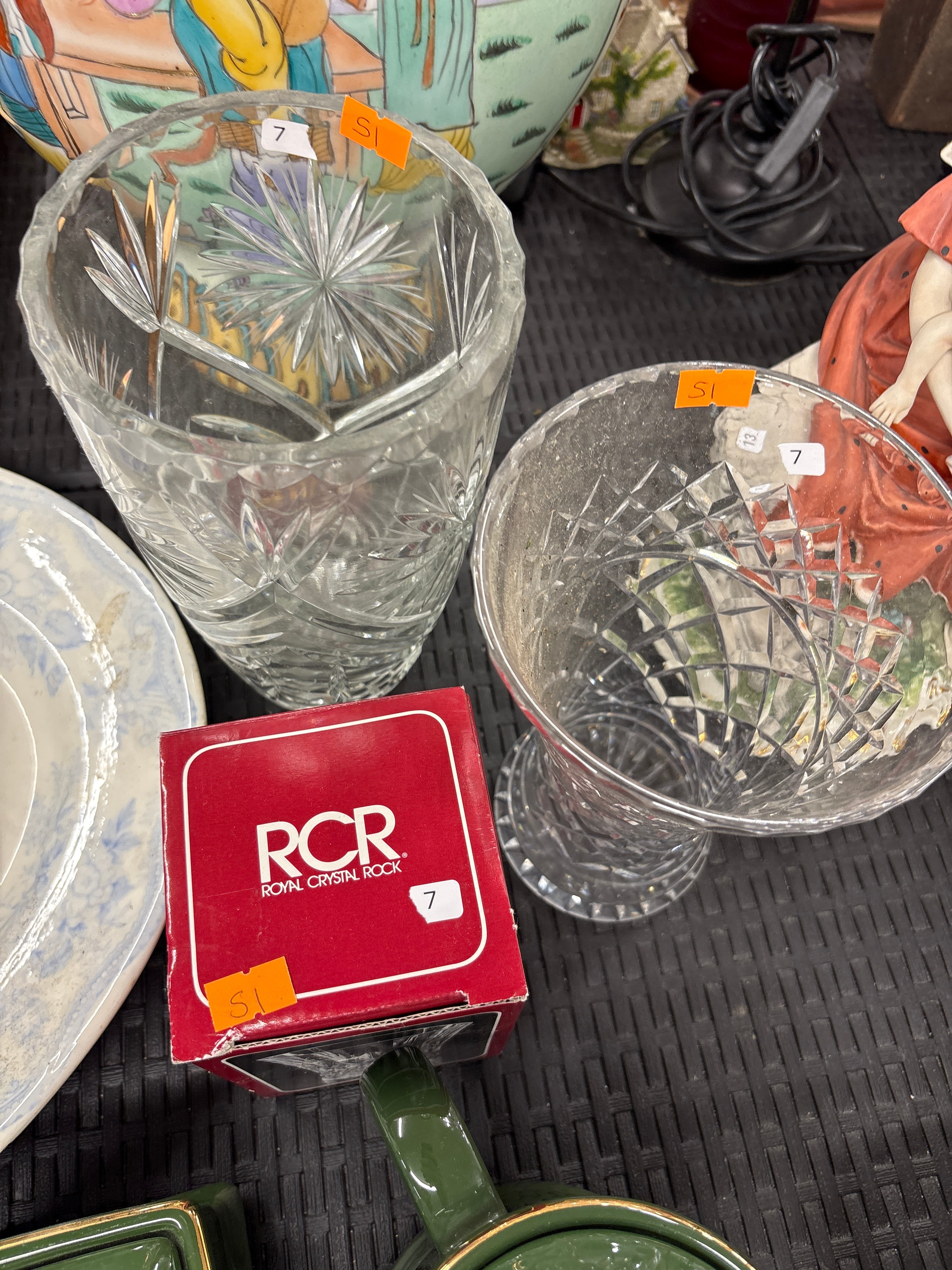 A pair of Royal Crystal Rock RCR 24% lead crystal vessels. Comprising a large, flared vase or bowl with elaborate geometric and starburst cutting patterns, accompanied by its original red retail box marked ‘RCR ROYAL CRYSTAL ROCK’. And a footed stemmed vessel, possibly a compote or large goblet, featuring similar geometric and starburst cutting. Both items bear orange ‘S I’ stickers and white numbered stickers (‘7’ on the vase/box, ‘7’ and ’13’ on the footed vessel), suggesting they are part of an inventory.