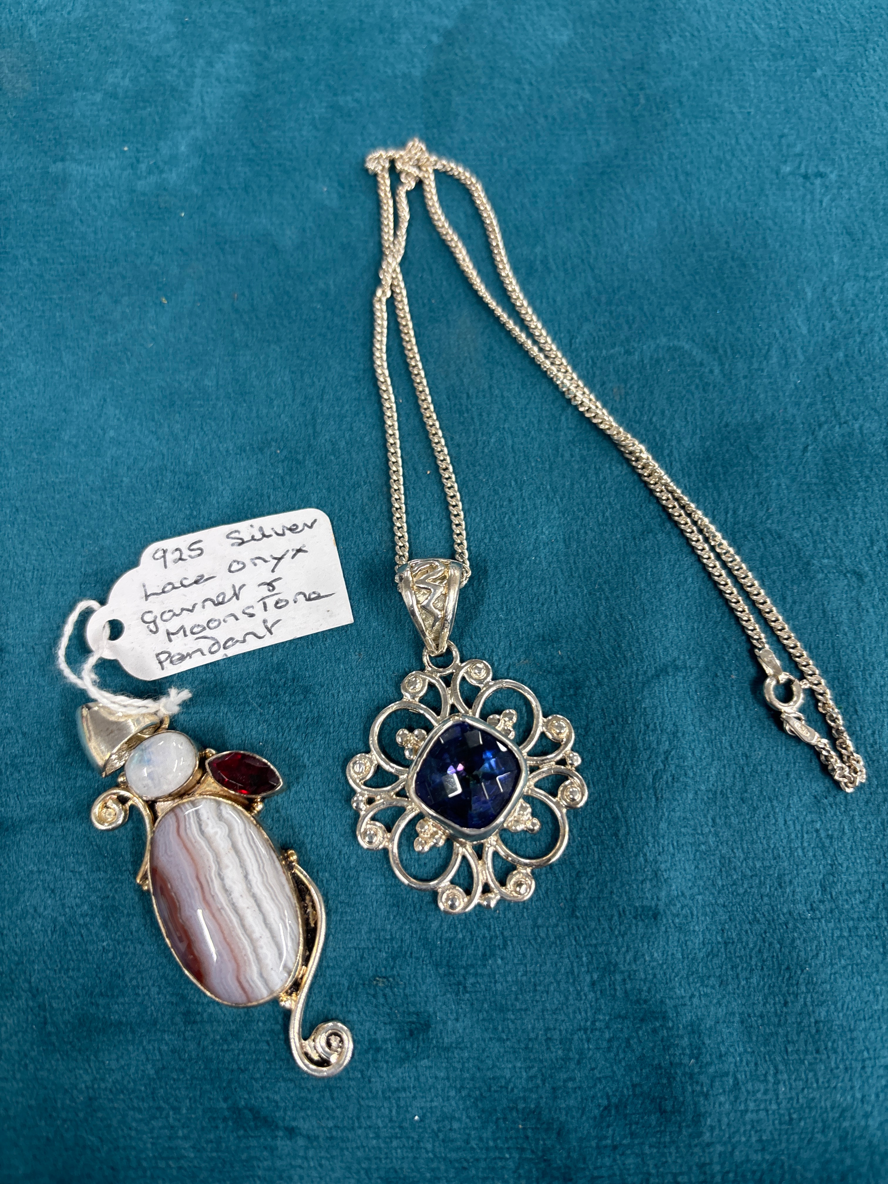 A Sterling Silver Lab-Created Blue and White Sapphire Necklace, featuring a silver-toned curb link chain supporting an ornate, filigree-style pendant with a central cushion-cut dark blue faceted stone surrounded by smaller clear accent stones. Also included is a 925 Silver Lace onyx, Garnet & Moonstone Pendant. This pendant showcases a prominent oval banded cabochon stone, an oval moonstone cabochon displaying adularescence, and a faceted oval dark red garnet, set in a combination of silver-toned and gold-toned metal.