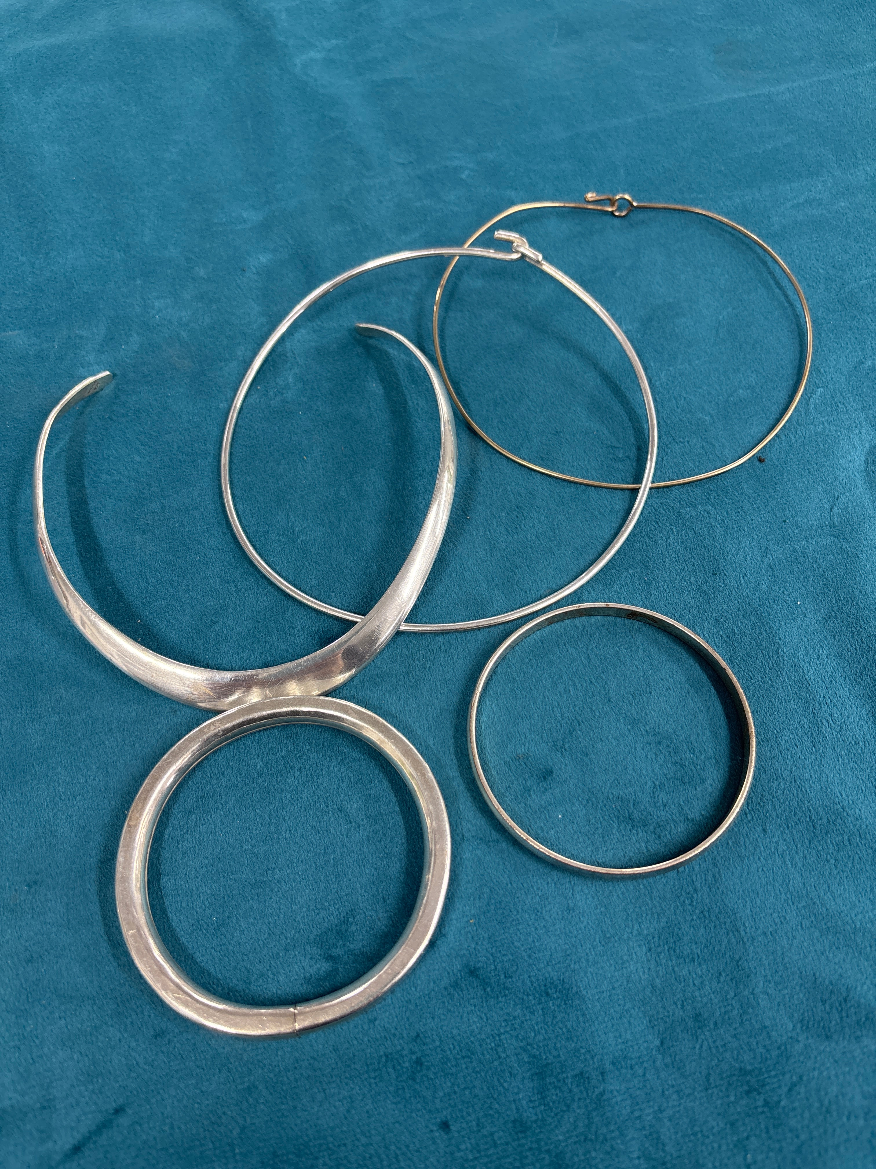 A collection of five pieces of jewelry, including an open-ended silver-toned metal choker or torque, two solid silver-toned metal bangles of differing thickness, one thin circular silver-toned metal hoop with a simple clasp, and one thin circular gold-toned metal hoop with a hook clasp. The style is uniformly simple and unadorned. A faint, illegible marking appears on the interior surface of the silver-toned choker.
