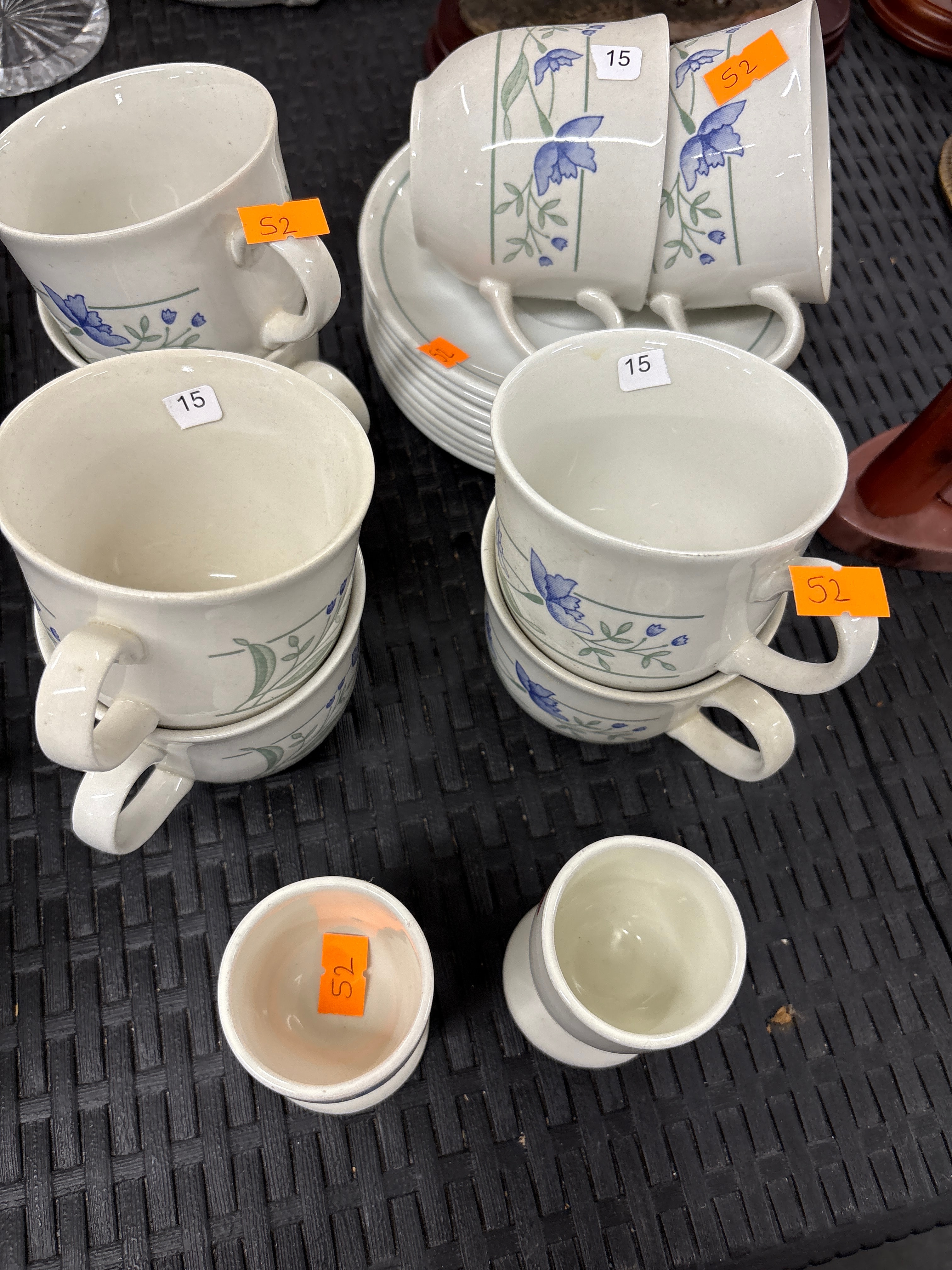 A collection of Staffordshire Tableware Blue Flower stoneware, comprising at least eight cups with C-handles and a stack of four matching saucers. The pieces are decorated with a casual blue floral and green foliage motif, interspersed with vertical green stripes. Also present are two smaller, single-handled mugs or cups, and one small plain cup, all in a similar off-white, speckled stoneware material. Price stickers displaying “15” and “52” are affixed to several items.