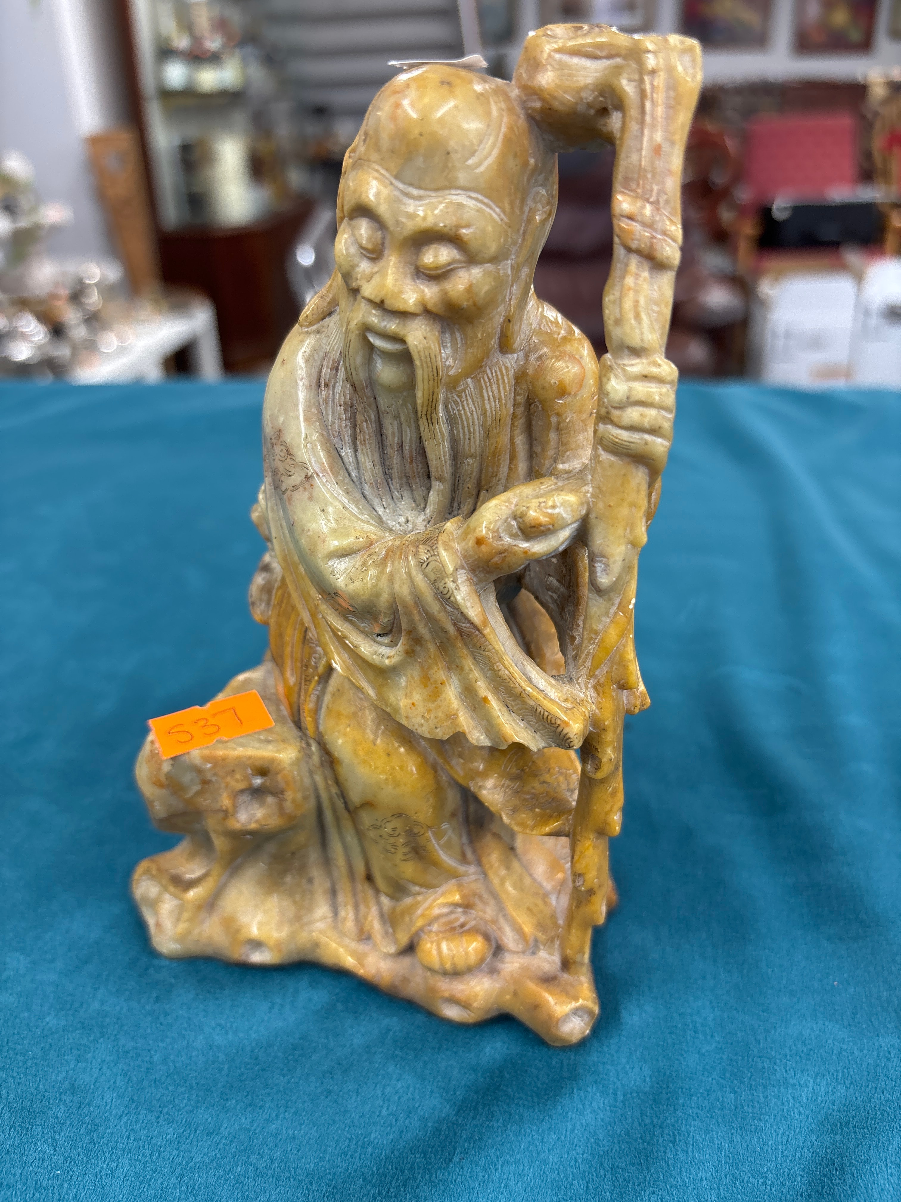 A Chinese soapstone figure of Shou Lao, dating to the early 20th century. The carved stone figurine depicts an East Asian-style elderly male figure or sage, shown wearing flowing robes, with a long beard and hair tied up, holding a gnarled staff that resembles bamboo. The material displays a variegated yellowish-brown to cream coloration with natural veining and inclusions throughout. An orange sticker with the numbers “537” is affixed to the front of the base, and faint, indistinct carved markings are visible on the lower front of the figure’s robe.
