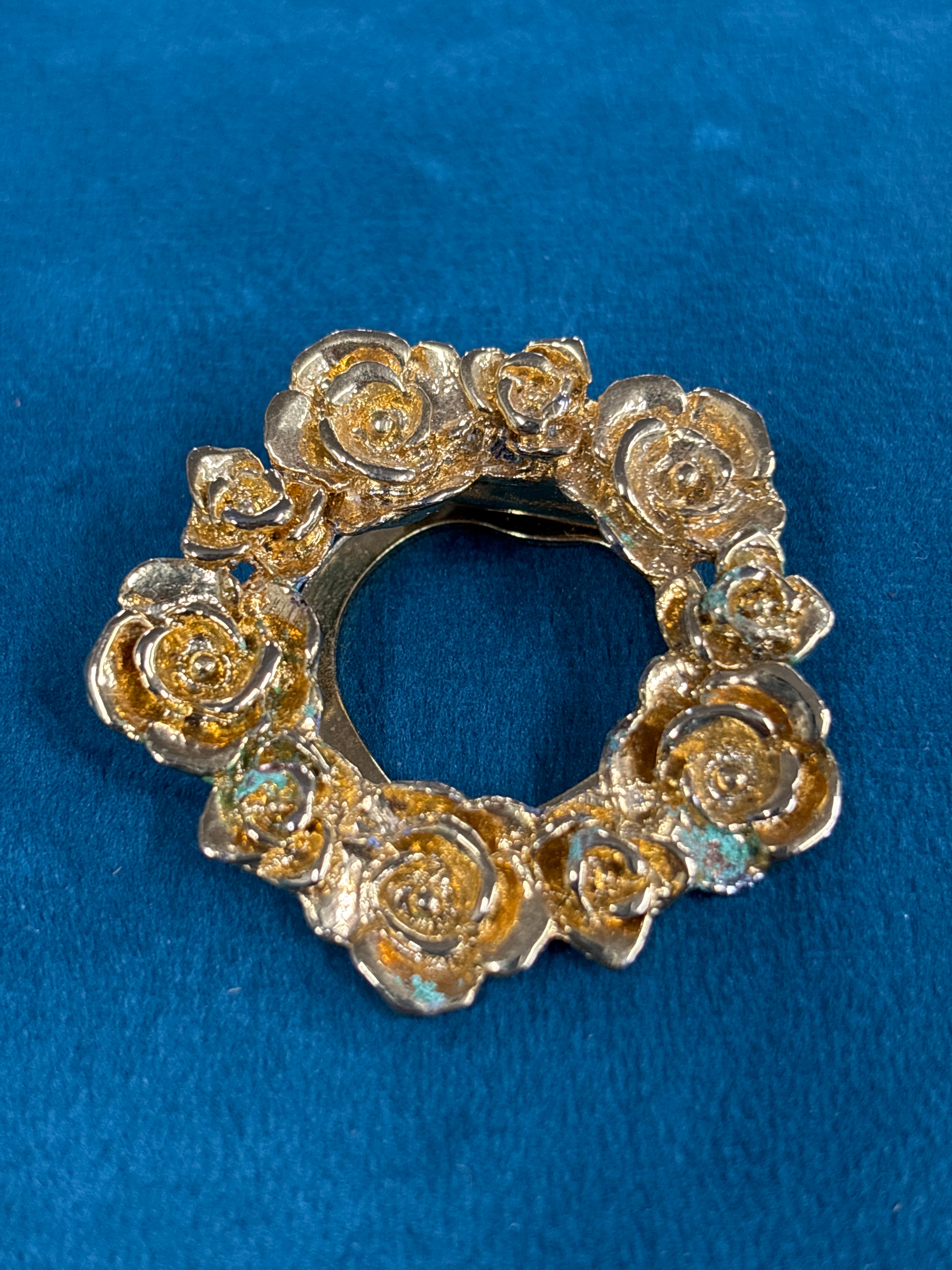 A Monet Rose Wreath Brooch Pin. This circular, gold-tone metal accessory is designed as a wreath of stylized roses. The intricate floral motifs feature detailed petals and central swirls, rendered in a three-dimensional fashion. The material appears to be a plated base metal.